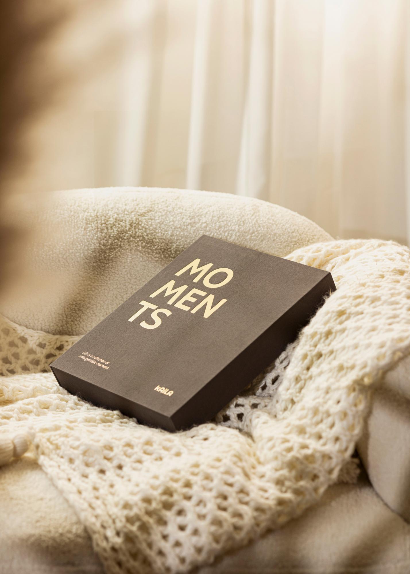 Albumul foto este proiectat ca o cutie pe care o poți deschide pentru a accesa imaginile tale. Coperta este decorată în textil negru, ceea ce conferă o senzație luxoasă. Pe față și pe partea scurtă se află textul „MOMENTS”. În colțul stâng de pe partea de sus apare frumosul subtitlu „Viața este o colecție de momente de neuitat”.