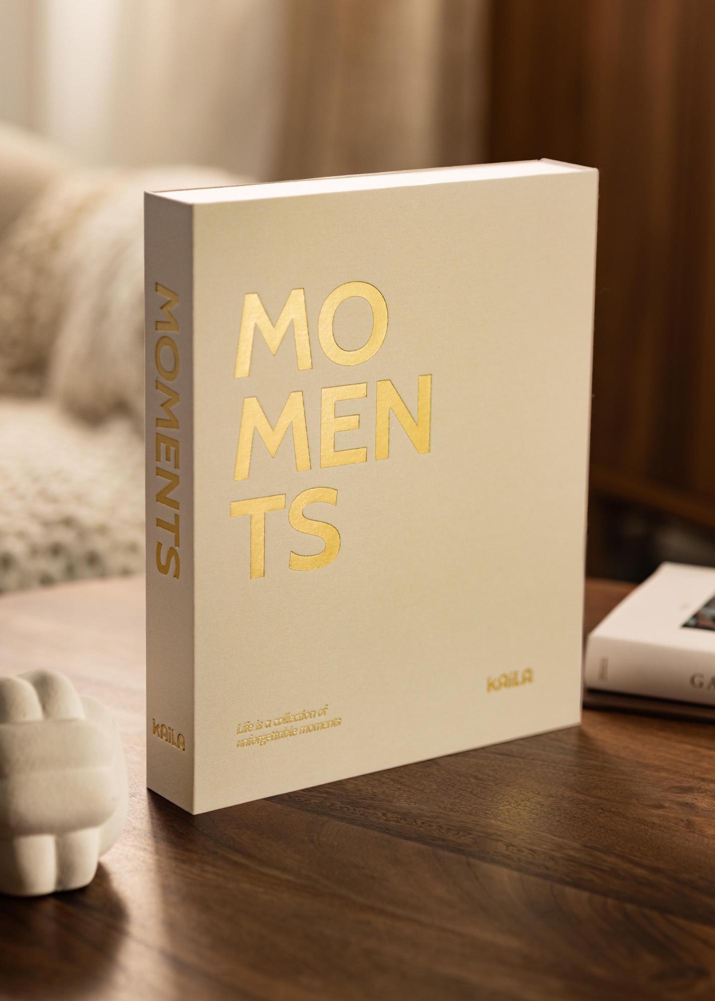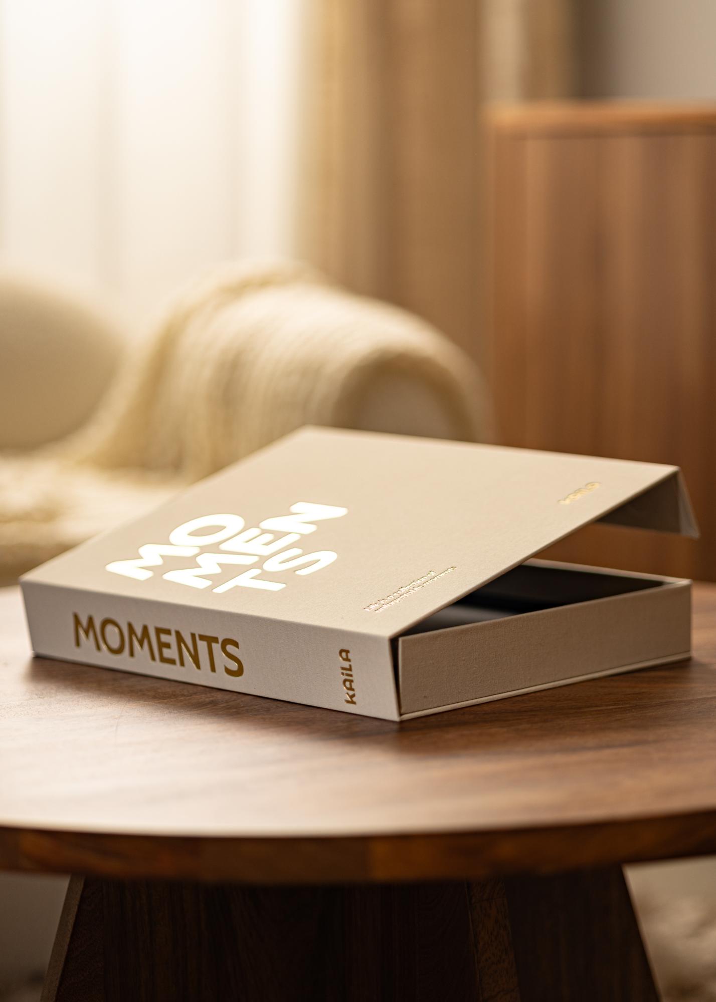 Albumul foto este proiectat ca o cutie pe care o poți deschide pentru a accesa fotografiile tale. Coperta este îmbrăcată în material textil de culoare crem, oferind o senzație de lux. Pe partea din față și pe partea laterală scurtă se află textul ”MOMENTS”. În colțul din stânga sus se observă subtitlul frumos „Viața este o colecție de momente de neuitat”.