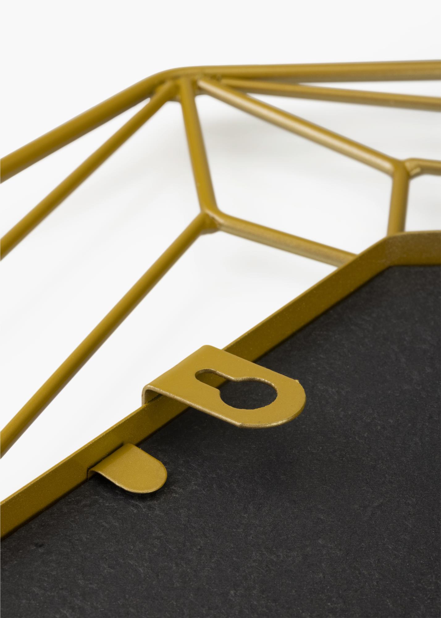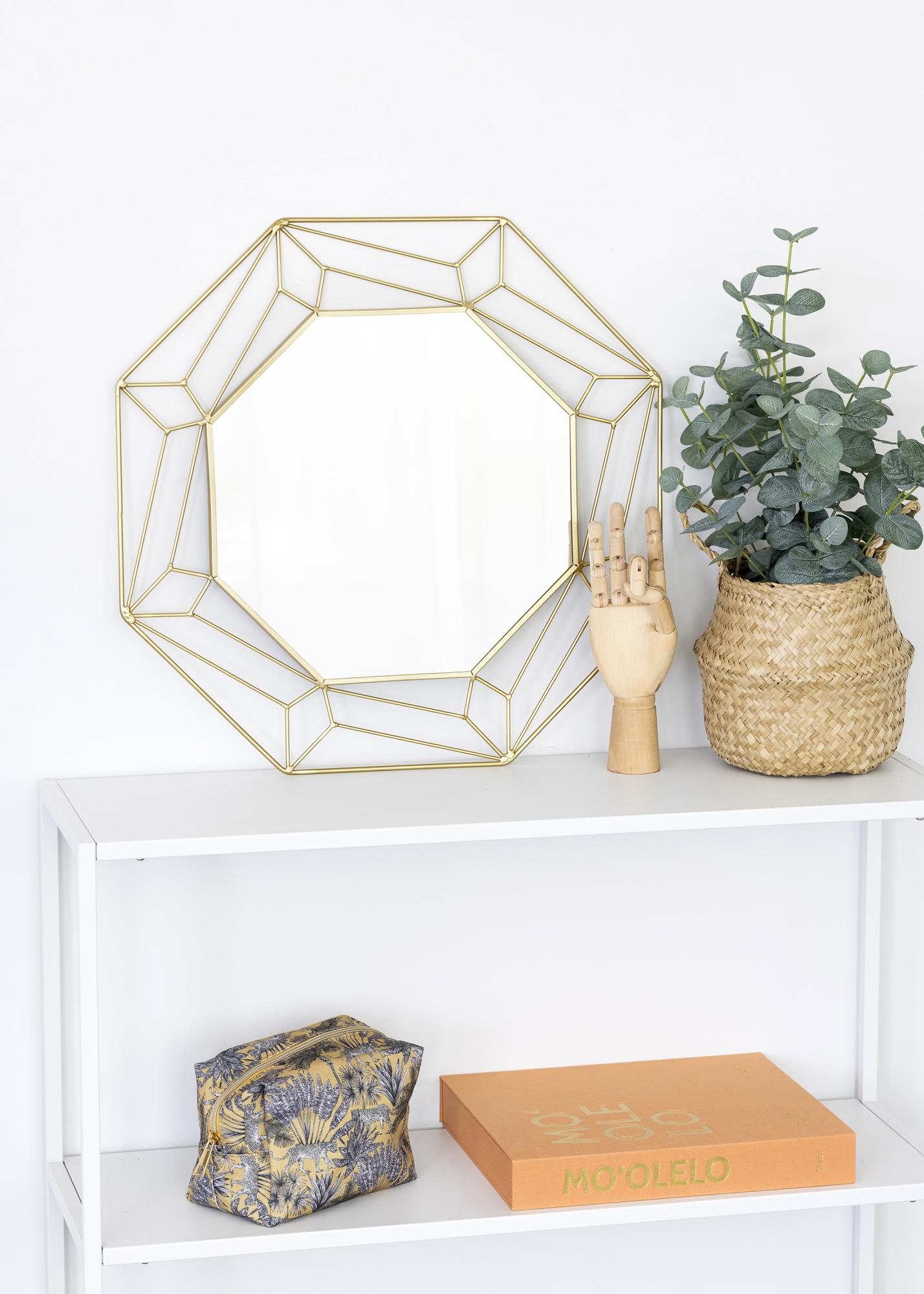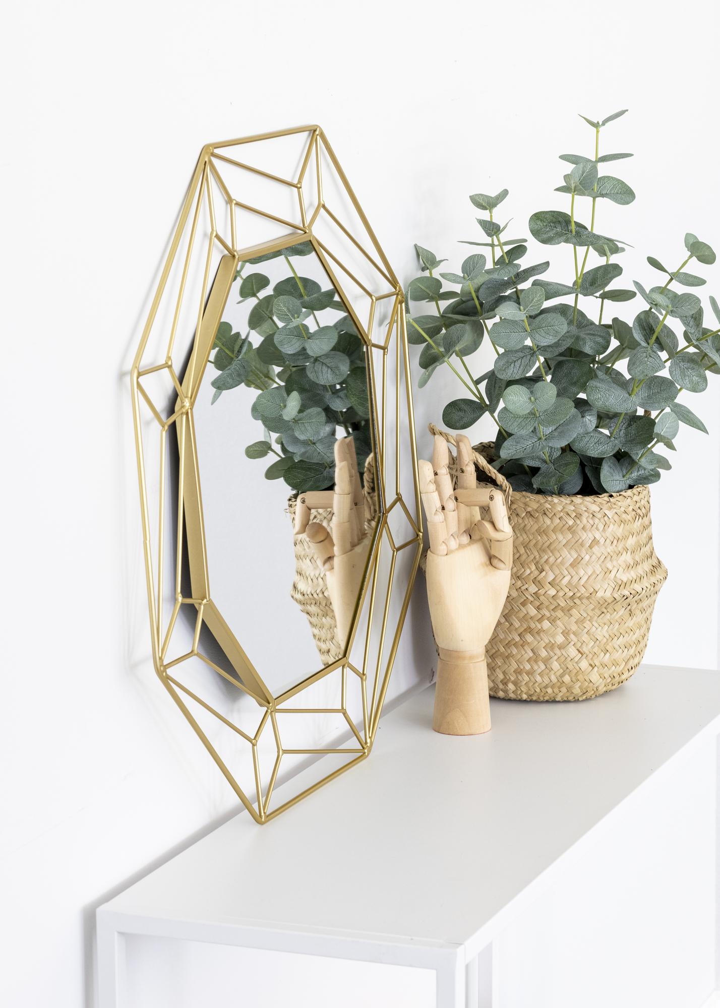 Aceasta este o oglindă cu un design abstract elegant de la KAILA! În jurul suprafeței hexagonale a oglinzii din mijloc, se află o margine realizată din metal vopsit în alamă, care formează un model atrăgător. Nuanța aurie oferă acestei oglinzi un aspect luxos, fiind astfel ideală pentru cei care doresc un cămin decorat cu stil și eleganță! Oglinda măsoară 50x50 cm și este fabricată din metal. Pe partea din spate a oglinzii sunt monturi de prindere pentru perete.