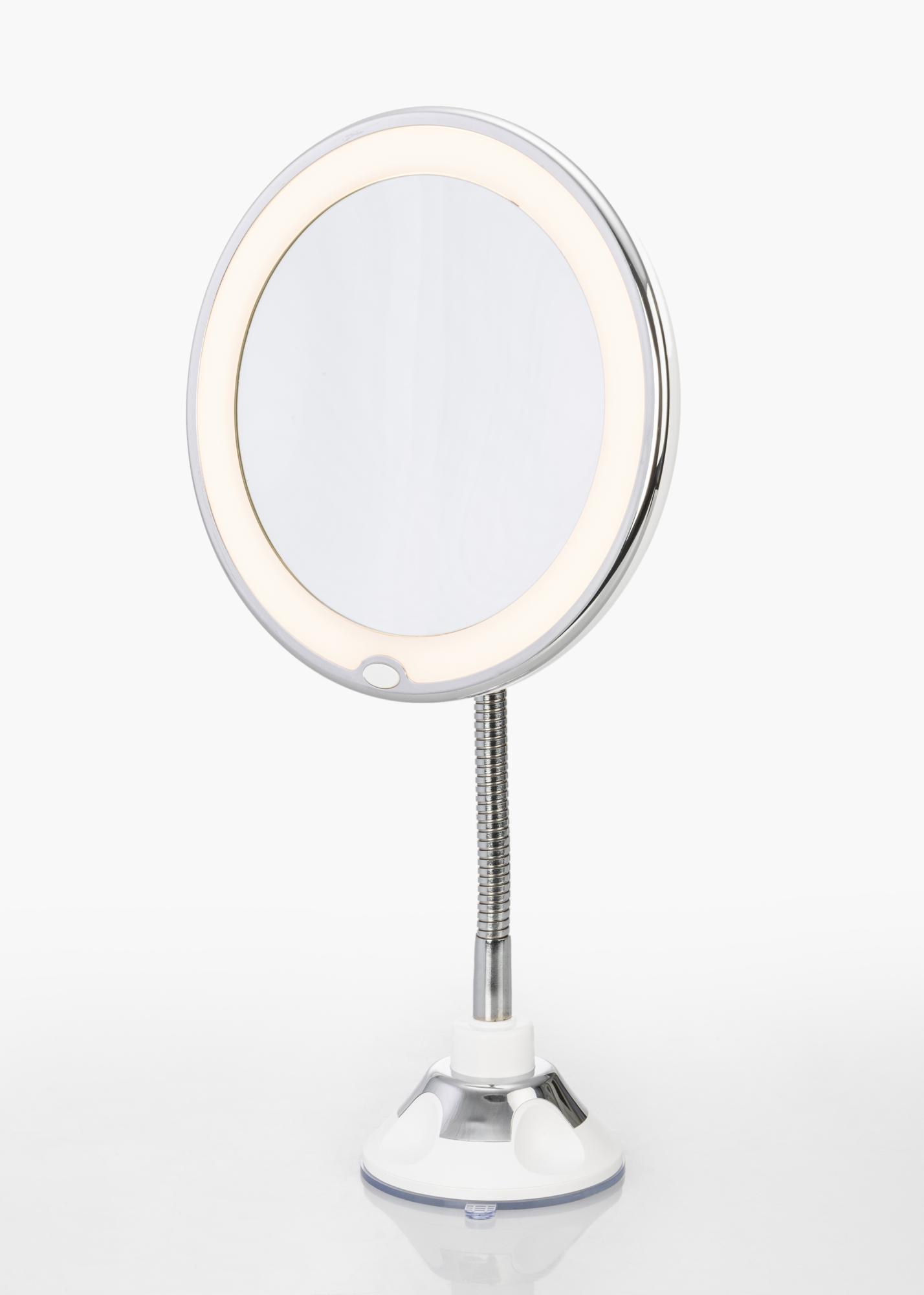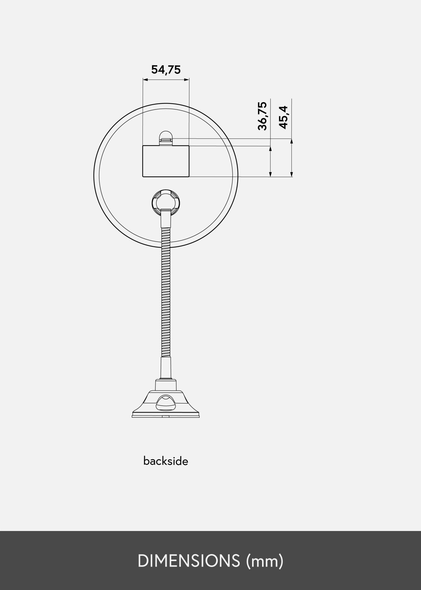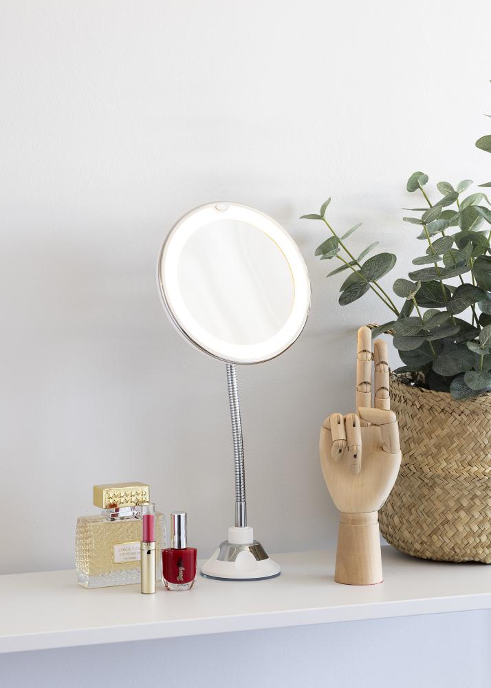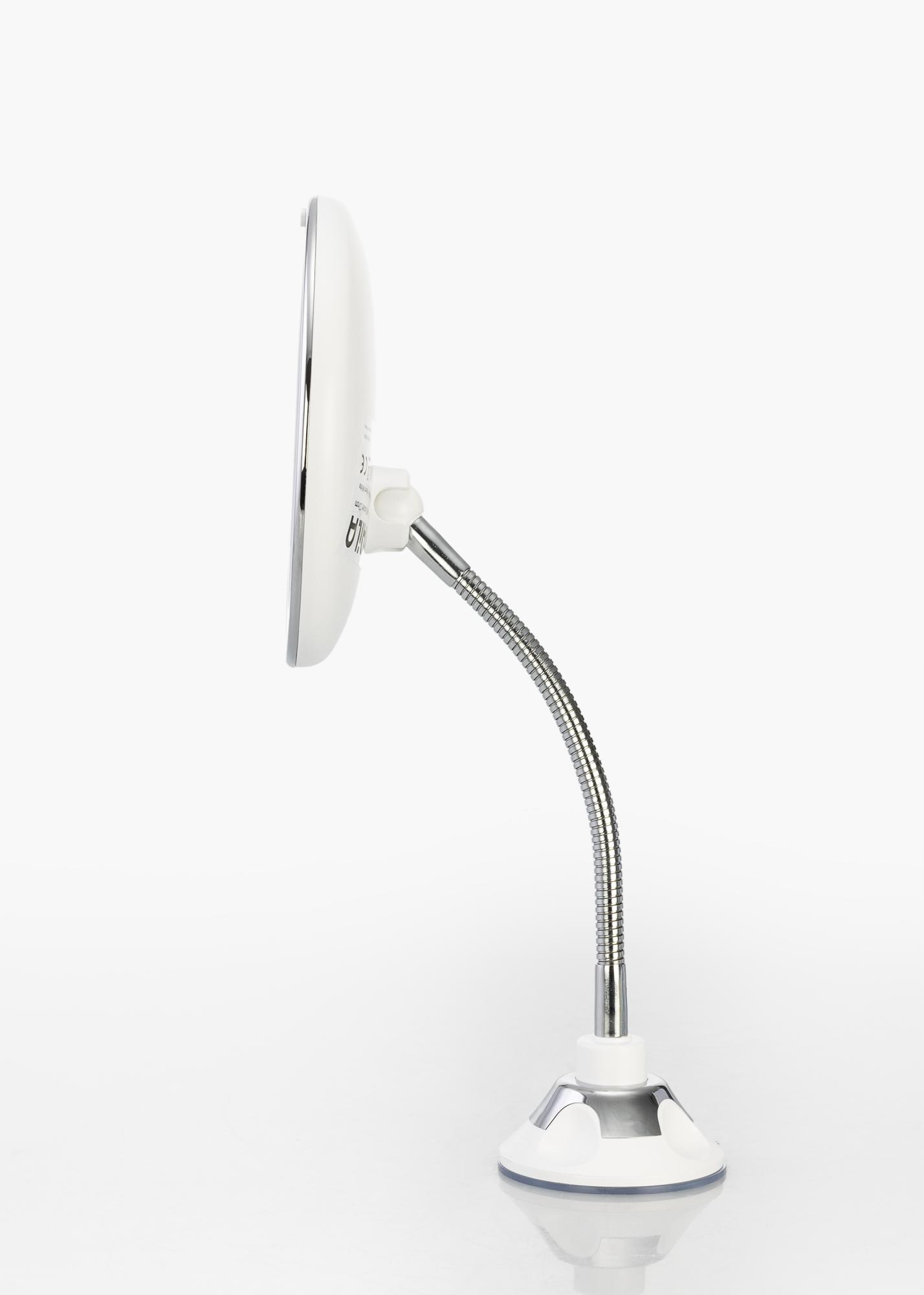 Piciorul aferent oglinzii este mobil, ceea ce înseamnă că poți înclina oglinda în unghiul dorit. Oglinda este aprobată pentru băi. Oglinda este fixată cu ventuza aferentă pe perete, faianță sau masă. Ventuza este blocabilă și face ca oglinda să stea stabil. Livrată nemontată.