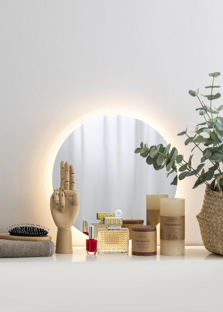 Aceasta este o oglindă de baie rotundă, clasică și elegantă. Oglinda este încadrată de o margine mată cu iluminare LED integrată. Iluminarea este aprinsă în spatele oglinzii și oferă o lumină caldă și plăcută de 3000K. Iluminarea este reglabilă și puteți ajusta ușor intensitatea iluminării ținând apăsat butonul pentru câteva secunde. Data viitoare când aprindeți lumina, oglinda va memora intensitatea la care a fost setată. Oglinda vine cu suporturi de perete incluse și este aprobată pentru baie. Oglinda de baie este destinată instalării permanente și se conectează la un comutator. Pentru ca oglinda să funcționeze corect, trebuie conectată la un comutator standard, nu la un comutator cu variator.