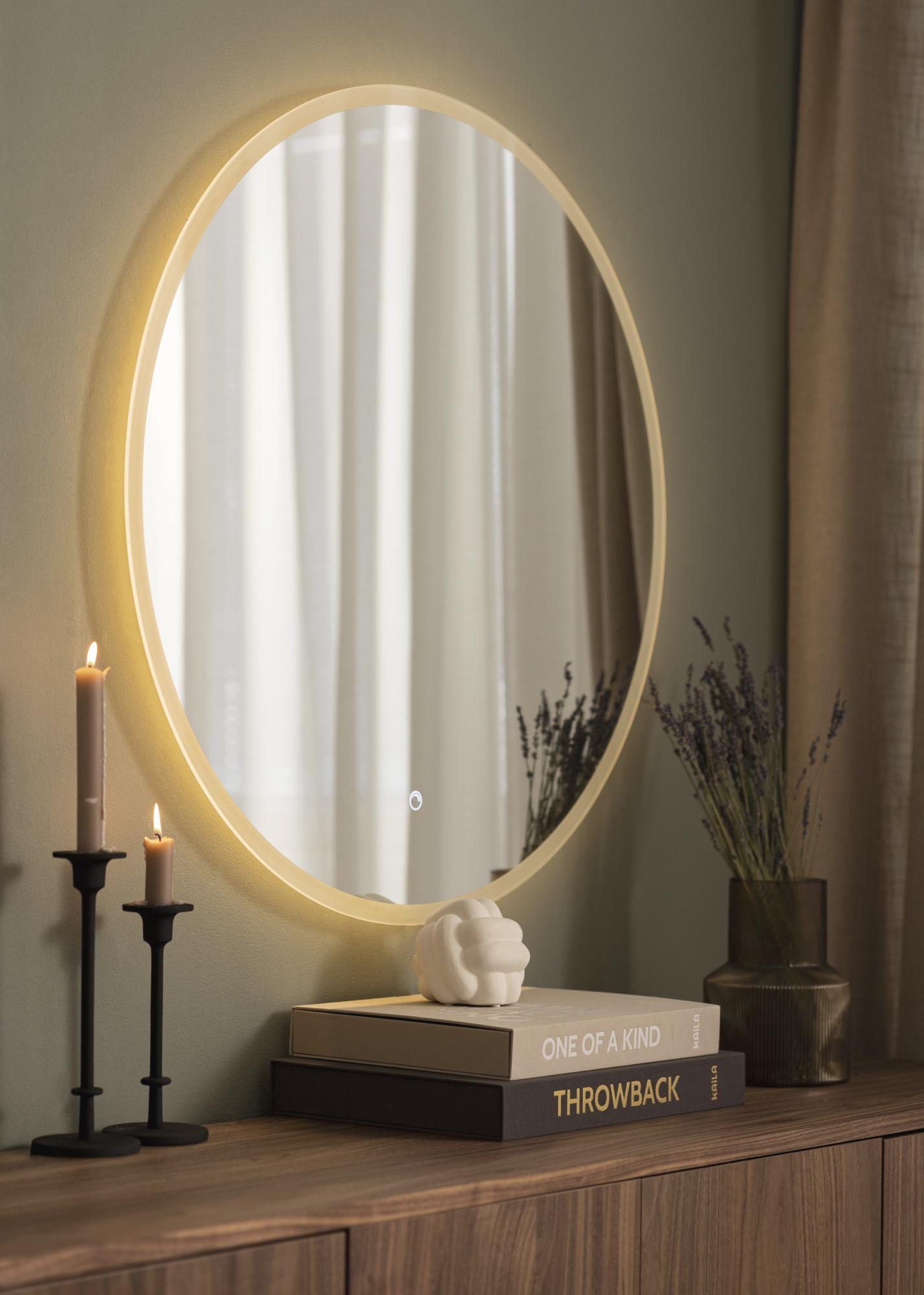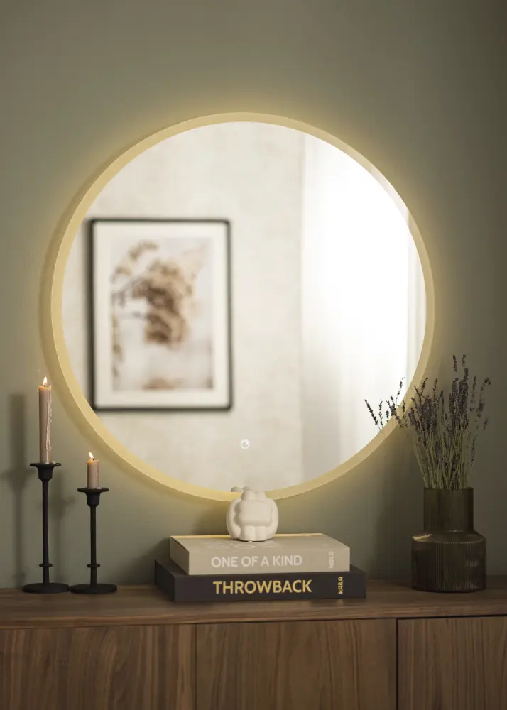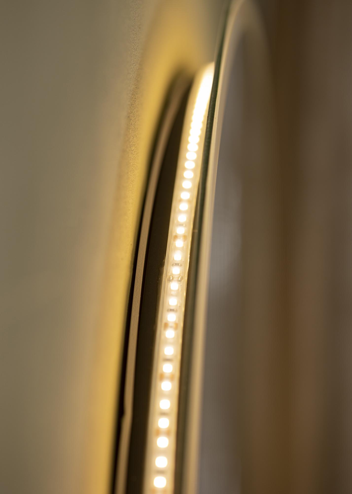 Aceasta este o oglindă de baie clasică și elegantă, rotundă. Oglinda este încadrată de un contur mat cu iluminare LED integrată. Iluminarea se aprinde în spatele oglinzii și oferă o lumină plăcută alb-calduros în față, la 3000K. Iluminarea este reglabilă și poți ajusta ușor intensitatea luminii prin menținerea apăsată a butonului pentru câteva secunde. Data viitoare când aprinzi lumina, oglinda își amintește ce intensitate de lumină a fost setată. Oglinda vine cu suporturi de perete aferente și este aprobată pentru baie. Oglinda de baie este destinată instalării fixe și se conectează la un întrerupător. Pentru ca oglinda să funcționeze corect, trebuie conectată la un întrerupător obișnuit, nu la un întrerupător cu dimmer.