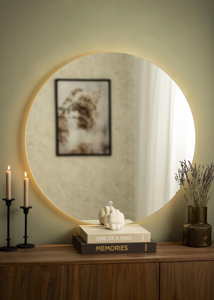 Aceasta este o oglindă clasică de baie în formă rotundă de la KAILA, un brand suedez. Oglinda de baie are iluminare LED cu intensitate reglabilă integrată în jurul său, care luminează din spate și oferă o lumină albă caldă către înainte la 3000K. Iluminarea este reglabilă și poți ajusta cu ușurință intensitatea luminii ținând apăsat butonul câteva secunde. Data viitoare când pornești iluminarea, oglinda va ține minte la ce intensitate era setată. LED-ul este o sursă de iluminat eficientă energetic care oferă o lumină uniformă și naturală.