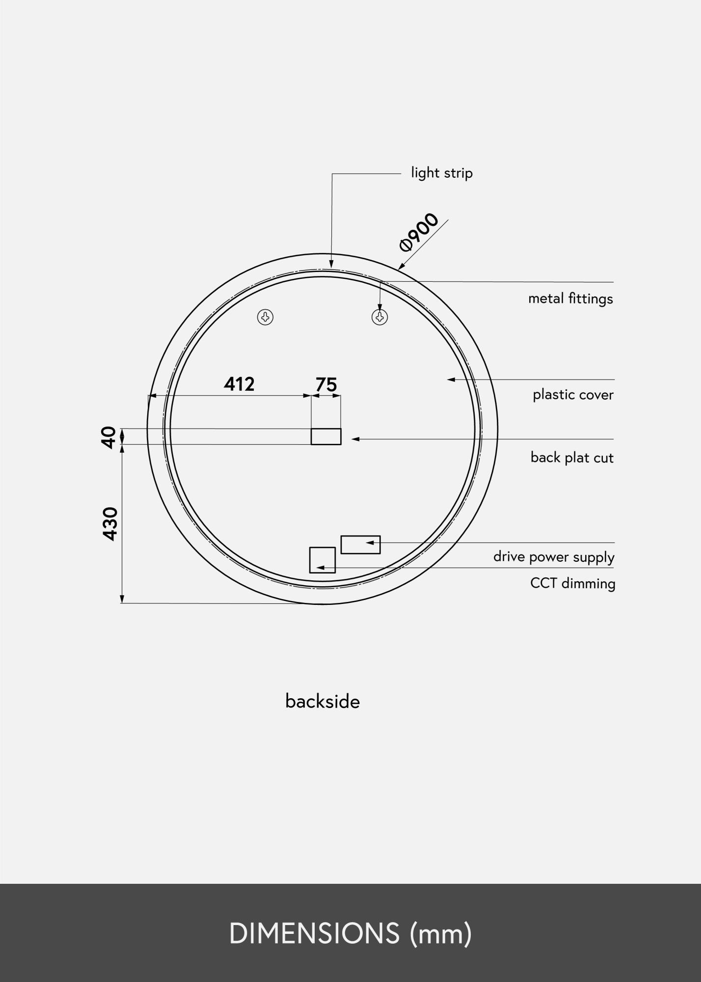 Oglinda este aprobată pentru baie, dar designul său atemporal și elegant se potrivește frumos și pe alte pereți din casă. Oglinda măsoară 90 cm în diametru, are doar 3 cm adâncime și este echipată cu suporturi de perete. Oglinda este destinată instalării fixe și se conectează la un întrerupător. Pentru ca oglinda să funcționeze corect, trebuie conectată la un întrerupător obișnuit, nu la un întrerupător cu variator.