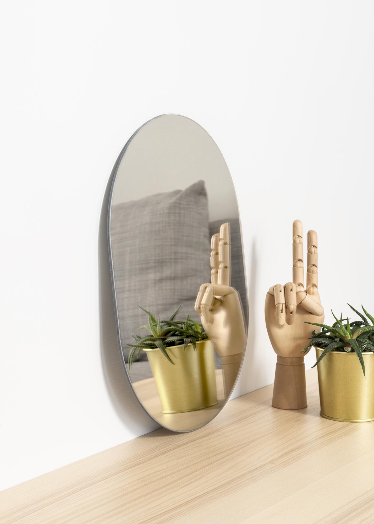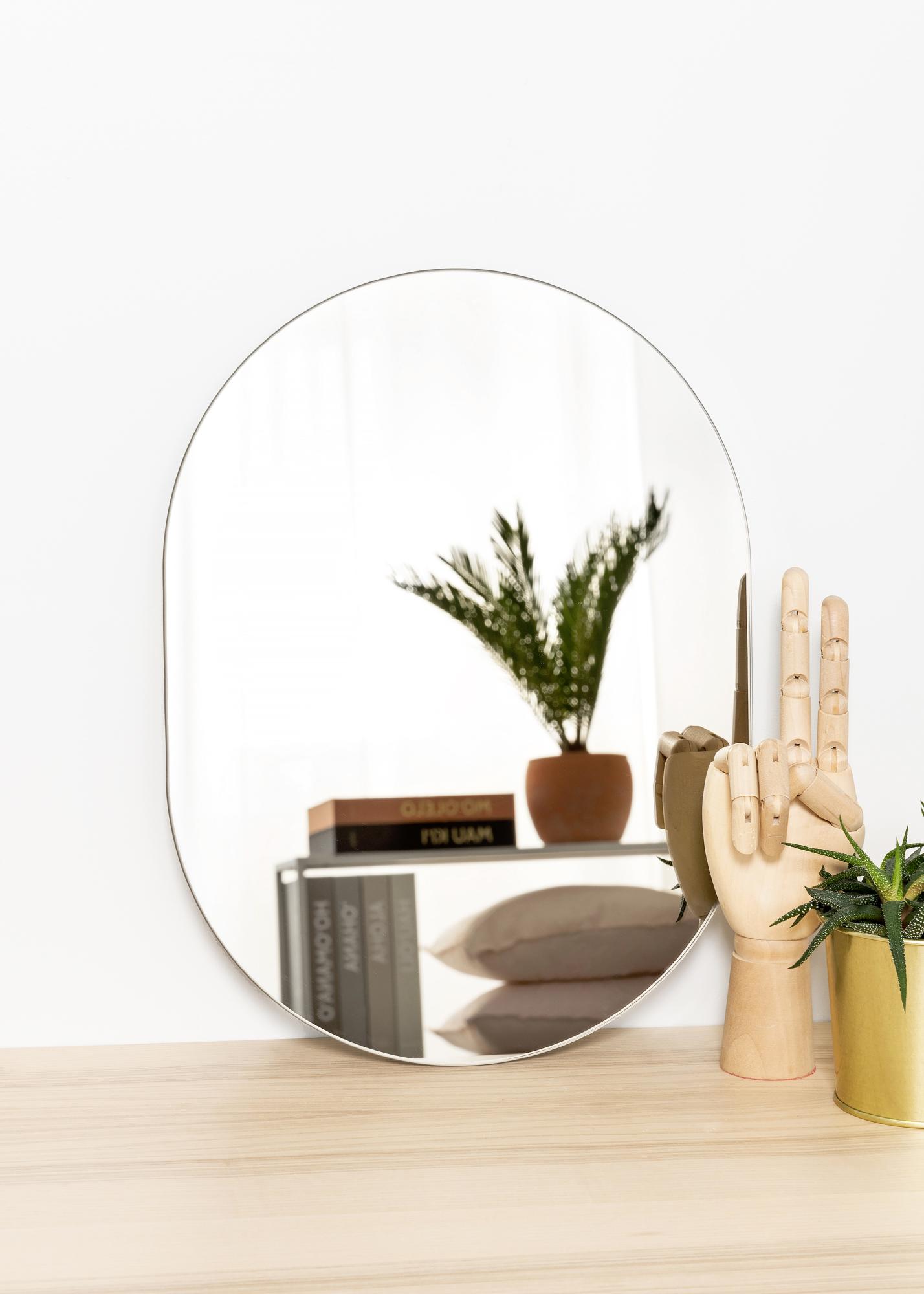 Oglinda ovală are aceleași dimensiuni practice ca și o oglindă dreptunghiulară, dar are totuși aceeași eleganță ca și o oglindă rotundă – o formă de oglindă absolut excelentă, cu alte cuvinte! Această oglindă ovală este, de asemenea, foarte subțire și nu are ramă, ceea ce accentuează și mai mult aspectul elegant.