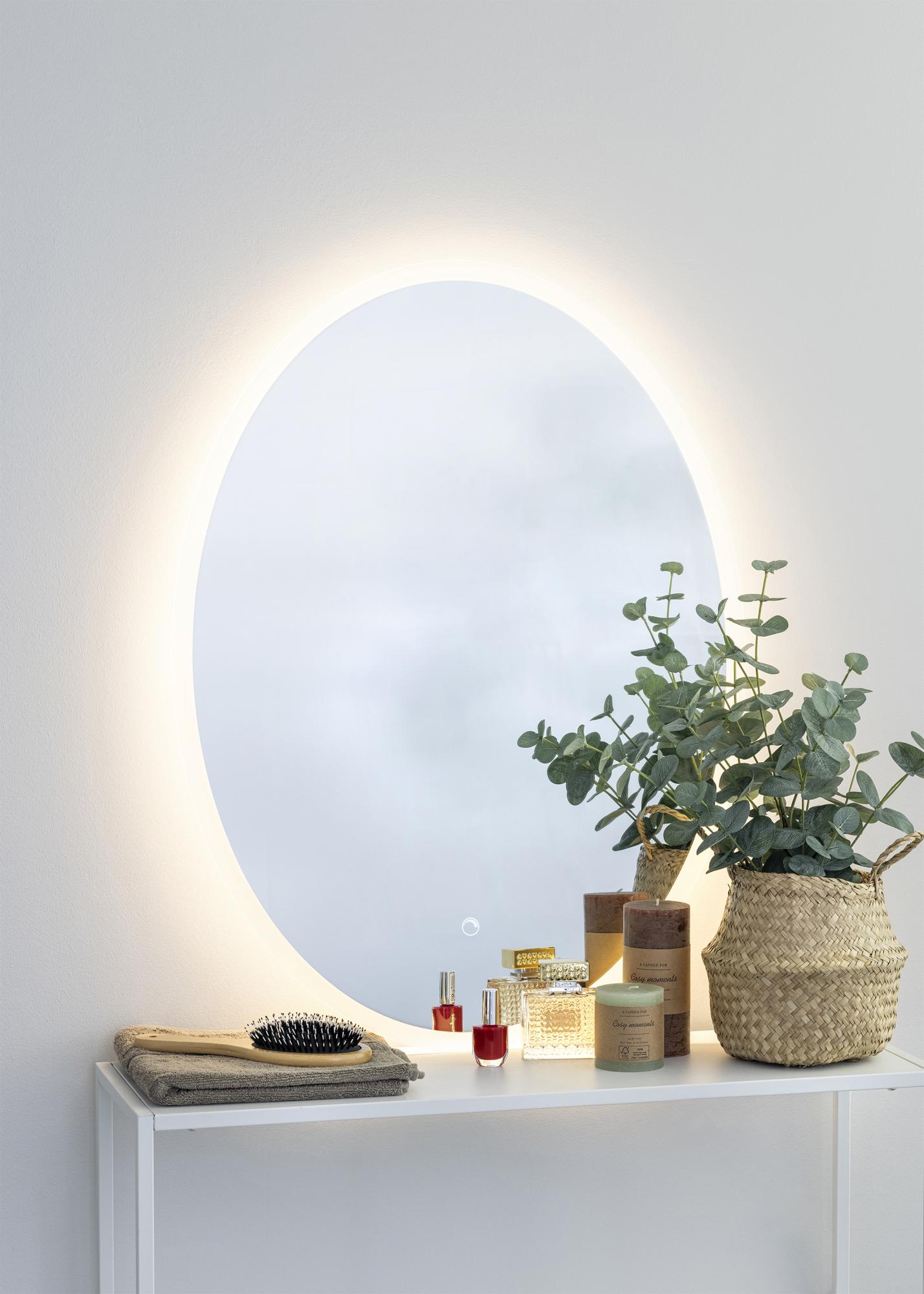 Aceasta este cu adevărat o oglindă de baie cu un design elegant, cu forma sa ovală și iluminarea LED integrată! Iluminarea LED integrată este reglabilă, iar intensitatea se ajustează ușor prin atingerea butonului tactil impermeabil de pe ecran. Iluminarea se aprinde într-o nuanță alb cald la 3000K în spatele oglinzii, oferind o lumină plăcută înainte. LED-ul este o sursă de lumină eficientă energetic, care oferă o lumină uniformă și naturală. Oglinda este aprobată pentru baie. Oglinda de baie este destinată instalării fixe și se conectează la un întrerupător. Pentru ca oglinda să funcționeze corect, trebuie conectată la un întrerupător obișnuit, nu la un întrerupător cu variator.