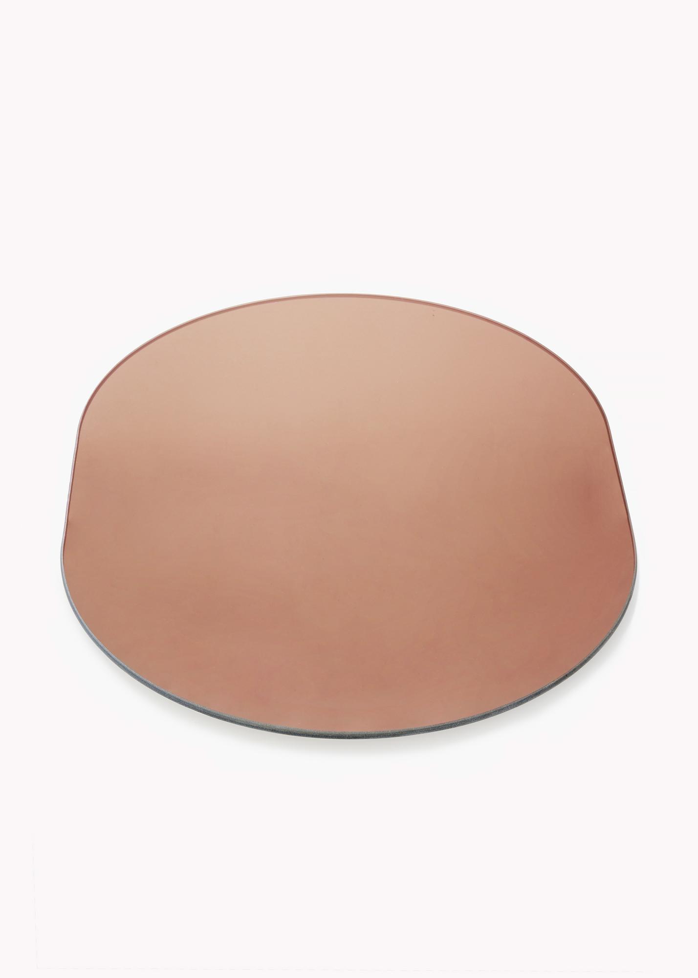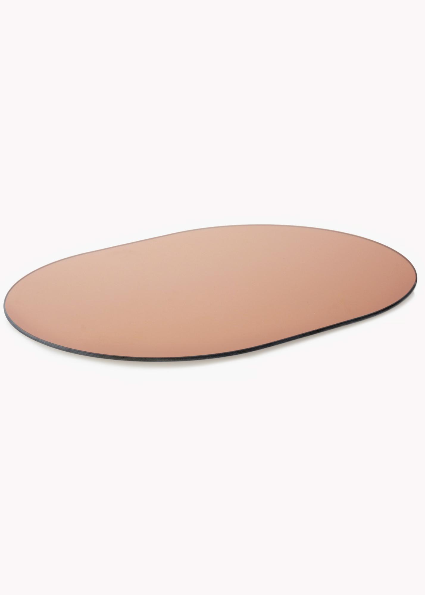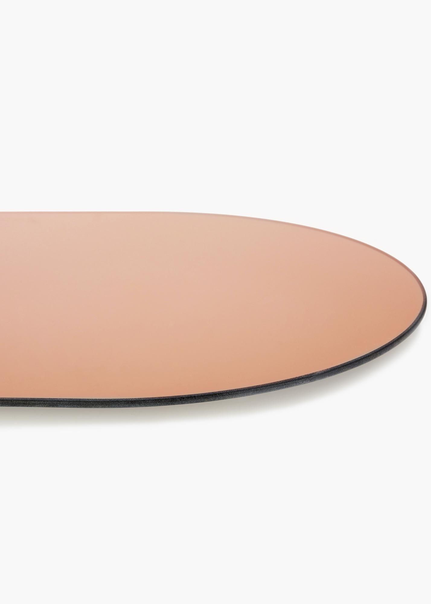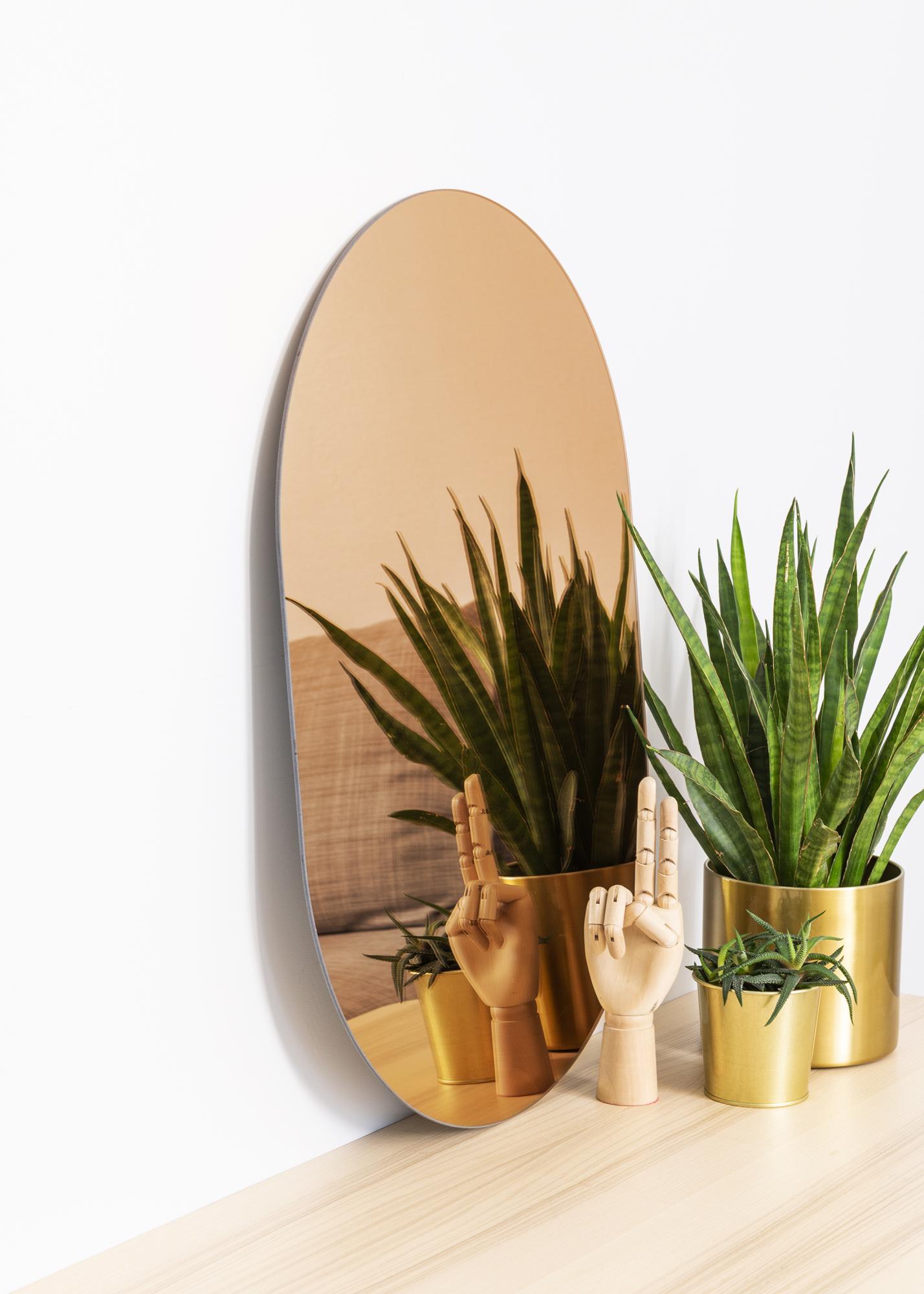 Această oglindă ovală este foarte subțire și nu are ramă, ceea ce îi conferă un aspect la modă și elegant. Senzația modernă este amplificată de sticla oglinzii, care este nuanțată într-o culoare stilată de aur roz. Acest detaliu face oglinda foarte izbitoare, menținându-și în același timp aspectul elegant.