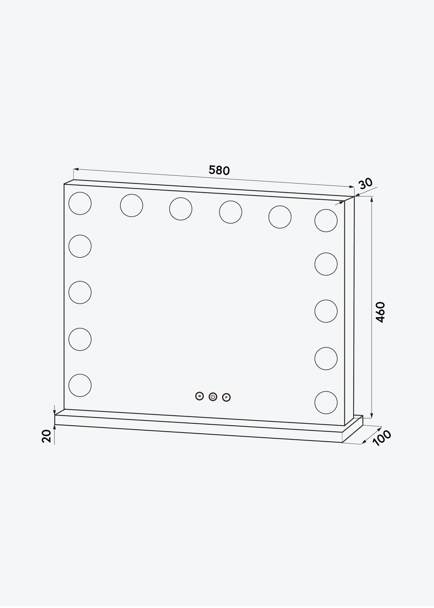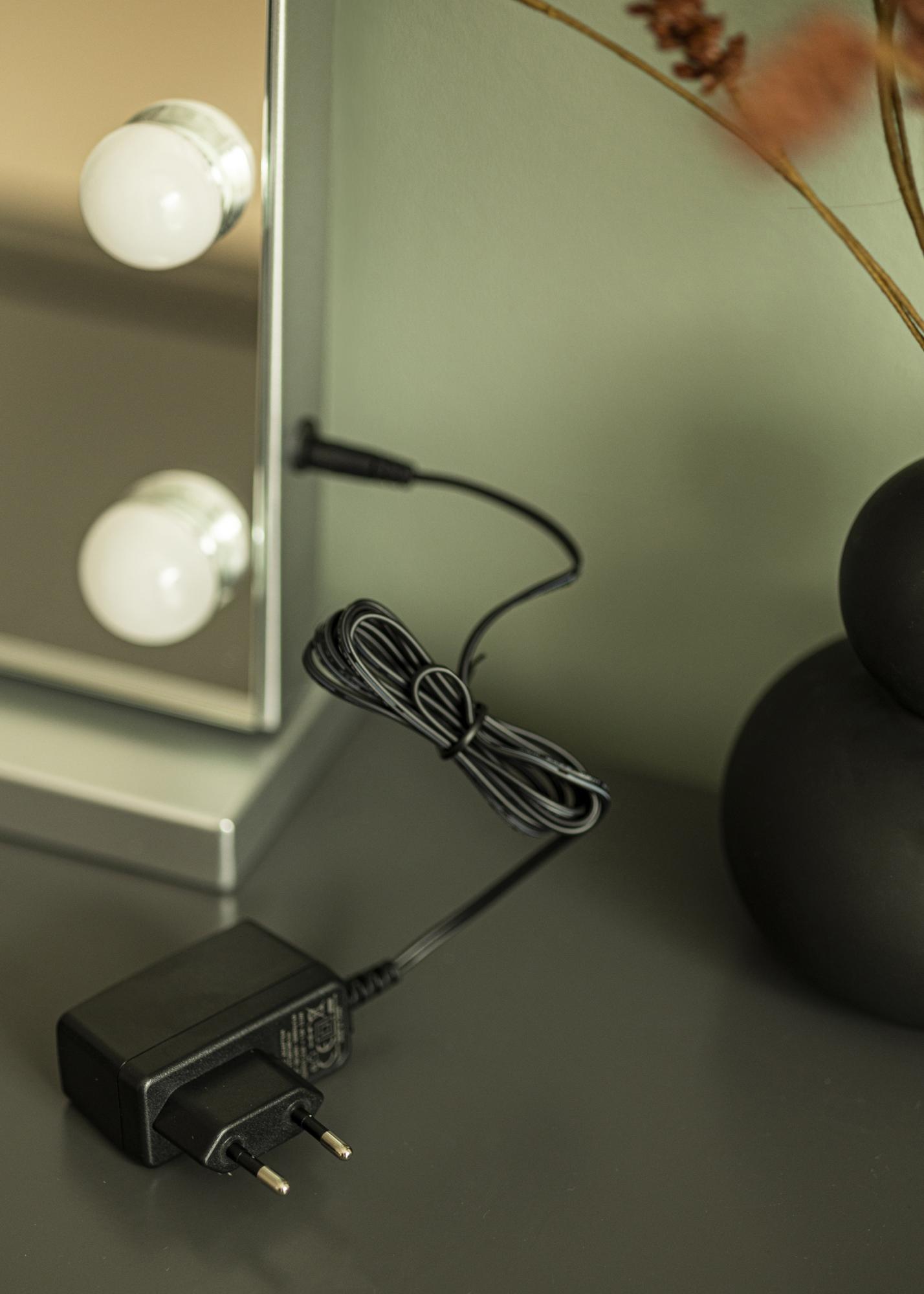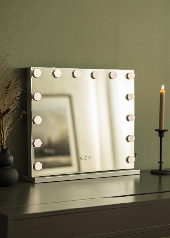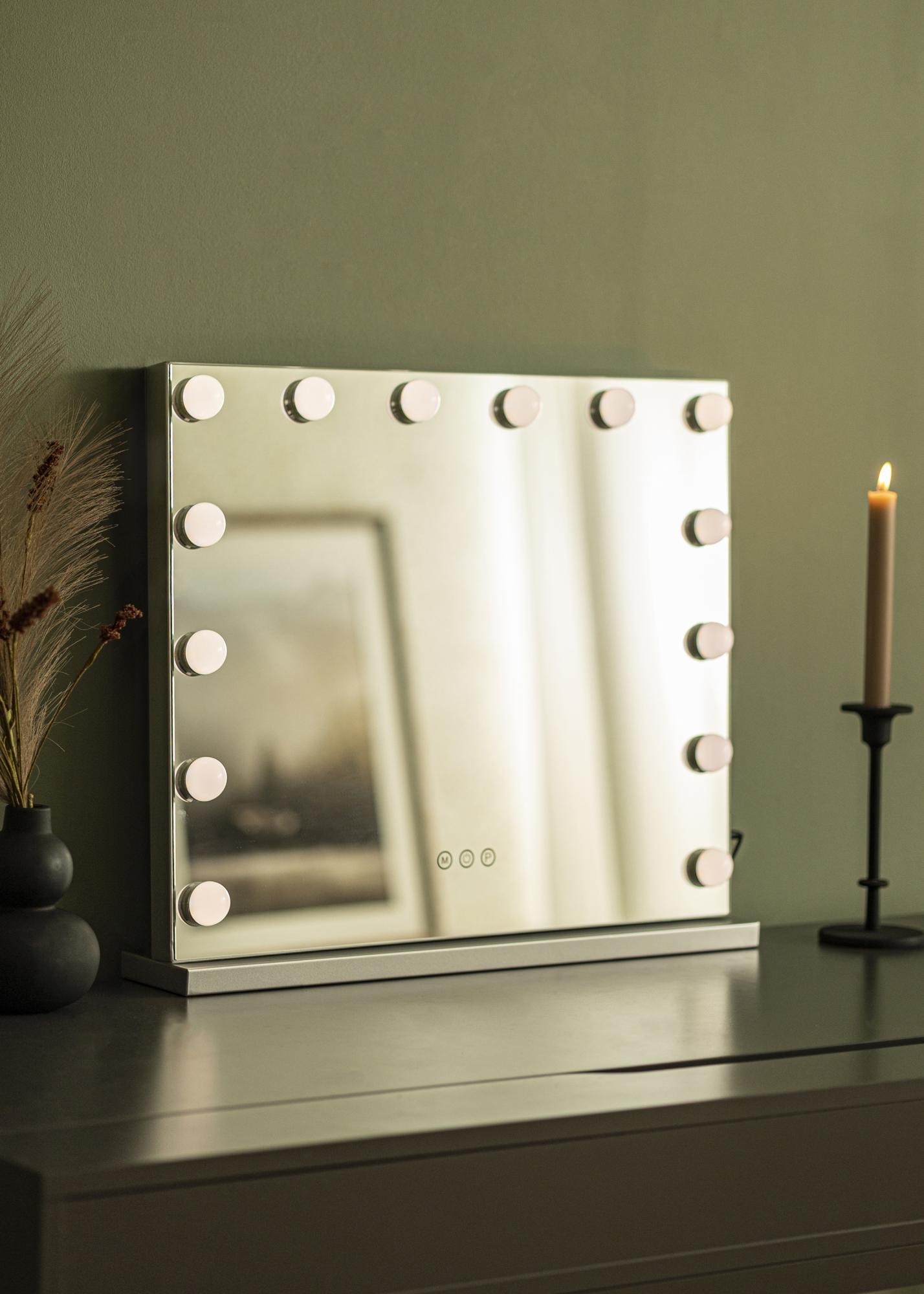 Această oglindă de machiaj are un design elegant, cu o formă dreptunghiulară de neegalat și 14 lămpi LED care îți oferă o iluminare bună atunci când aplici machiajul. Lămpile sunt plasate asemenea unei rame în jurul suprafeței de oglindă de 56x46 cm. Lumina poate fi reglată și poți ajusta chiar și temperatura de culoare dorită. Pentru a regla intensitatea luminii, trebuie să ții apăsat butonul tactil marcat cu "P", iar pentru a ajusta temperatura de culoare între 3000K-6000K, trebuie să ții apăsat butonul marcat cu "M". Oglinda are de asemenea un buton tactil pentru a aprinde și stinge iluminarea. Conexiunea electrică se face prin priză.