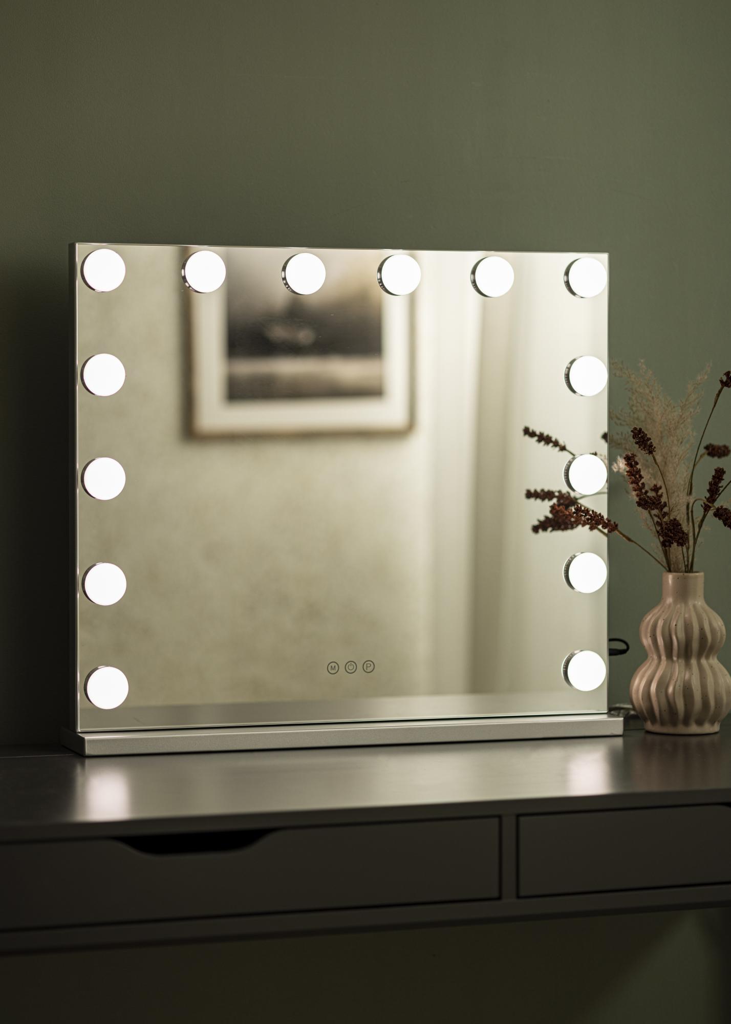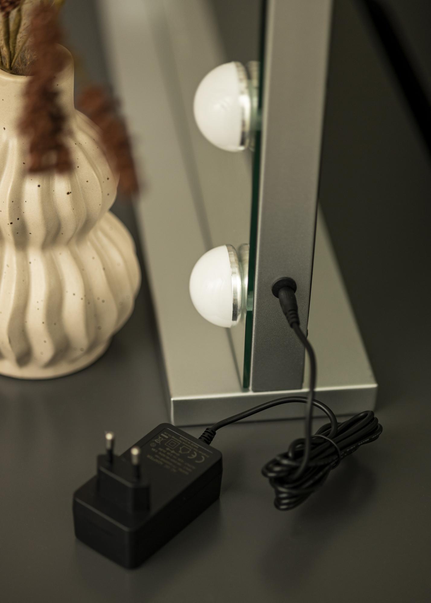 Cu această oglindă de machiaj, vei aduce mai mult glamour în casa ta, datorită designului luxos cu 14 becuri LED mari care creează un cadru în jurul suprafeței oglinzii. Nuanța argintie și forma dreptunghiulară subliniază și mai mult expresia stilată. Oglinda poate fi fie montată pe perete, fie plasată ca decor pe comode și mese laterale. Oglinda se conectează cu o priză.
