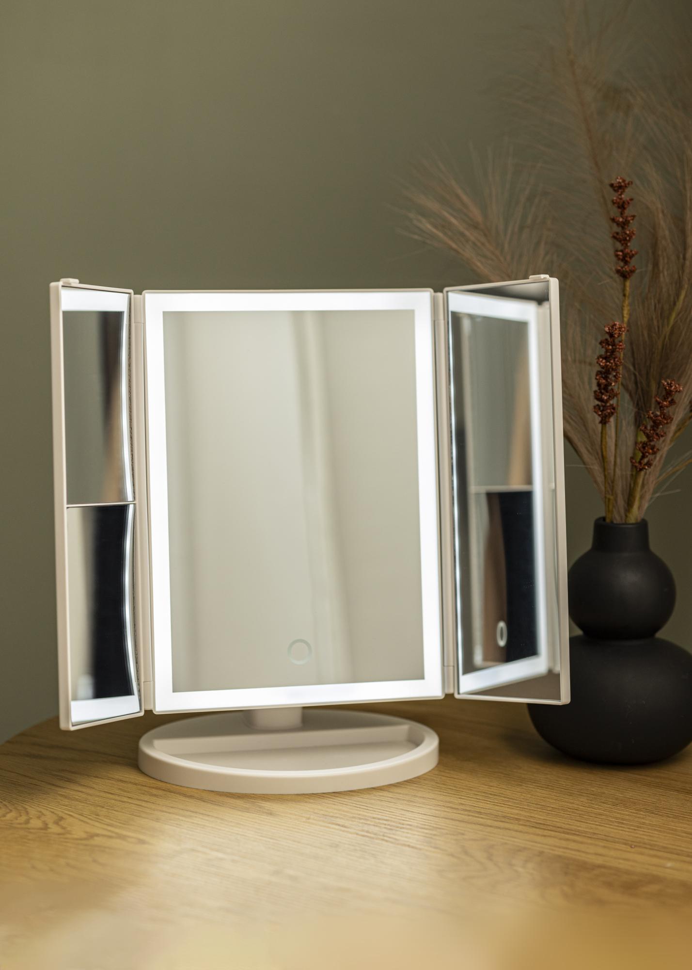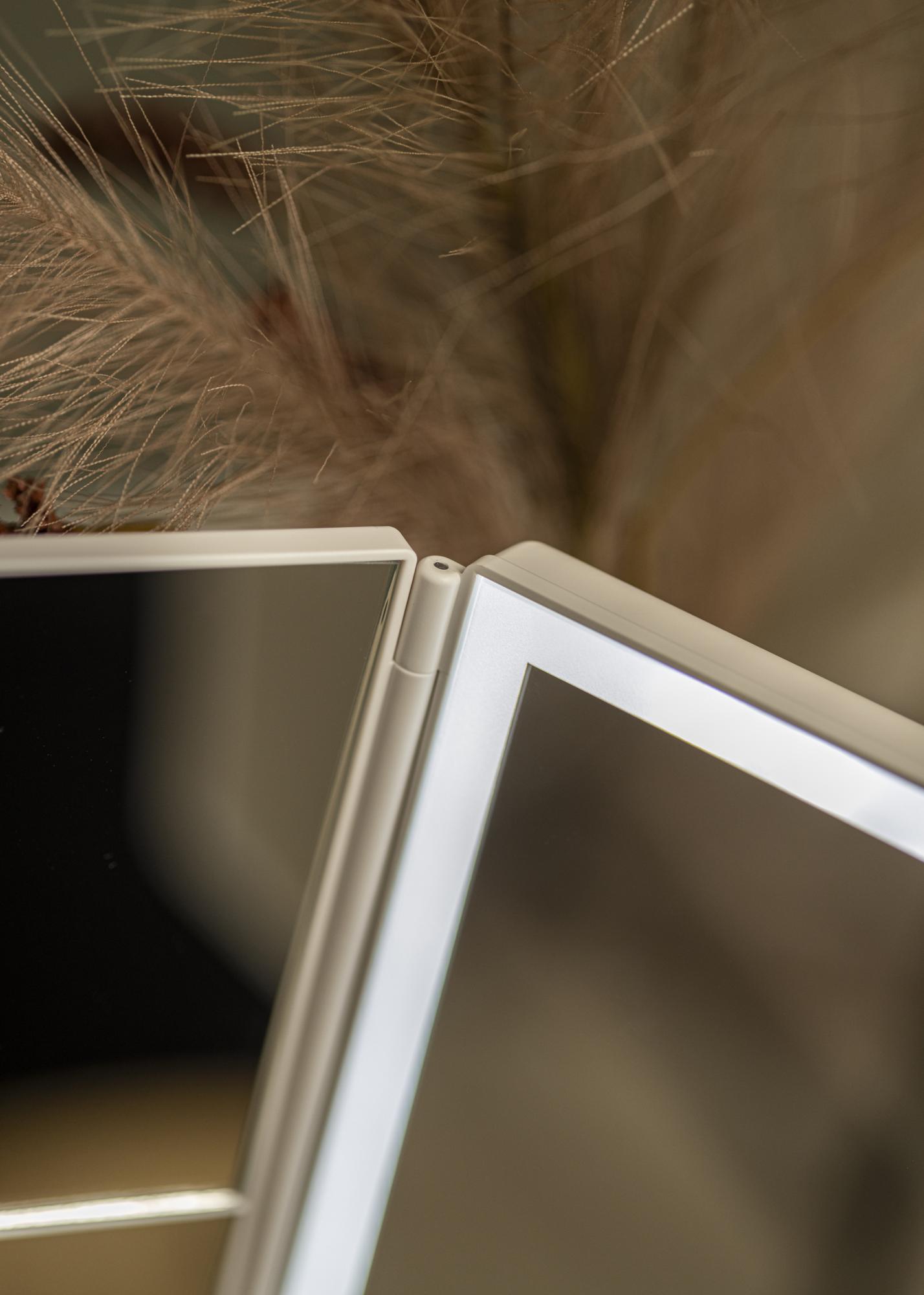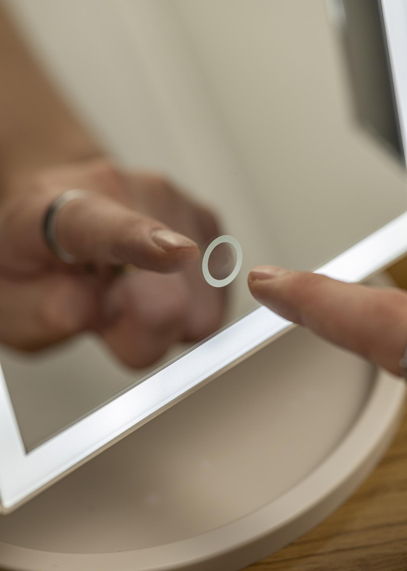 O oglindă de machiaj la modă și elegantă, pe suport, cu patru oglinzi diferite și iluminare LED reglabilă. Partea stângă a oglinzii de machiaj are sticlă de oglindă cu mărire 2x și 3x. Iluminarea LED integrată încadrează frumos oglinda mai mare din centru și oferă o lumină albă caldă plăcută la 3000K. Poți aprinde ușor iluminarea apăsând pe butonul tactil de pe ecran și ajusta intensitatea luminii ținând apăsat butonul timp de câteva secunde. Oglinda măsoară 38x30 cm și poate fi înclinată, oferindu-ți posibilitatea de a te reflecta din diferite unghiuri.