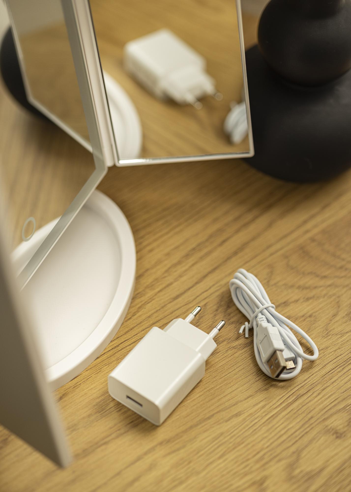 Oglinda este alimentată cu 4x baterii AA (nu sunt incluse) sau se încarcă cu adaptorul USB de perete și cablul USB incluse.