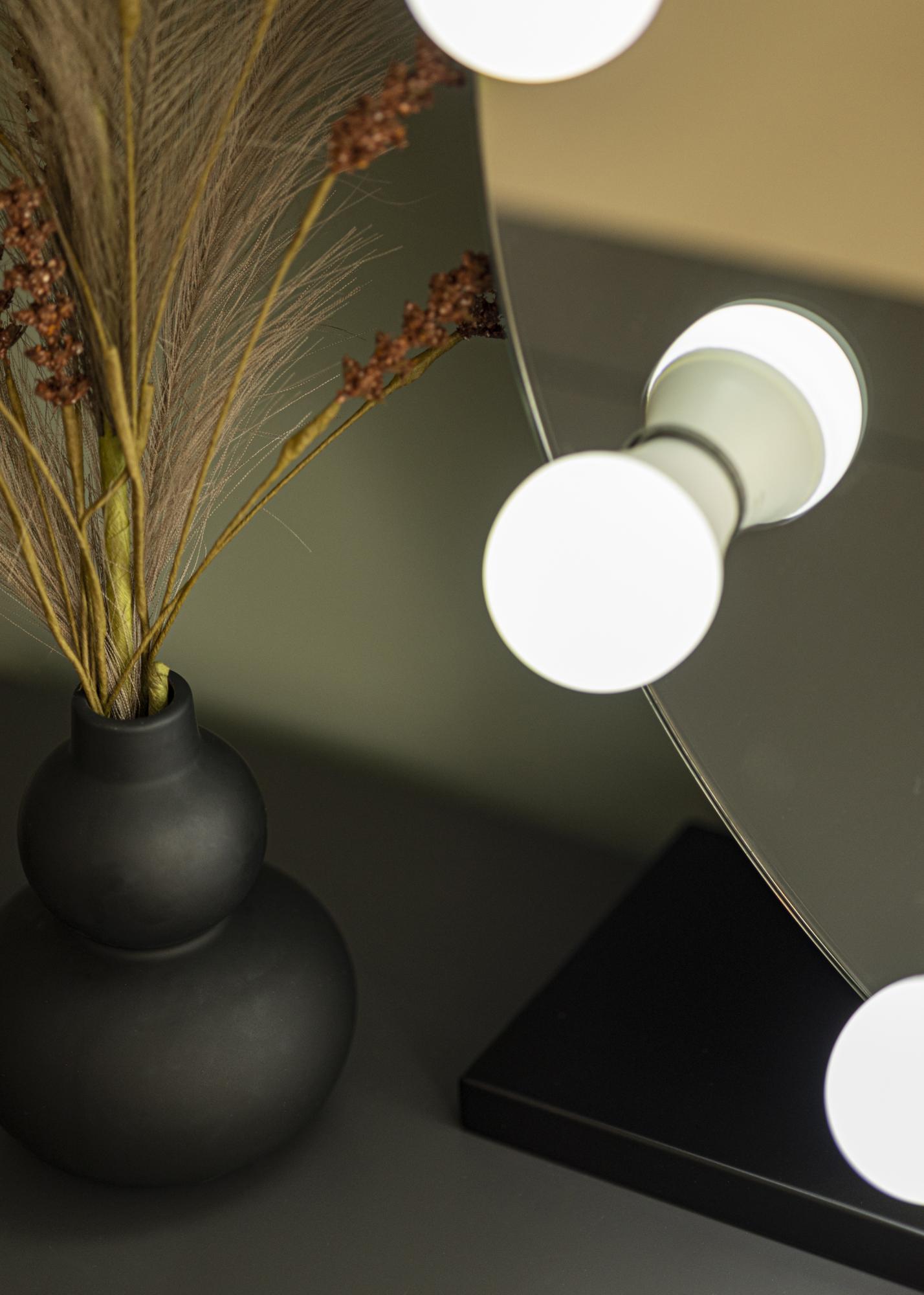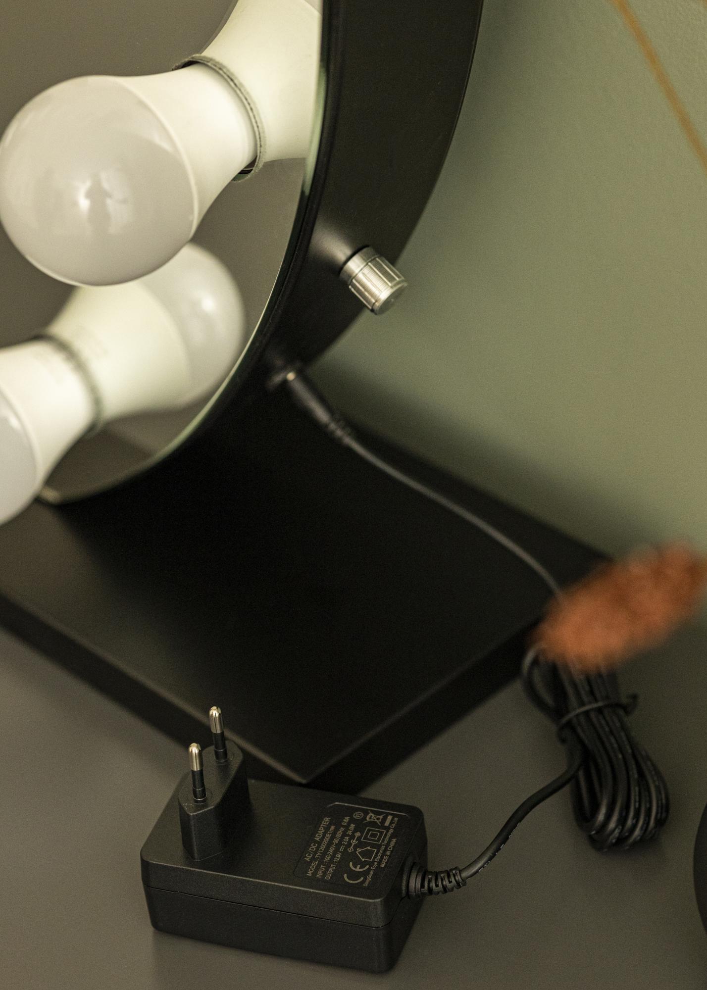 Această oglindă decorativă pentru machiaj îți oferă stil și funcționalitate în același pachet! Are un design stilat, cu o formă rotundă, un suport elegant negru și 10 becuri cu soclu E27, care încadrează frumos suprafața oglinzii. Iluminarea integrată cu lumină albă rece este perfectă atunci când te pregătești pentru zi. Oglinda poate fi așezată vertical, permițându-ți să o amplasezi cu ușurință în dormitor, sufragerie sau hol, unde iluminarea oglinzii pentru machiaj poate servi și ca o iluminare de fundal frumoasă. Oglinda poate fi, de asemenea, montată pe perete. Iluminarea este reglabilă și pentru a ajusta iluminarea rotești butonul plasat pe latura scurtă a oglinzii.