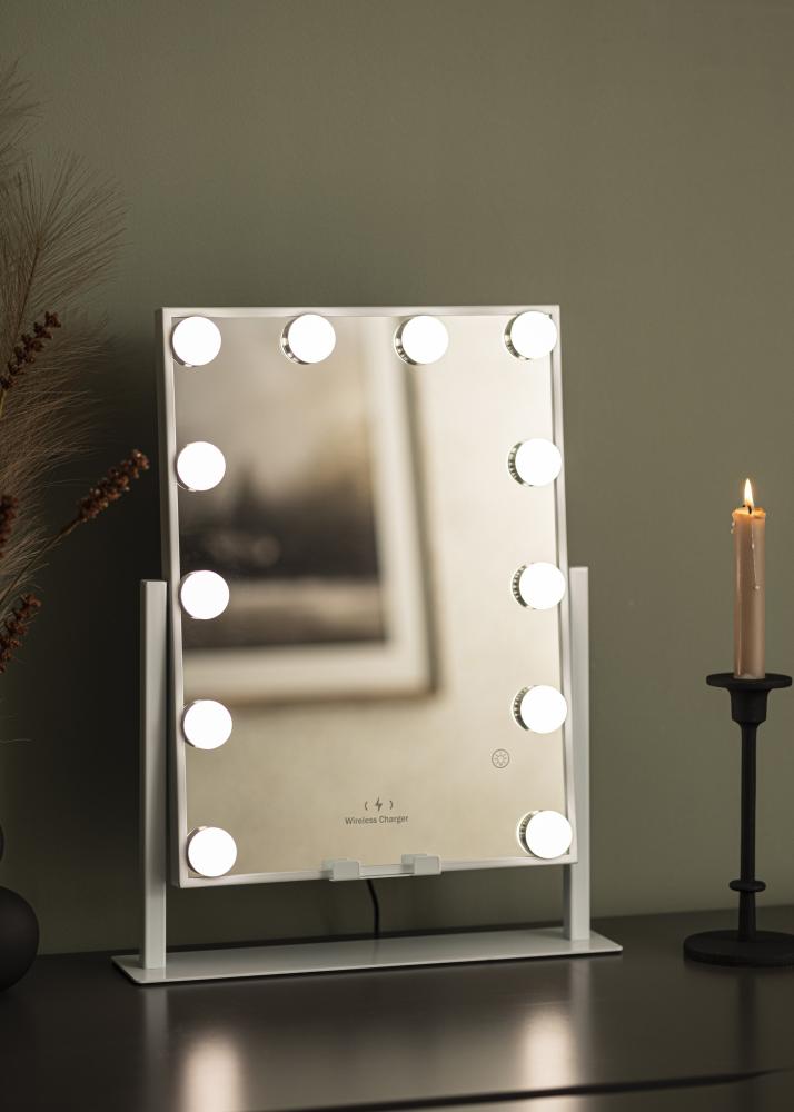 Aceasta este o oglindă de machiaj elegantă, cu un plus de lux - suportă încărcarea wireless a smartphone-ului tău! Când lampa este aprinsă, plasezi dispozitivul tău pe locul desemnat pe oglindă pentru a-l încărca cu 5V/2A (10W). Este super practic pentru diminețile aglomerate când vrei să ai telefonul aproape în timp ce te pregătești în fața oglinzii. Funcția este compatibilă cu toate modelele de smartphone care suportă încărcarea wireless.