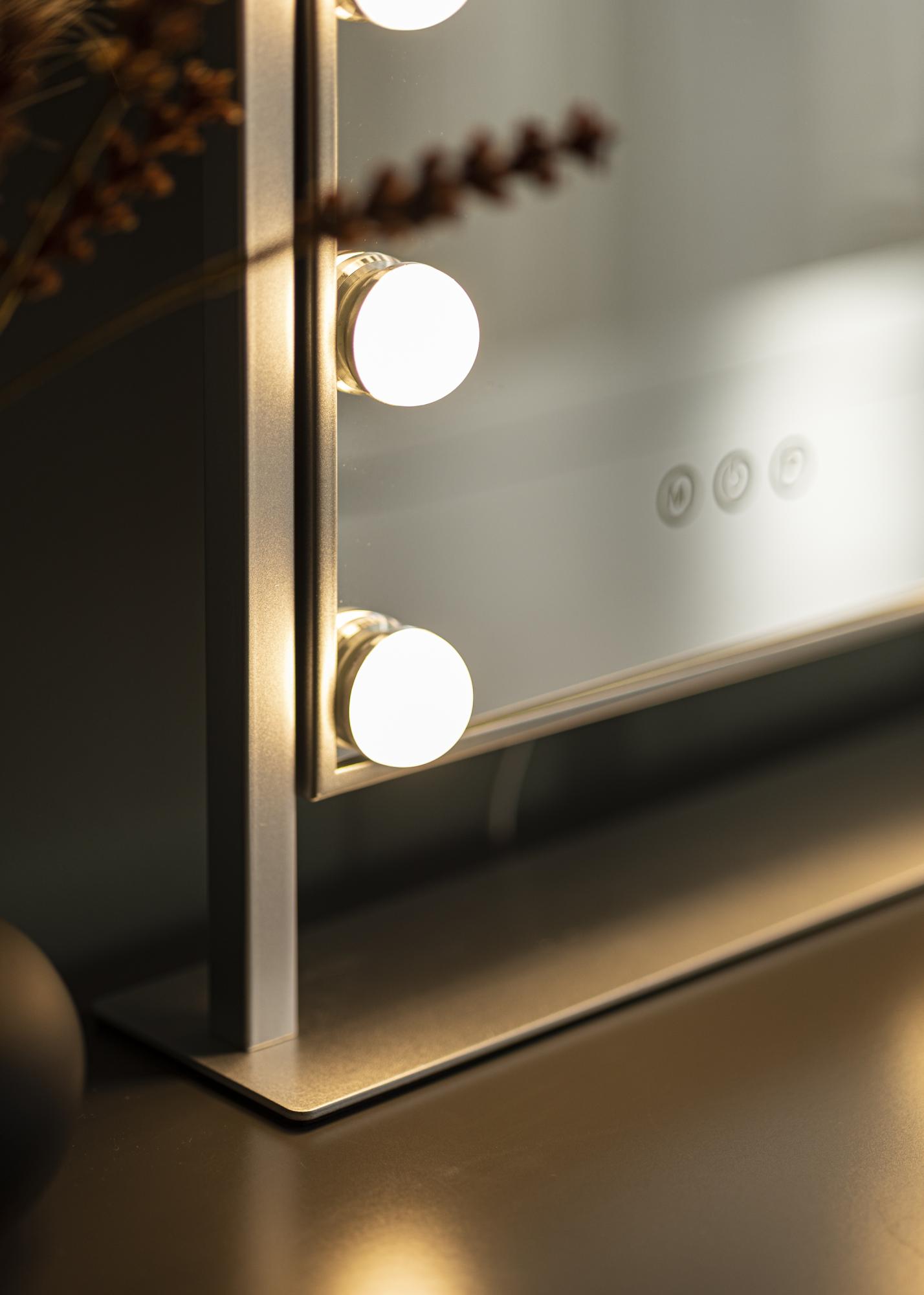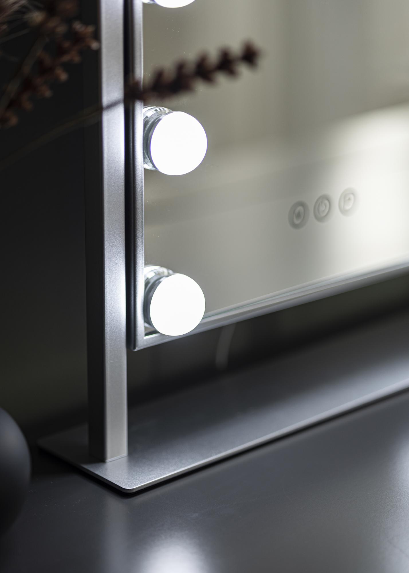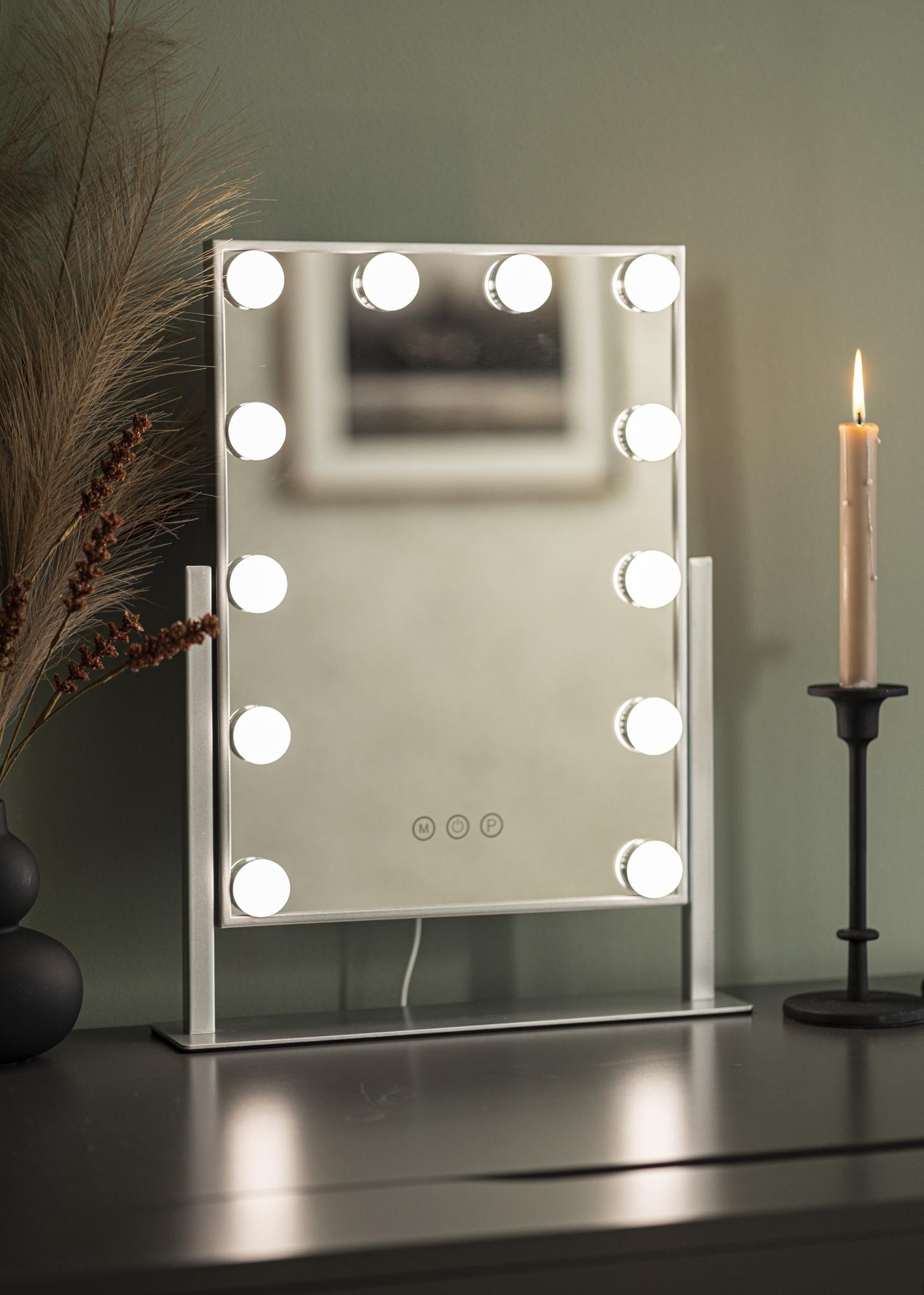 Cu o oglindă de machiaj luxoasă cu iluminare integrată, poți să te pregătești pentru zi într-un mod mai plăcut. Această oglindă de culoare argintie are o iluminare sub forma a 12 lămpi LED care încadrează suprafața oglinzii, oferind aspectului oglinzii o combinație de minimalism stilat și glamour hollywoodian. Iluminarea oglinzii este, de asemenea, reglabilă, iar tu poți schimba temperatura culorii și poți estompa lumina după cum dorești. Acest lucru se face cu ajutorul butoanelor tactile de pe partea din față a oglinzii, unde butonul „M” ajustează temperatura culorii și butonul „P” reglează intensitatea luminii. De asemenea, pornești și oprești iluminarea oglinzii cu un buton tactil.