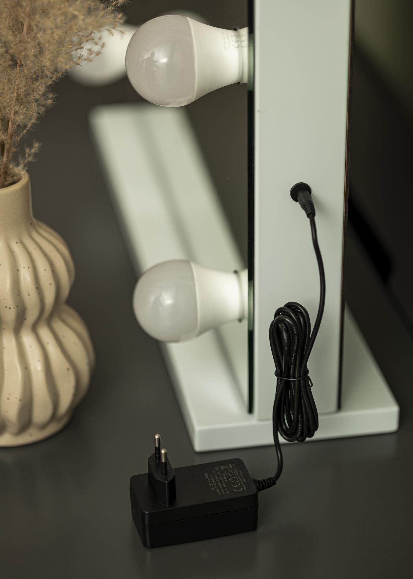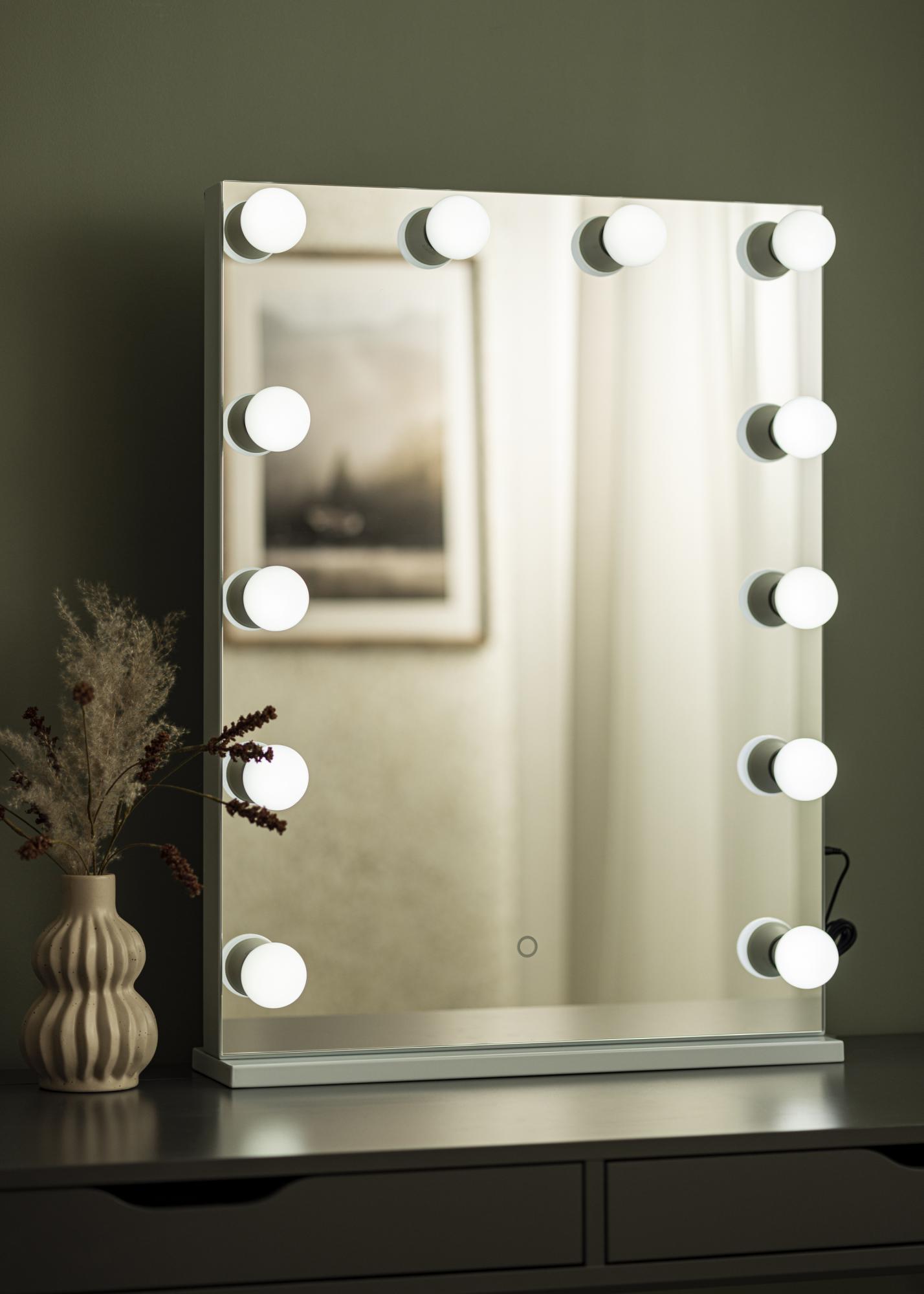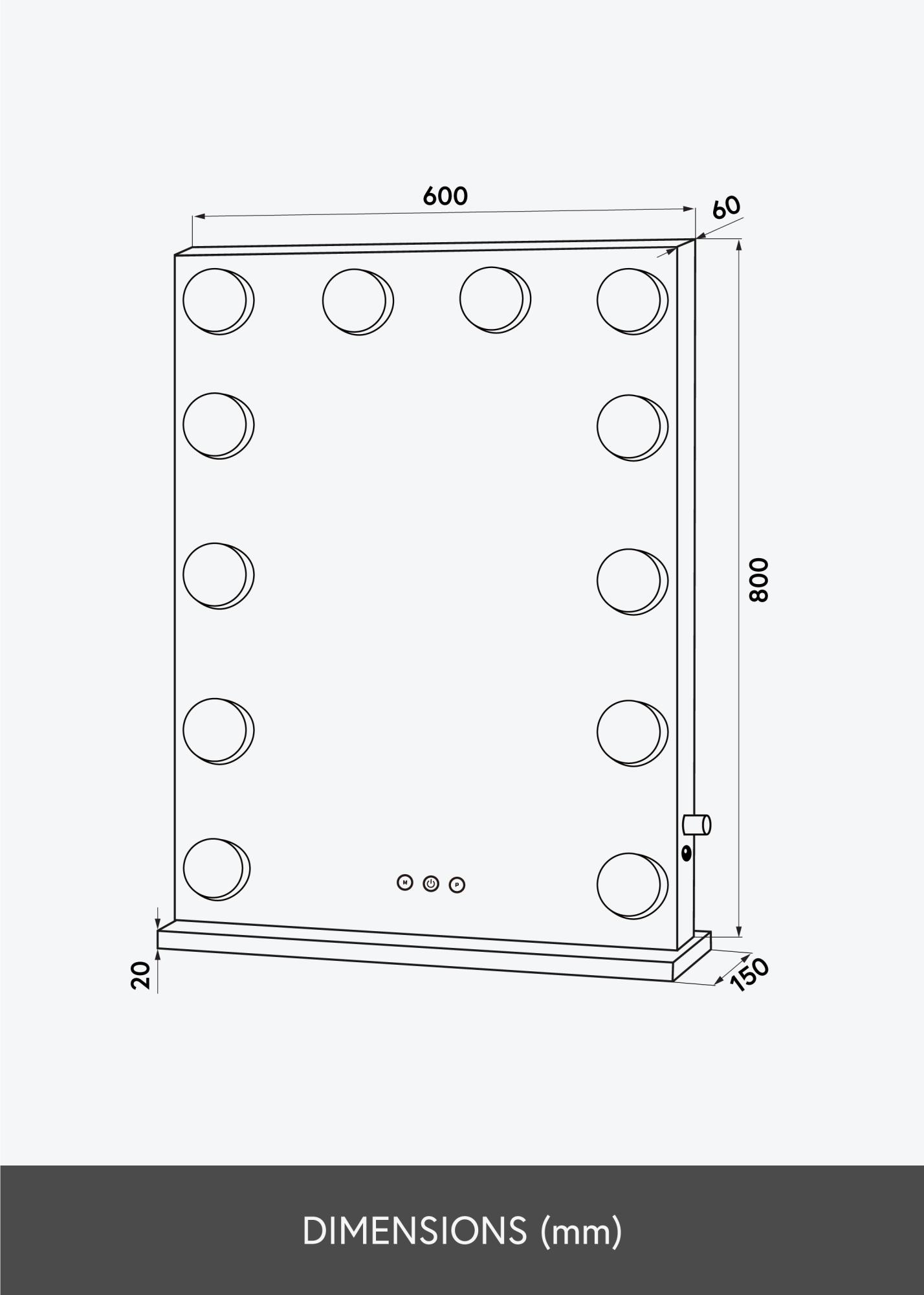 Aceasta este o oglindă de machiaj în design Hollywood, cu o formă clasică dreptunghiulară, o suprafață mare de oglindă de 80x60 cm și 14 lămpi LED plasate ca o ramă elegantă. Poate fi amplasată stând pe o piesă de mobilier, de exemplu, ca o oglindă funcțională pe masa de machiaj sau ca un detaliu decorativ de interior pe o masuță laterală. Dacă preferi să atârni oglinda pe perete, cu ajutorul suporturilor de perete din spate, poți demonta piciorul. Oglinda se conectează prin priză.