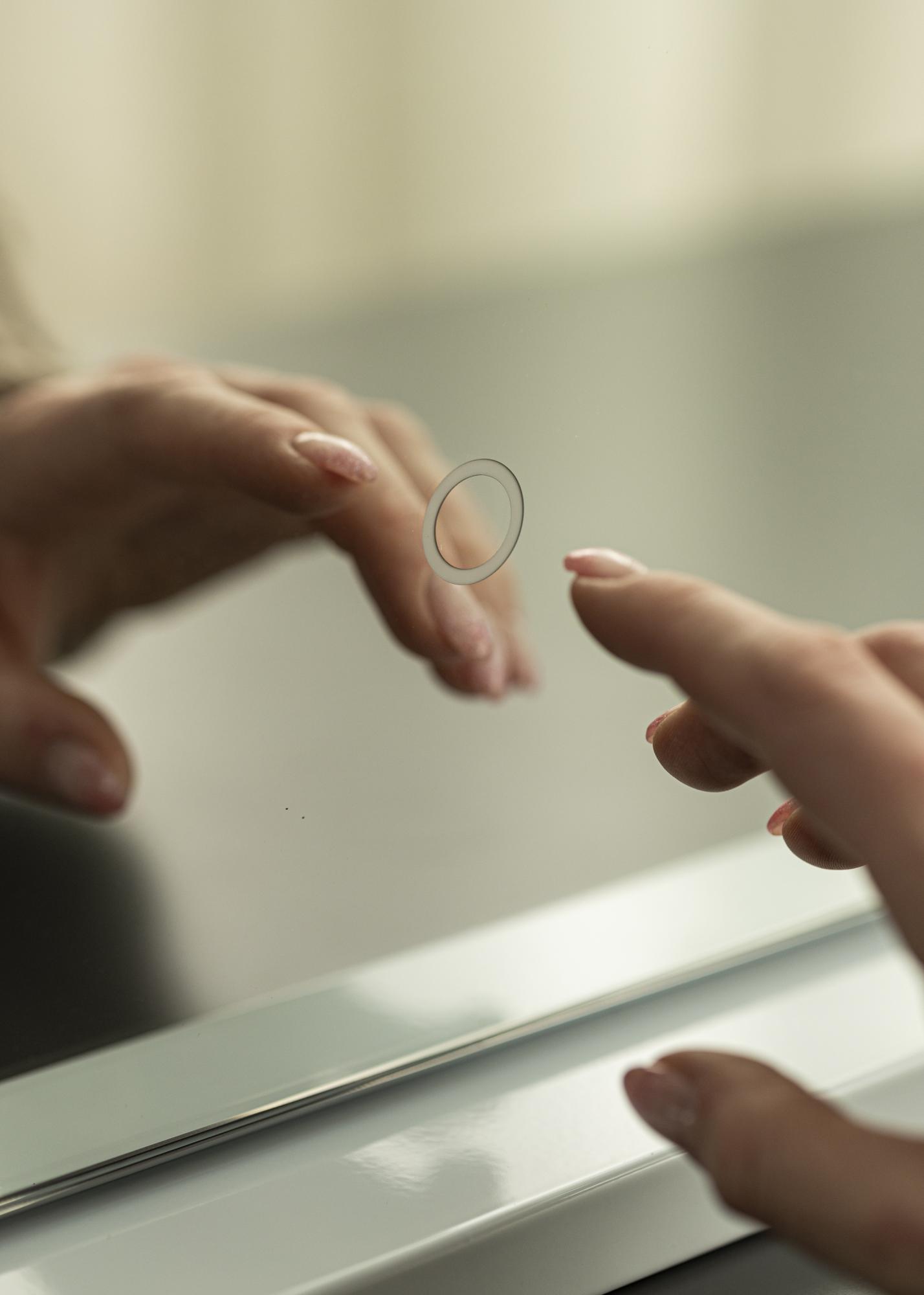 Iluminarea LED a oglinzii emană o lumină albă rece. O aprinzi apăsând butonul de pe suprafața oglinzii și, dacă ții apăsat butonul câteva secunde, poți regla intensitatea luminii după dorință. Astfel, poți alege ușor dacă dorești o iluminare de fundal blândă sau o lumină mai puternică care te ajută să te concentrezi când aplici machiajul.