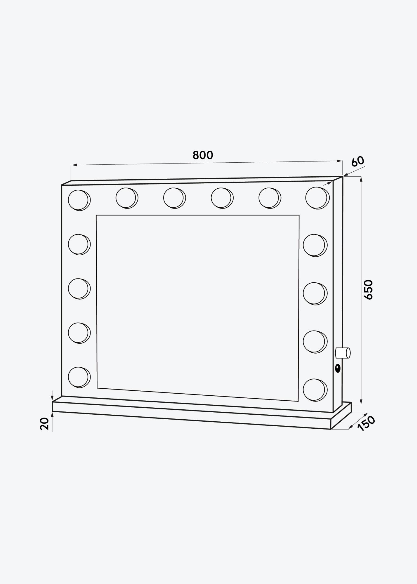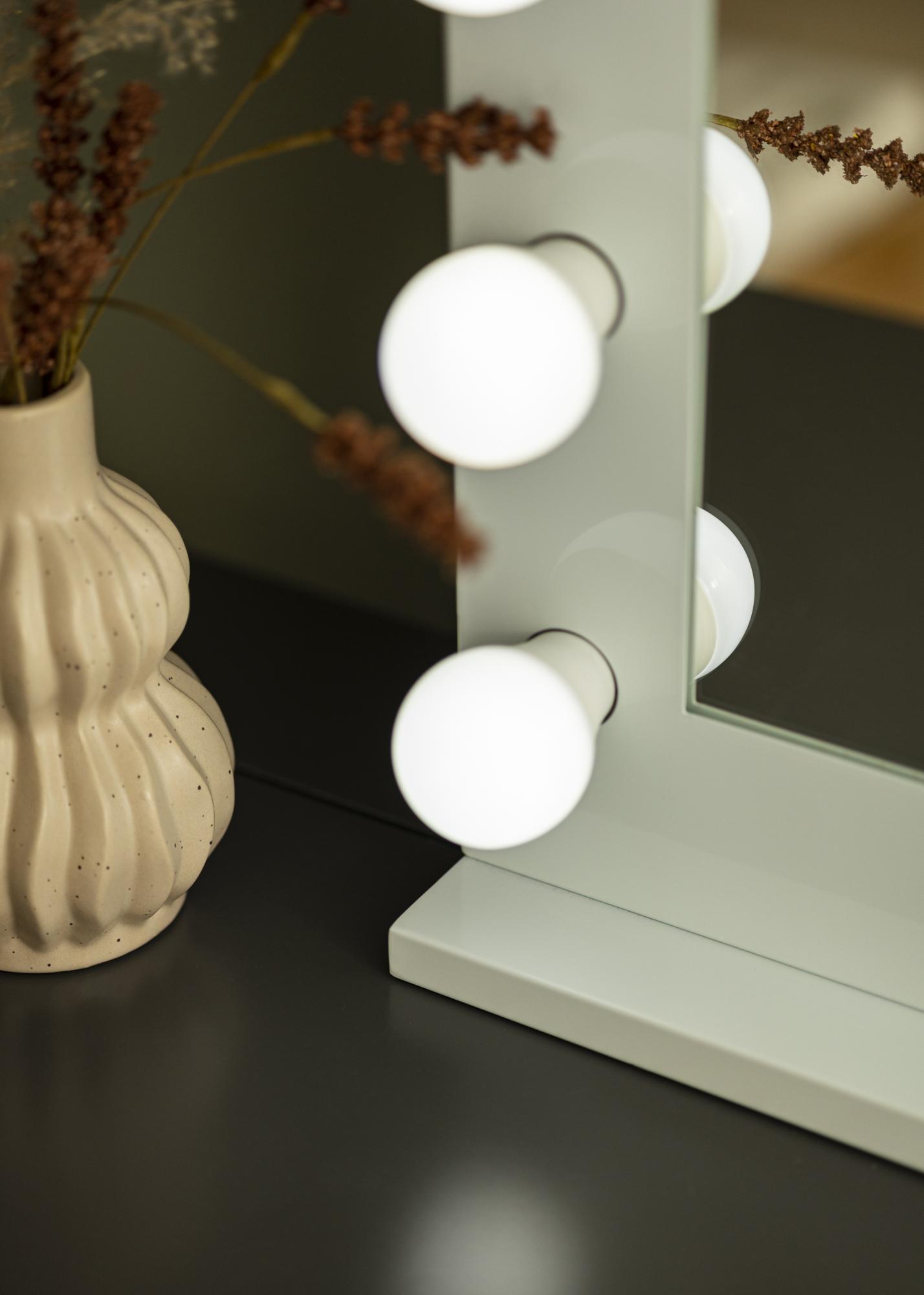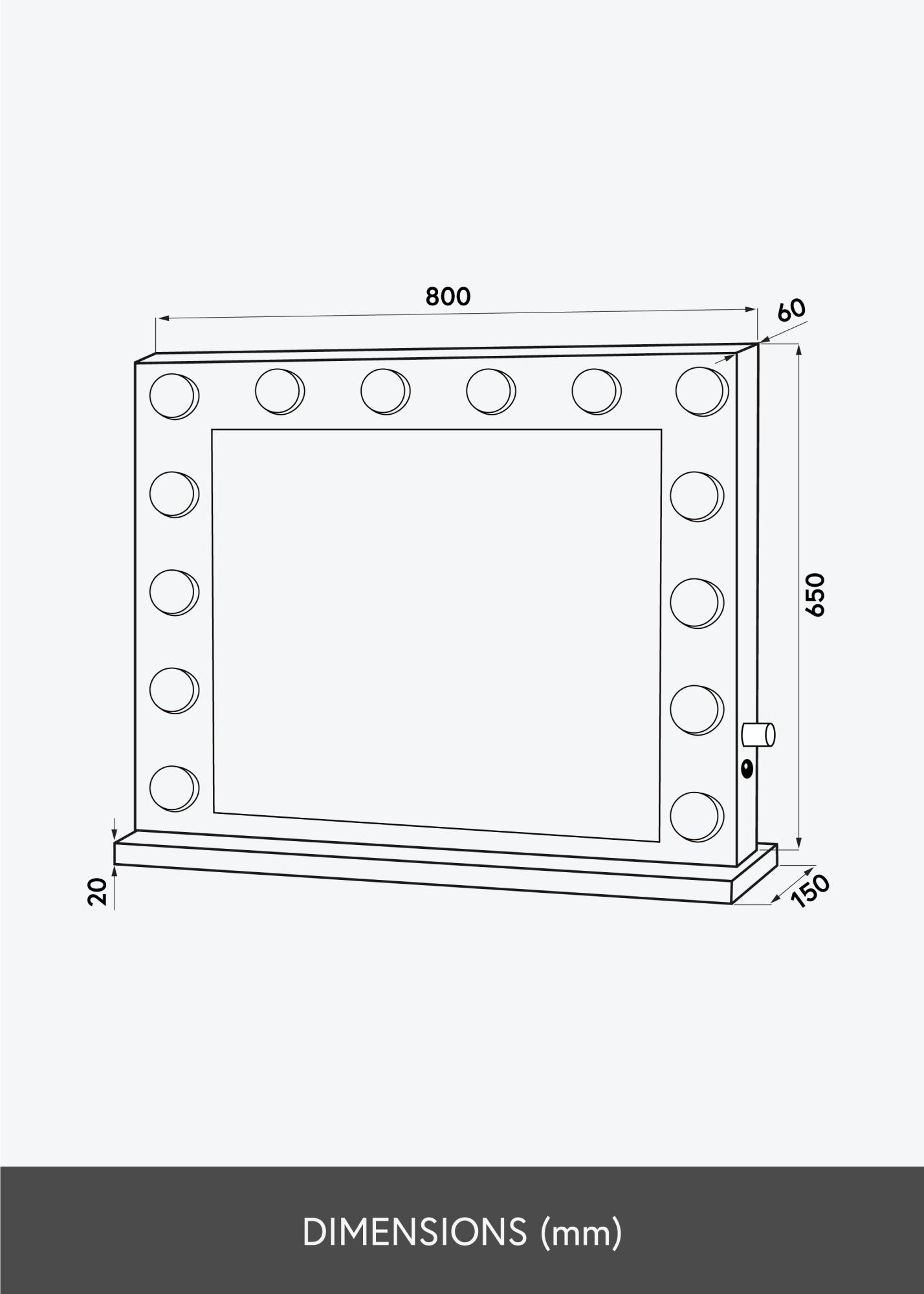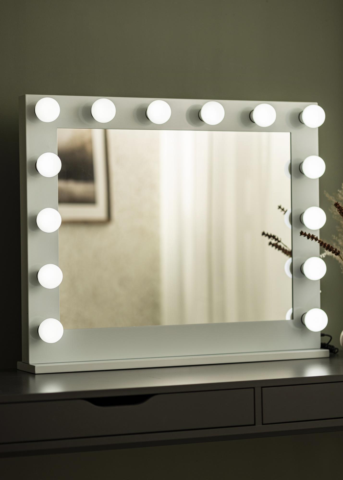 Aceasta este o oglindă de machiaj mare cu iluminare încorporată – perfectă pentru aplicarea machiajului sau pentru a te privi înainte de a ieși din casă. Formatul mare, cu o suprafață a oglinzii de 80x65 cm, combinat cu o ramă elegantă albă cu 14 becuri interschimbabile, conferă oglinzii un aer de glamour hollywoodian. Becurile au soclu E27. Oglinda se așază vertical pe o consolă, comodă sau altă suprafață plană pe care dorești să o decorezi cu o frumoasă oglindă de machiaj. Poate fi, de asemenea, montată pe perete fără suport.