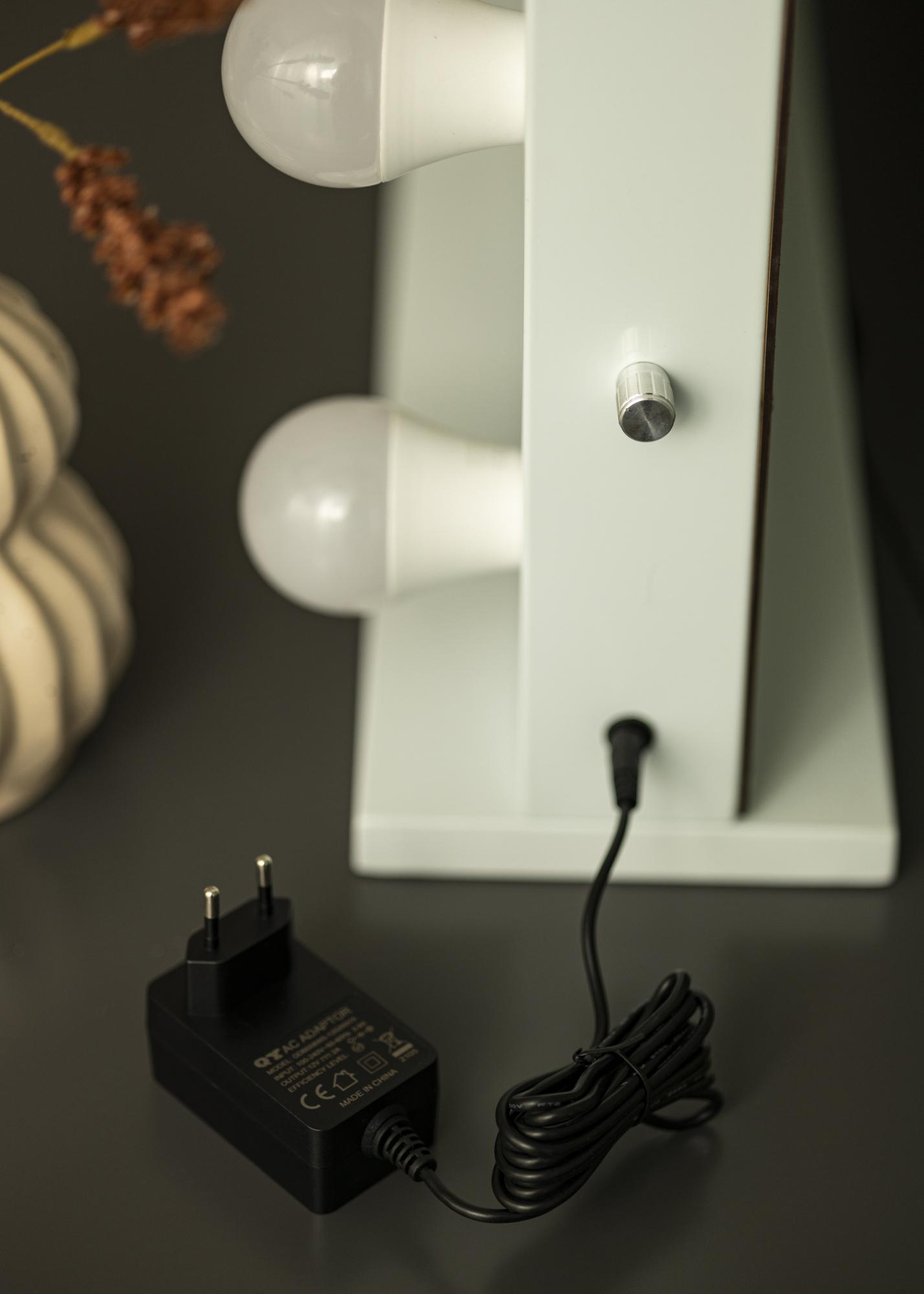 Becurile oglinzii emană o lumină albă rece. Dacă dorești să ajustezi intensitatea luminii, poți face acest lucru cu ajutorul unui buton rotativ convenient amplasat pe una dintre laturile scurte. Instalarea electrică se realizează prin priză.