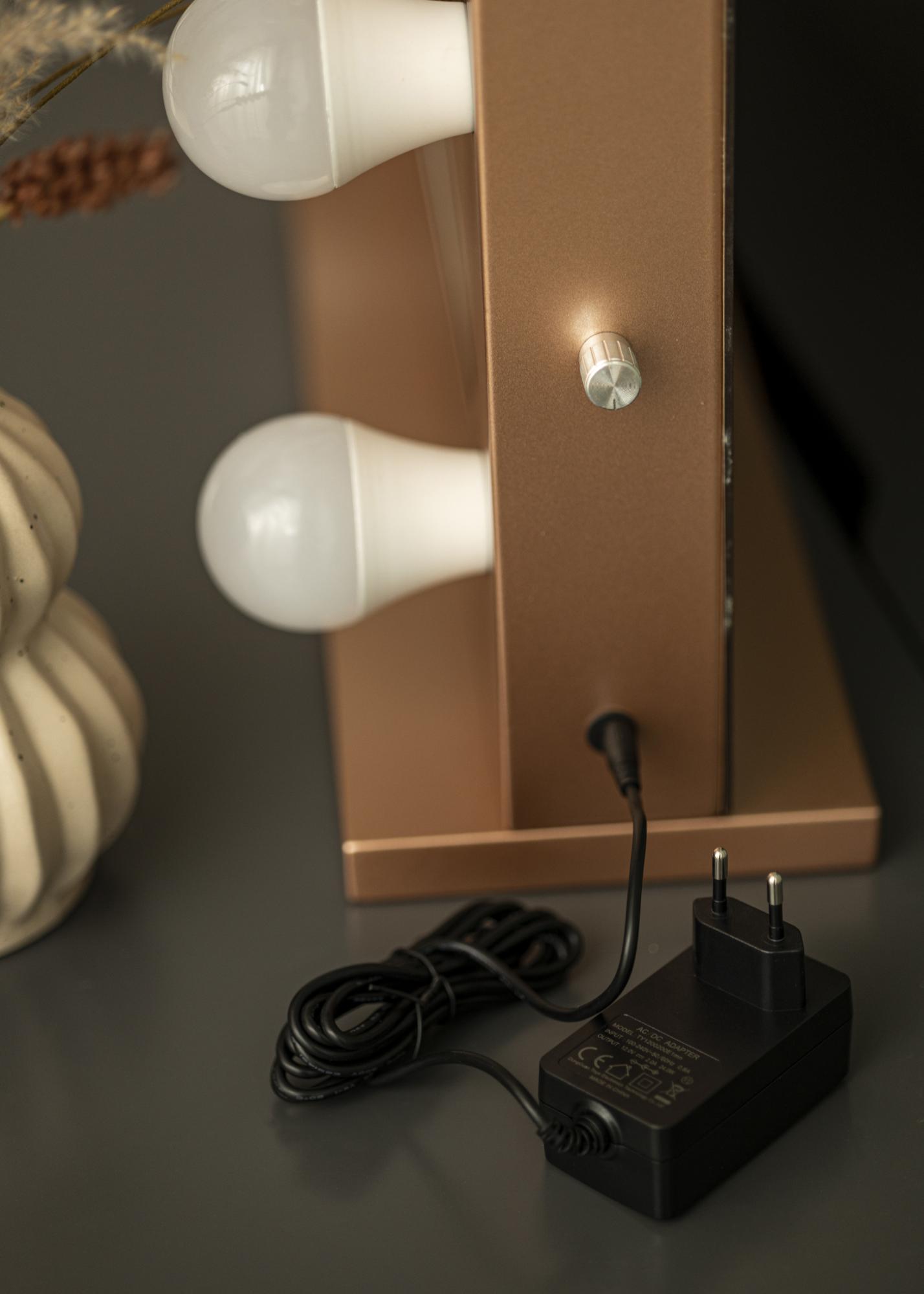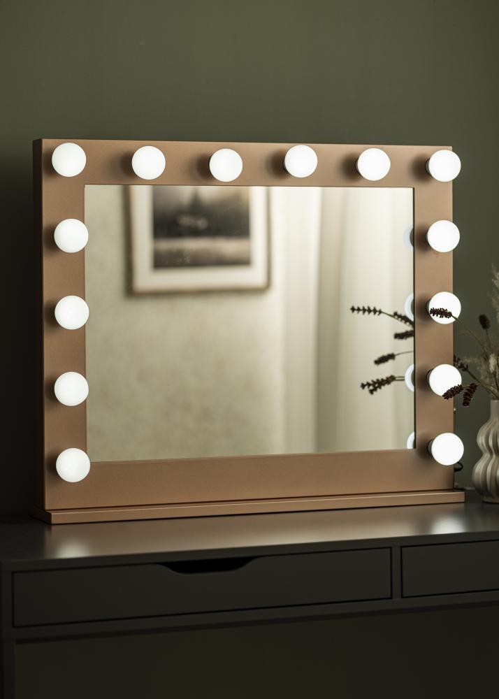 Aceasta este o oglindă de machiaj cu o eleganță ridicată, datorită designului inspirat de Hollywood, cu o ramă largă în nuanță de aur roz împodobită cu 14 lămpi LED mari. Becurile LED au soclu E27 și pot fi înlocuite cu ușurință dacă este necesar. LED-ul ca sursă de lumină este, de asemenea, atât o opțiune durabilă, cât și eficientă energetic. Oglinda emite o lumină albă rece care poate fi reglată cu ajutorul unui buton rotativ mic pe una dintre părțile oglinzii.
