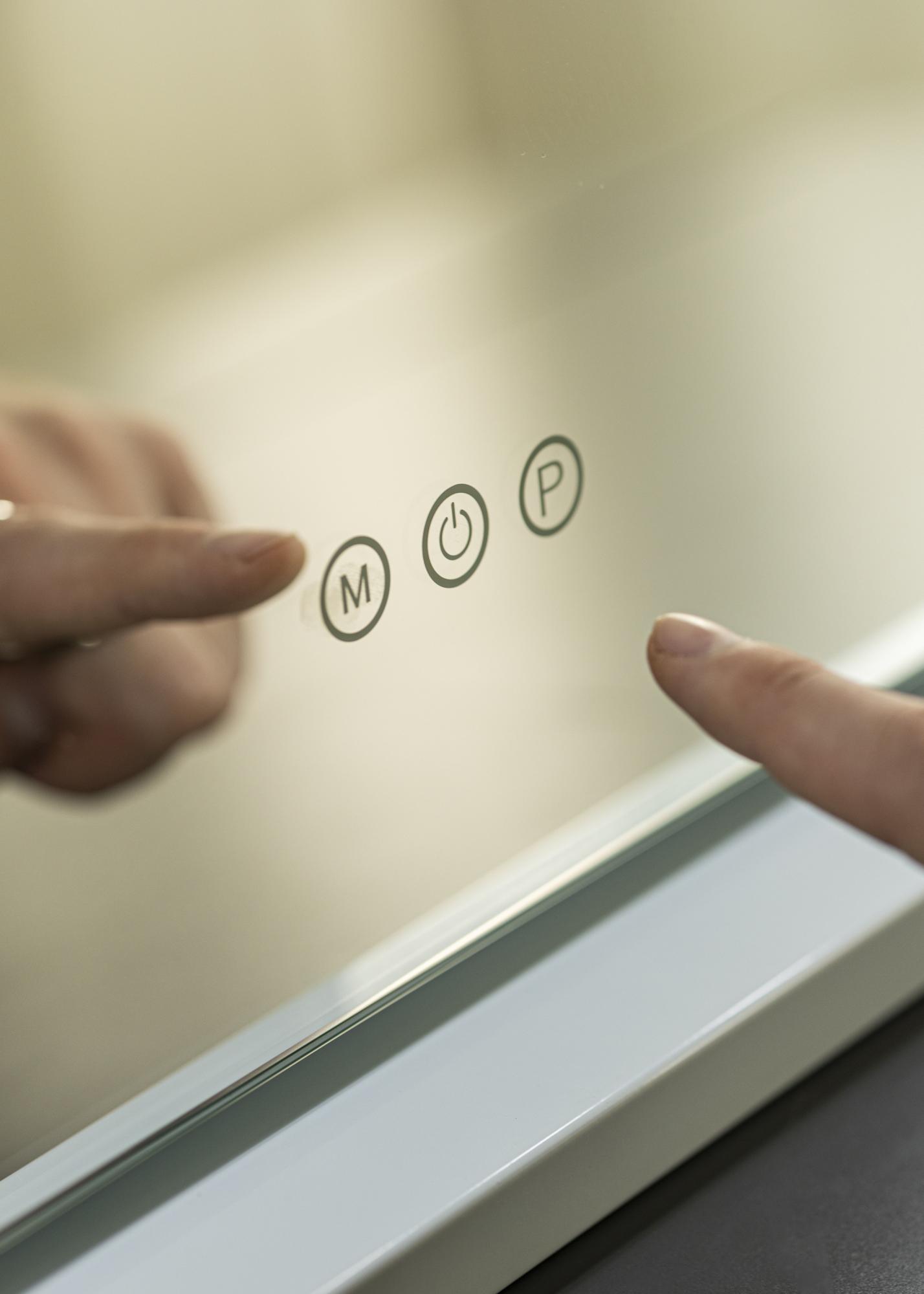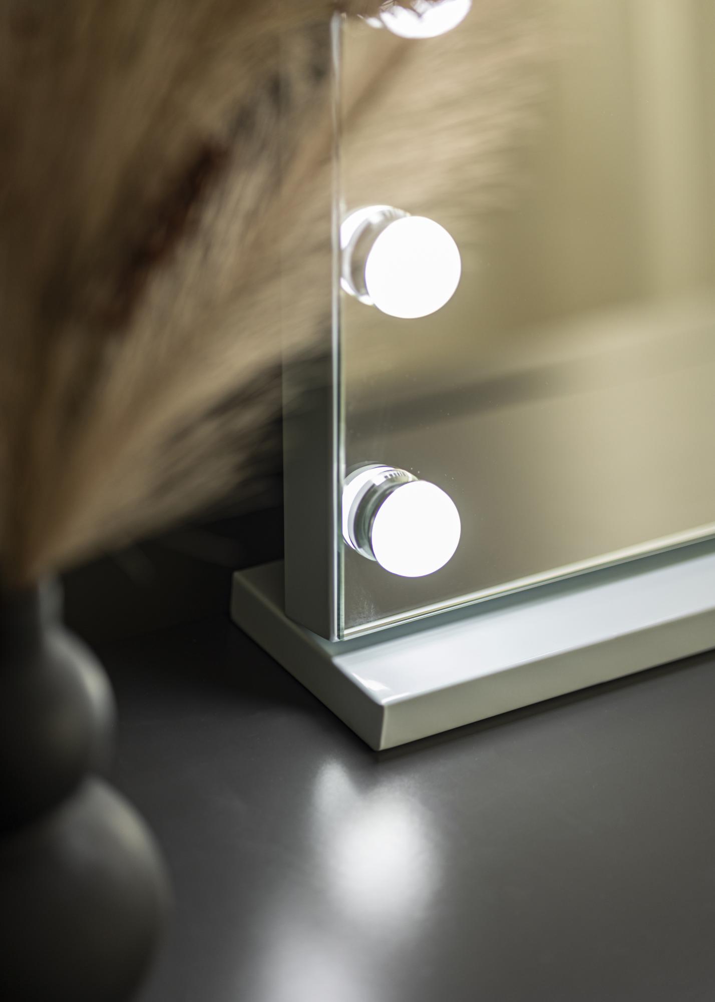 Creează un colț de machiaj luxos și funcțional cu oglinda noastră de machiaj cu lumină. Această oglindă este proiectată într-o formă dreptunghiulară elegantă și echipată cu iluminare încorporată care oferă o lumină uniformă și plăcută, perfectă pentru rutina ta zilnică de machiaj. Designul modern face ca oglinda să nu doar să îmbunătățească colțul tău de machiaj, dar să funcționeze și ca un element atractiv de decor. Poți să o așezi în camera de zi sau pe hol pentru a adăuga iluminare ambientală stilată. Iluminarea oglinzii, care constă din 15 lămpi LED cu intensitate variabilă, încadrează suprafața mare a oglinzii de 58x46 cm. Intensitatea luminii și temperatura culorii sunt reglate simplu prin butoanele tactile de pe fața oglinzii, marcate cu "P" pentru intensitatea luminii și "M" pentru temperatura culorii, ceea ce face ușor să adaptezi iluminarea în funcție de nevoile tale.