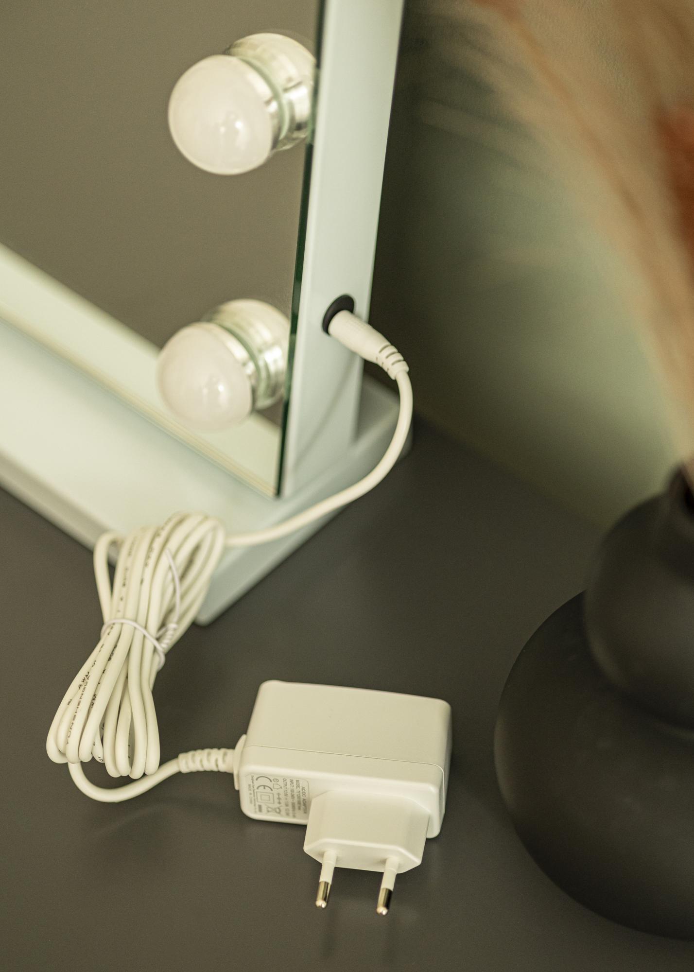 Oglinda poate fi agățată fie pe perete în poziție orizontală, fie montată fix pe suportul inclus. Acest model are un suport alb elegant care ridică eleganța aspectului întregii oglinzi. Conectarea la electricitate se face prin priză.
