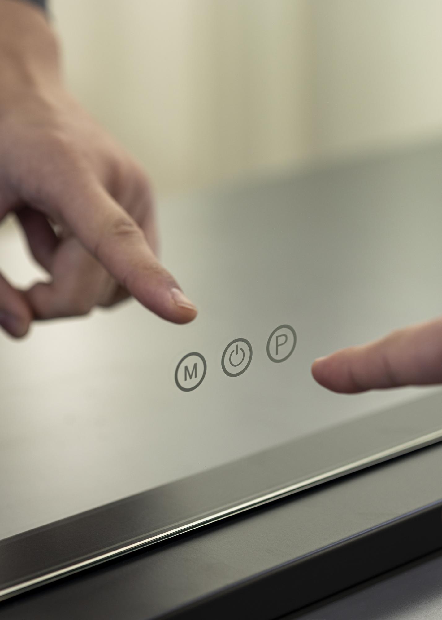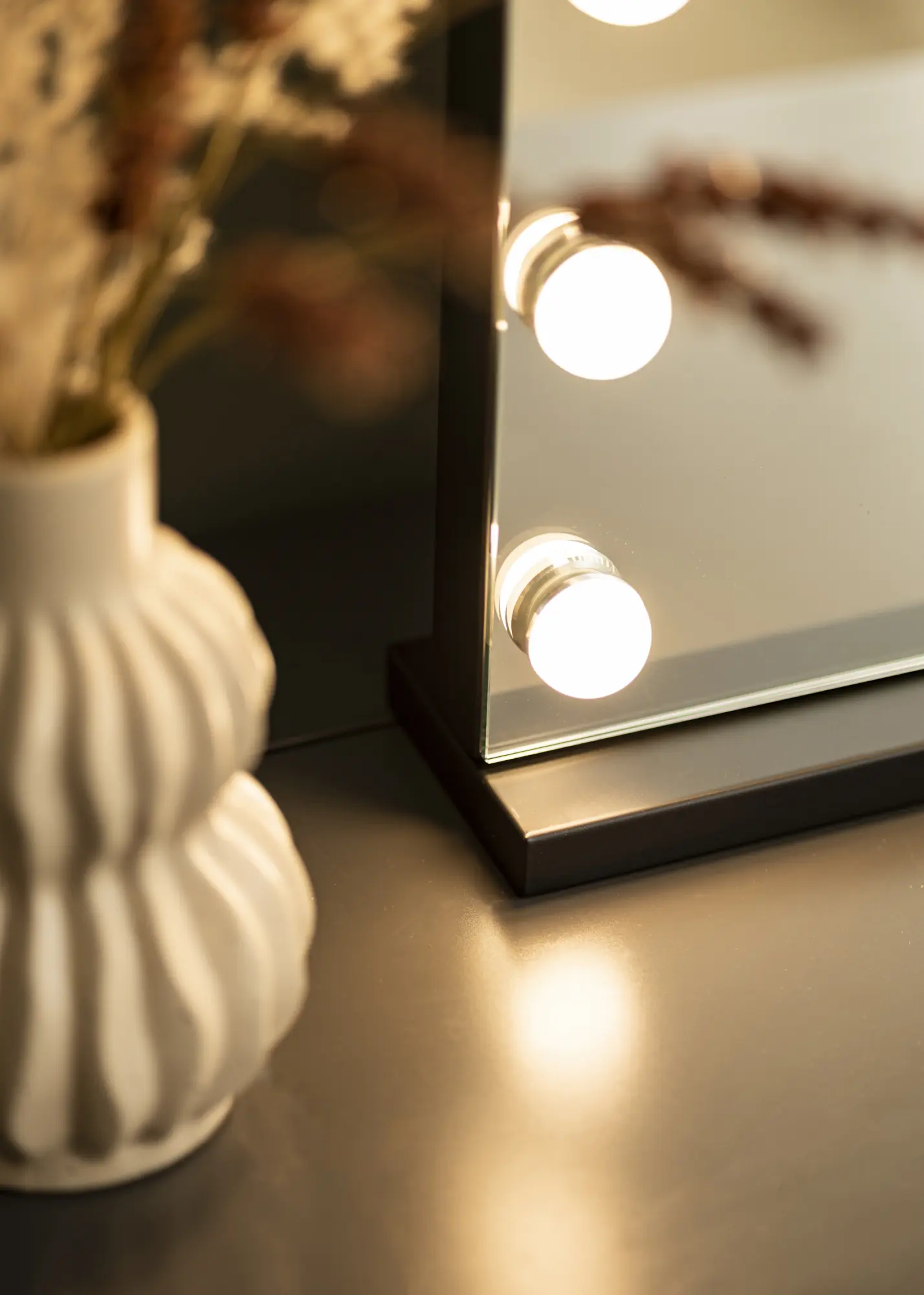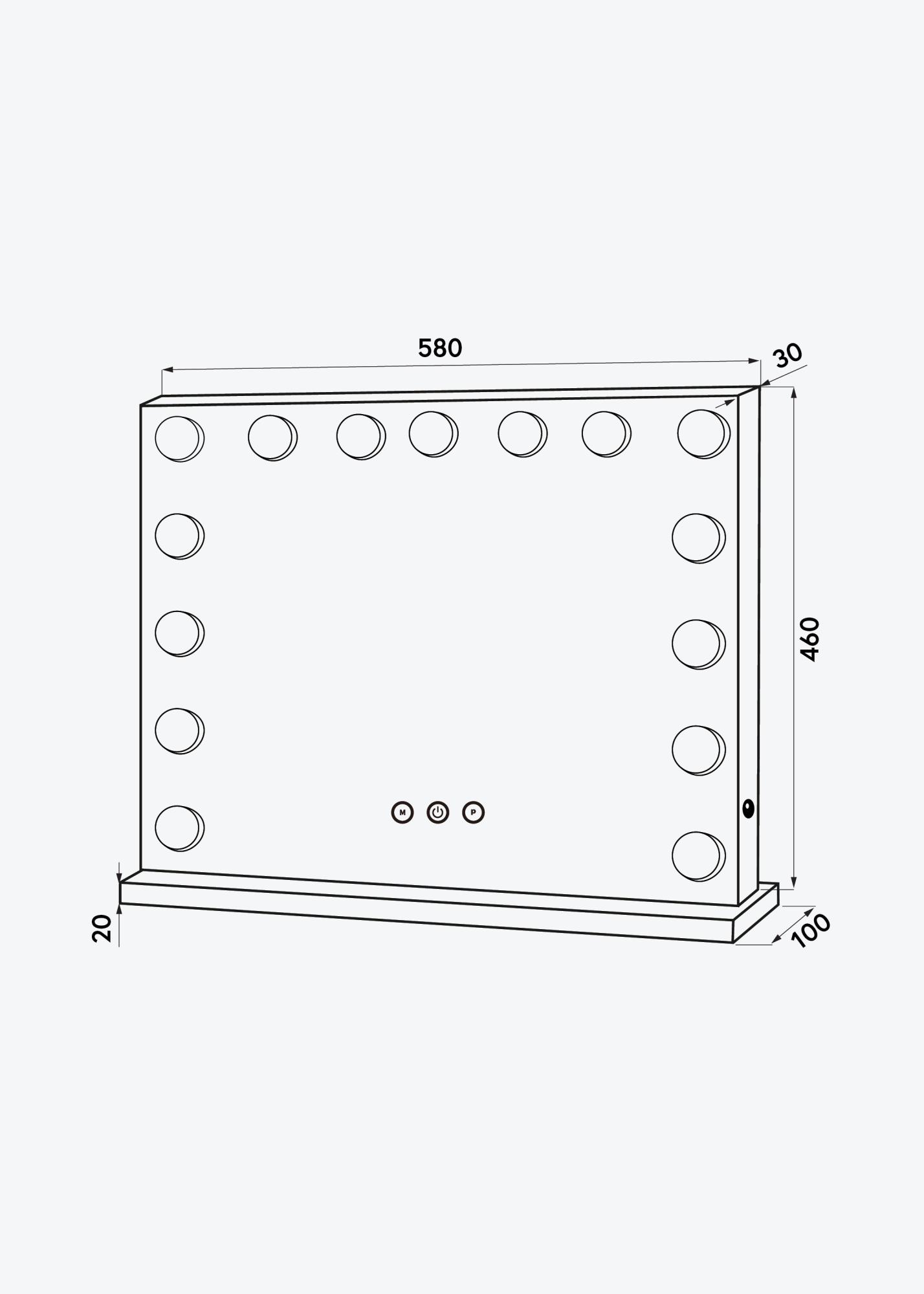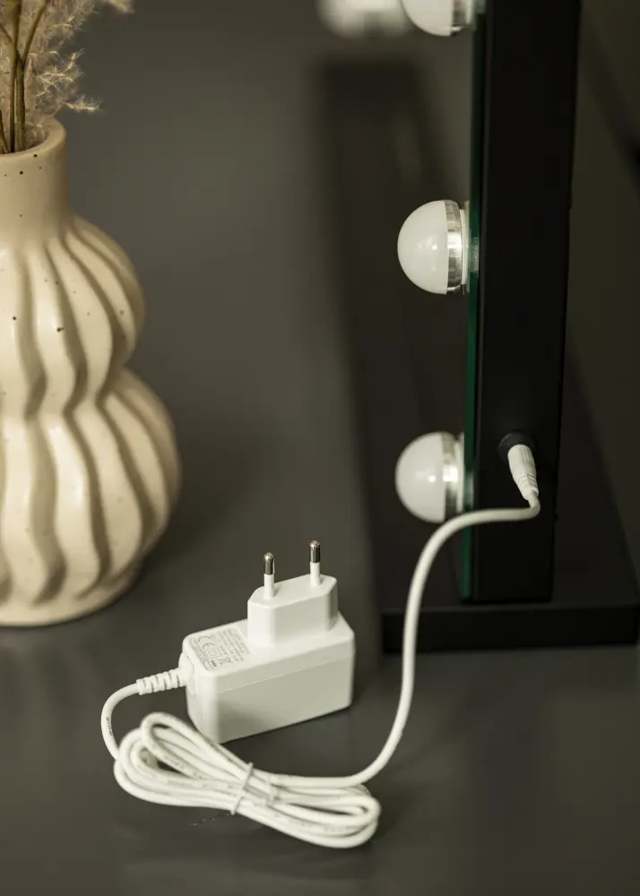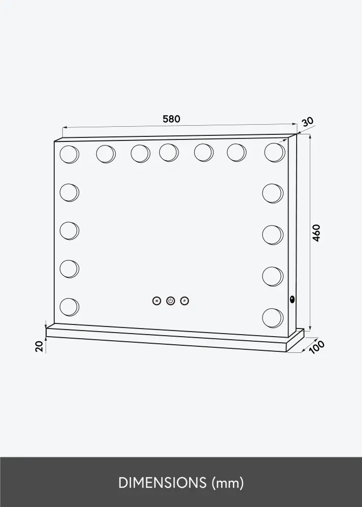 Îmbunătățiți colțul de machiaj, camera de zi sau holul cu o elegantă oglindă de machiaj cu iluminare încorporată! Oglinda nu are o ramă tradițională, ci suprafața oglinzii este încadrată de 15 lămpi LED plasate de-a lungul marginilor oglinzii. Iluminarea este reglabilă și puteți ajusta atât intensitatea luminii, cât și temperatura culorii. Setările de lumină se fac prin intermediul butoanelor tactile de pe muchia inferioară a oglinzii, unde butonul "P" schimbă intensitatea luminii și butonul "M" reglează temperatura culorii. Există, de asemenea, un buton tactil pentru a aprinde sau stinge iluminarea. Conectarea la curent se face prin priză.