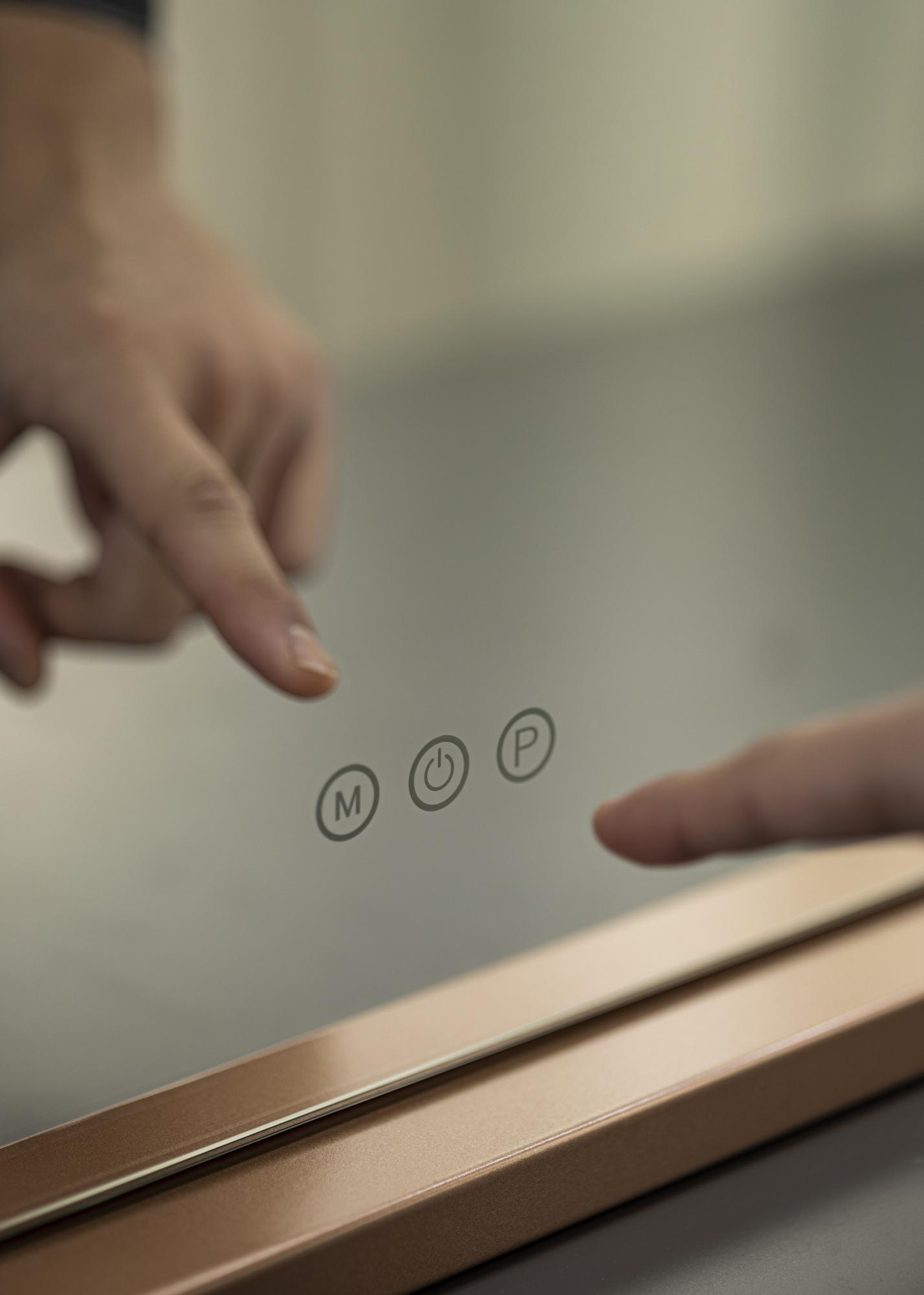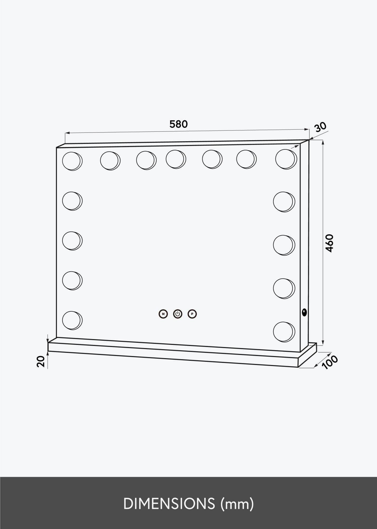 Suprafața oglinzii de machiaj măsoară 58x46 cm și la marginea inferioară a suprafeței oglinzii se află trei butoane tactile. Unul pentru aprinderea și stingerea iluminatului și două pentru a schimba setările de lumină. Ținând apăsat pe butonul "M", poți seta temperatura de culoare a luminii, iar cu ajutorul butonului "P", poți diminua cu ușurință iluminarea la o intensitate dorită. Conectarea la electricitate se face cu ajutorul unei fișe.
