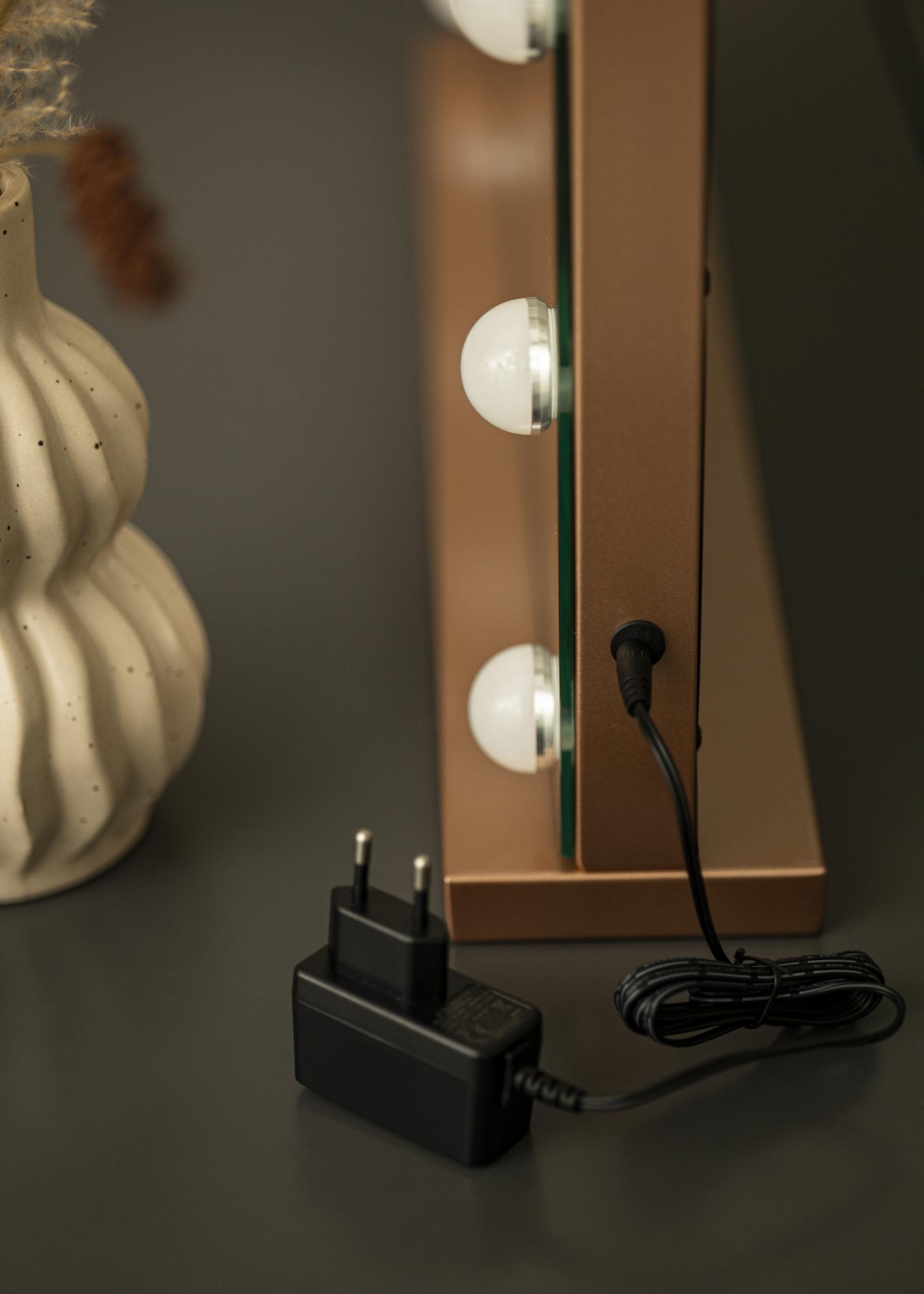 Această oglindă de machiaj va deveni un element decorativ la modă în hol și living – sau poate plănuiești să o așezi pe masa de machiaj pentru a crea un colț de machiaj de lux? Oglinda are un design inspirat de Hollywood cu lămpi LED mari integrate și un suport de culoare aur roz. Suportul poate fi montat și demontat, astfel încât să poți alege dacă dorești ca oglinda ta să stea pe masă sau să fie agățată pe perete.