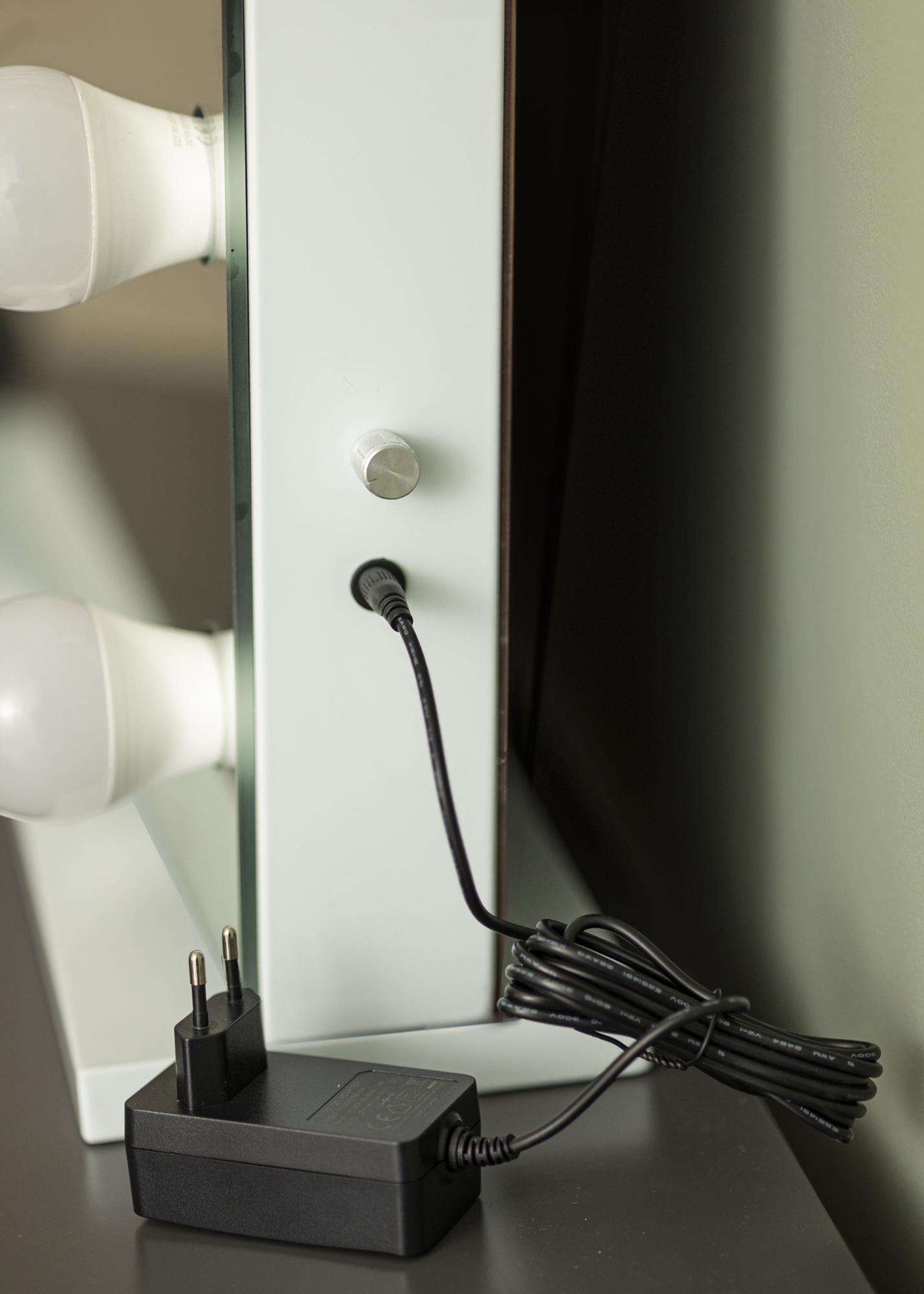 Aceasta este o oglindă de machiaj unică, cu un design care amintește de un vestiar din Hollywood. Suprafața mare a oglinzii de 80x65 cm este încadrată de 14 becuri cu soclu E27. Efectul este o lumină albă, rece și uniformă, potrivită atât pentru machiaj, cât și pentru a fi o sursă de lumină la modă pe masa laterală din sufragerie. Iluminarea este, de asemenea, reglabilă în intensitate, pentru și mai multă flexibilitate. Pur și simplu învârtiți butonul de pe una dintre lateralele scurte ale oglinzii și setați lumina așa cum doriți.