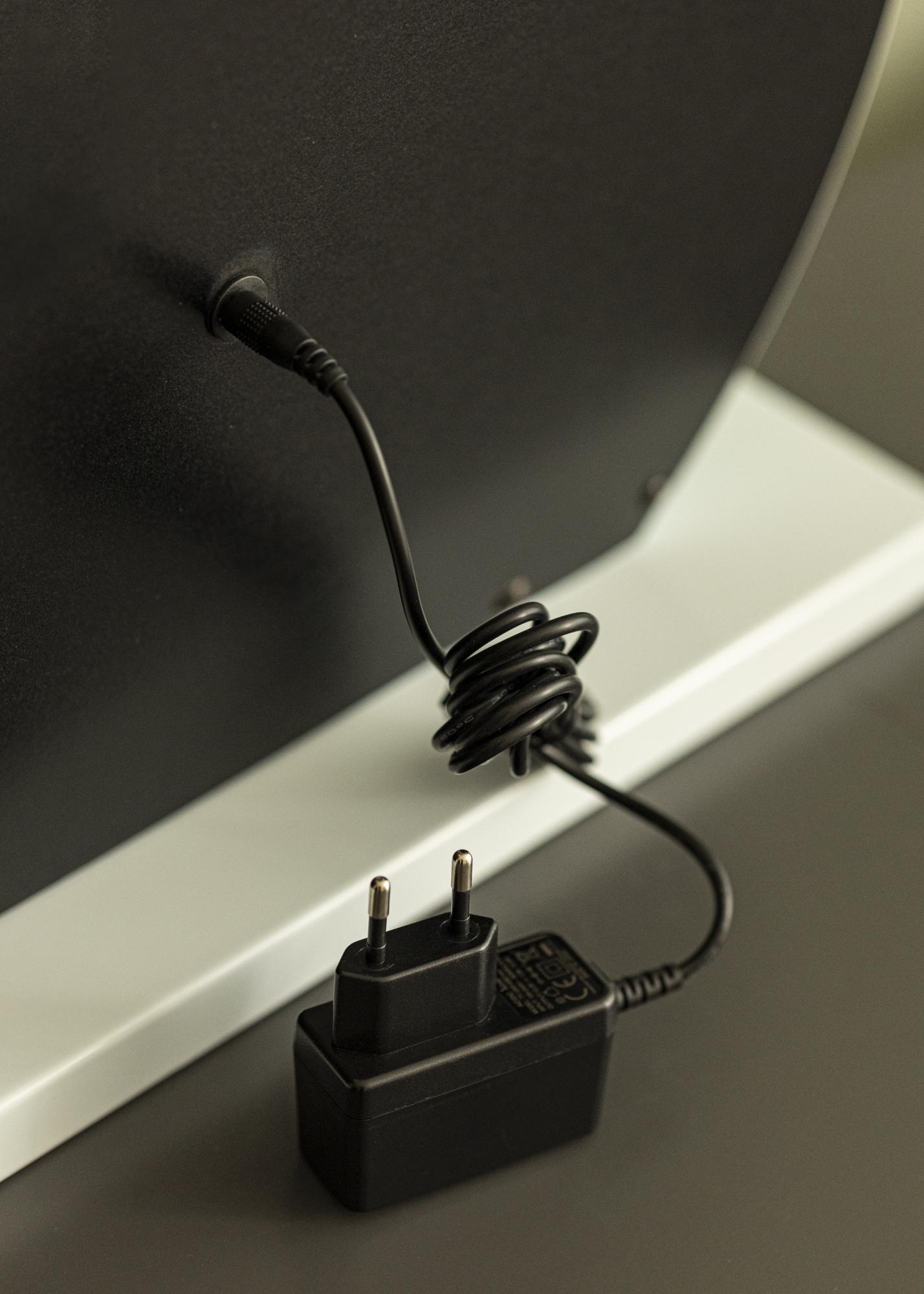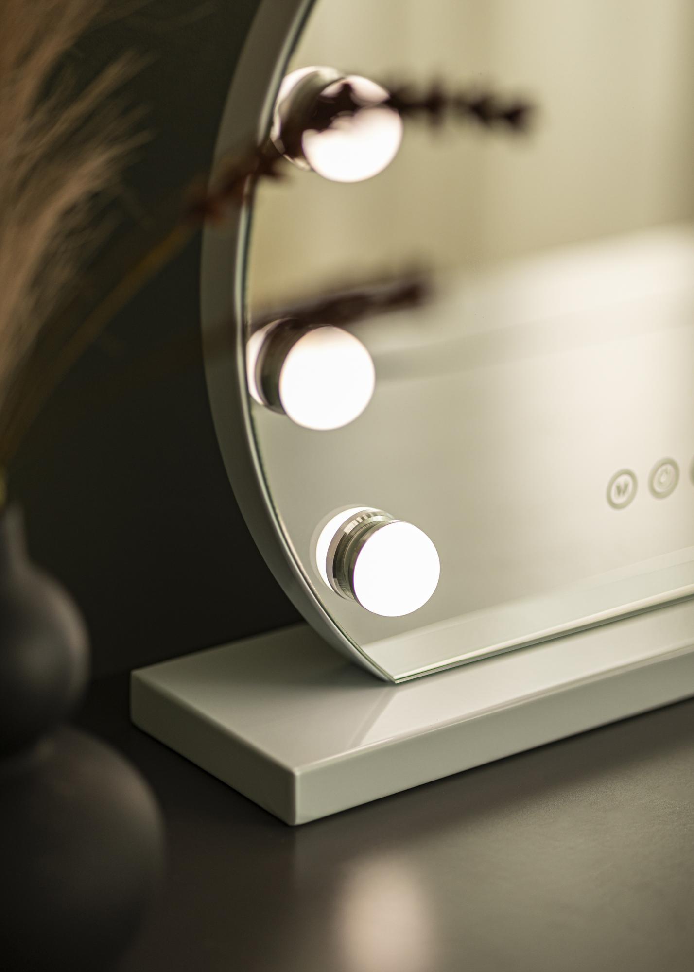 Aceasta este o oglindă de machiaj de lux cu iluminare LED încorporată care oferă o lumină uniformă pe fața ta atunci când te oglindești. Iluminarea constă în 10 lămpi LED amplasate de-a lungul marginii suprafeței oglinzii. Lumina poate fi ajustată după gustul și preferințele tale, având posibilitatea de a seta atât intensitatea luminii, cât și temperatura de culoare. Setările de lumină se fac prin butoanele tactile de pe marginea inferioară a suprafeței oglinzii, care sunt marcate cu litere. Pe butonul marcat cu "M" poți alege temperatura de culoare între lumină caldă, rece și naturală. Butonul marcat cu "P" este utilizat pentru a reduce intensitatea luminii. Există, de asemenea, un buton de pornire/oprire folosit pentru a aprinde sau stinge iluminarea. Conectarea electrică se face cu priză.