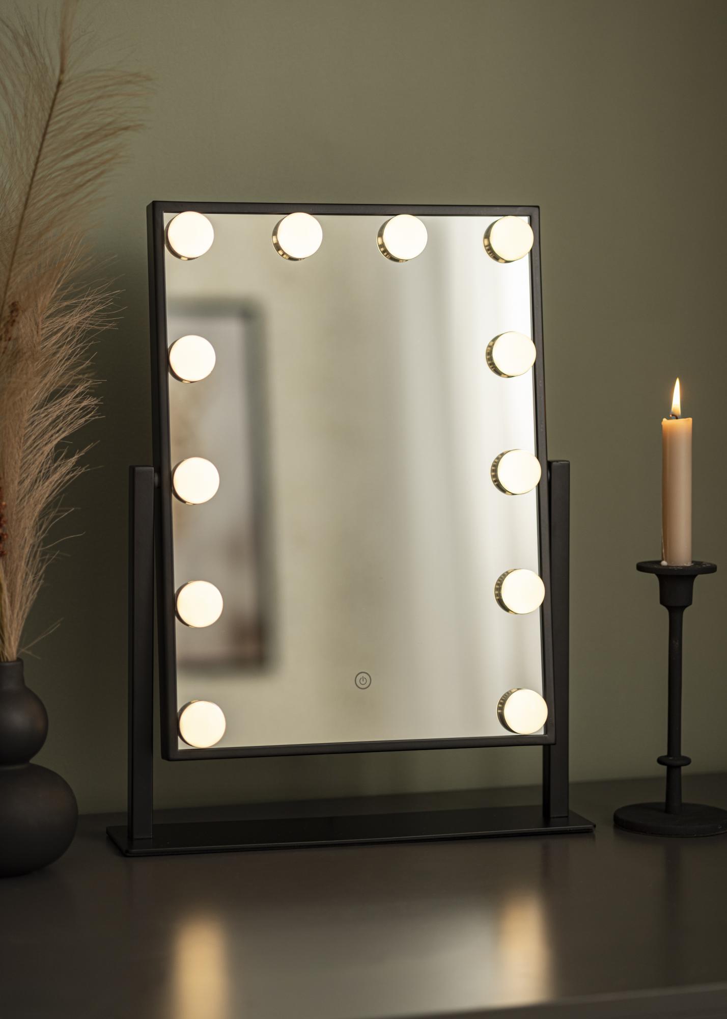 Aceasta este o oglindă de machiaj cu un design luxos și 12 becuri LED decorative într-o nuanță elegantă neagră. Becurile încadrează stilat suprafața generoasă a oglinzii care măsoară 30x40 cm și oferă o lumină albă caldă la 3000K. Iluminarea se aprinde prin apăsarea butonului tactil de pe ecran și are o funcție de diminuare pe care o poți ajusta ușor ținând apăsat butonul câteva secunde. Oglinda poate fi înclinată vertical, astfel încât să te poți machia din unghiul care ți se potrivește cel mai bine. Pe lângă numeroasele sale funcții, această oglindă de machiaj devine un detaliu elegant și creează o adevărată senzație de Hollywood în casa ta!