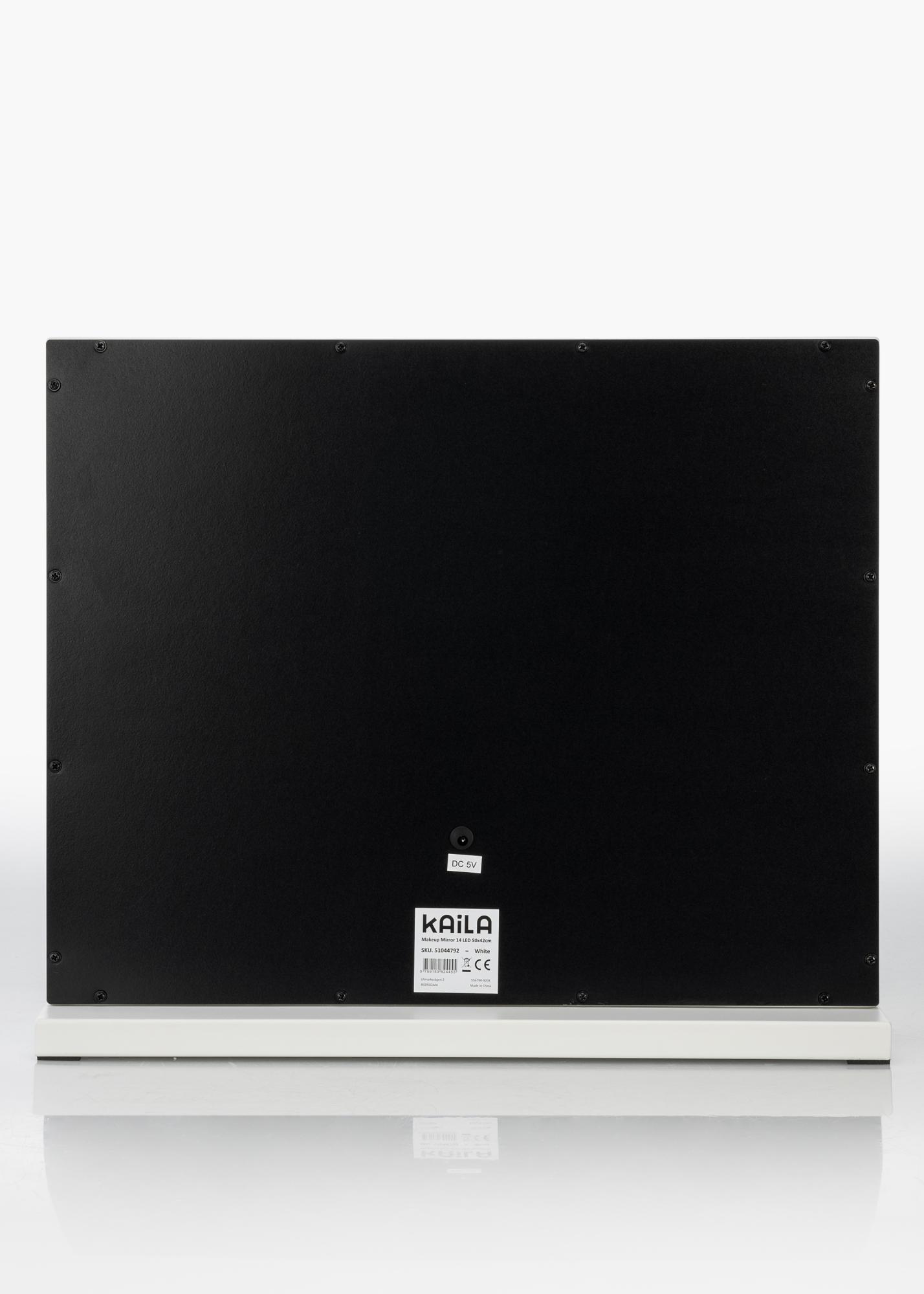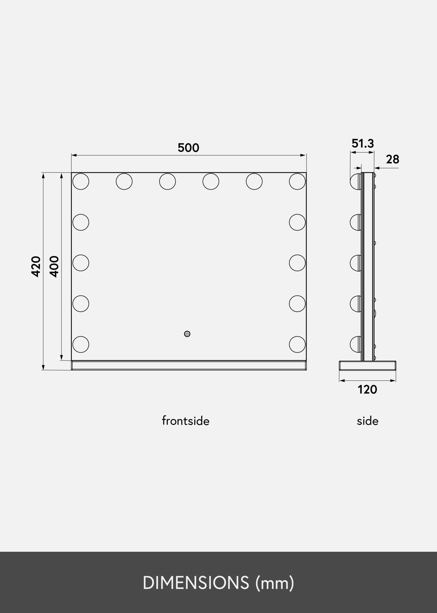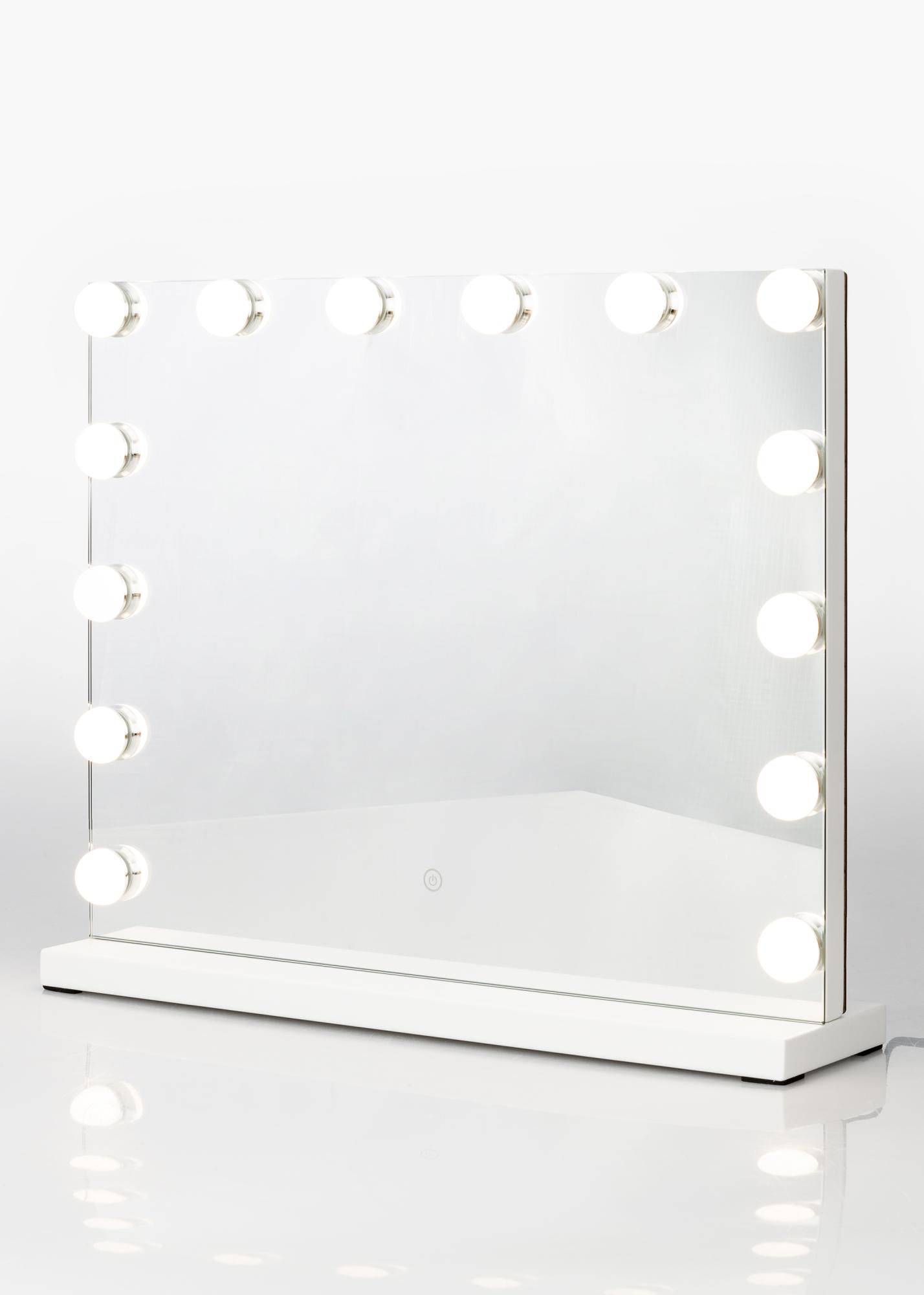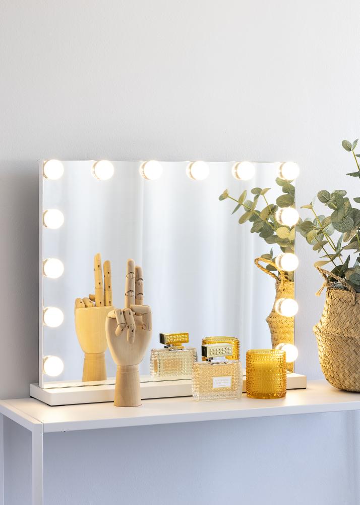 Transformă o cameră într-un studio de machiaj cu această oglindă de machiaj de lux în stil Hollywood de la KAILA! Aceasta este o oglindă mare de machiaj cu iluminare integrată sub formă de 14 becuri LED care încadrează elegant suprafața mare a oglinzii. Iluminarea LED este reglabilă și are o lumină albă caldă de 3000K. Pornirea iluminatului este ușoară prin apăsarea butonului tactil de pe ecran și ajustarea intensității se face prin menținerea apăsată a butonului. Oglinda măsoară 50x45 cm. Conectare la curent electric cu ștekăr.