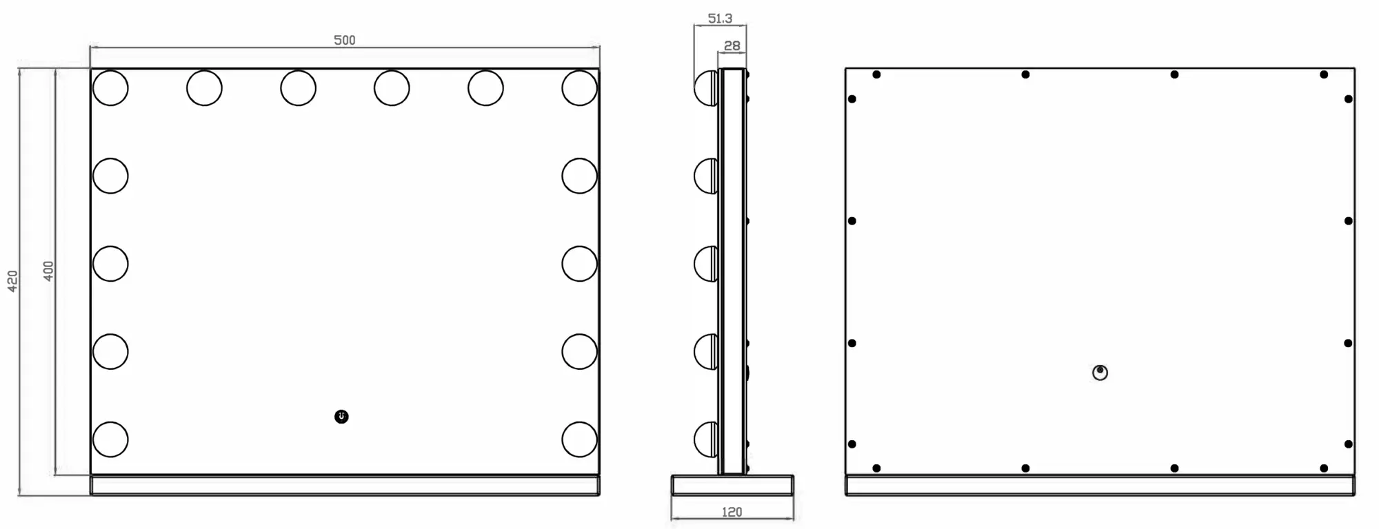 Transformă o cameră într-un studio de machiaj cu această oglindă de machiaj luxoasă în stil Hollywood de la KAILA! Aceasta este o oglindă de machiaj mare cu iluminare integrată sub forma a 14 becuri LED care încadrează elegant suprafața mare a oglinzii. Iluminarea LED este reglabilă și are o lumină albă caldă de 3000K. Iluminarea se aprinde ușor prin apăsarea butonului tactil de pe ecran și intensitatea ei se ajustează simplu prin menținerea apăsată a butonului. Oglinda măsoară 50x45 cm. Conectare la electricitate cu priză.
