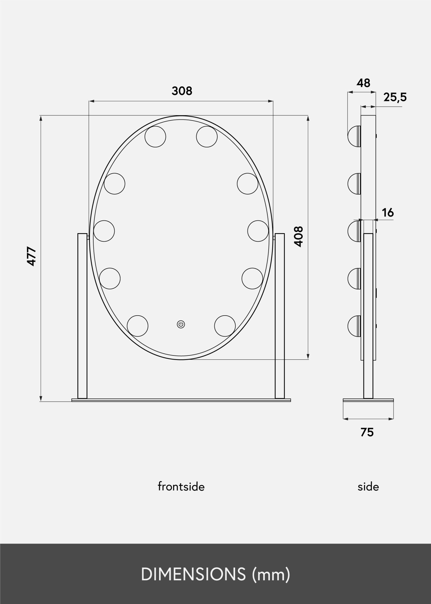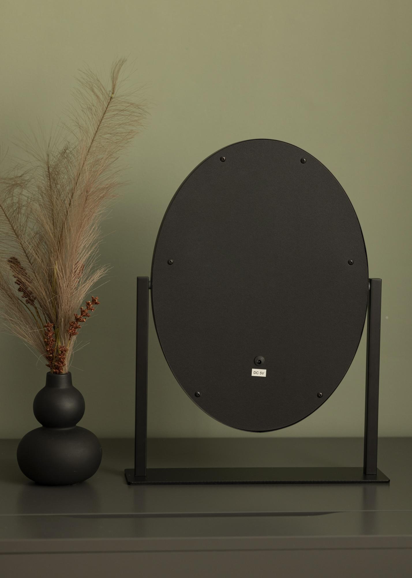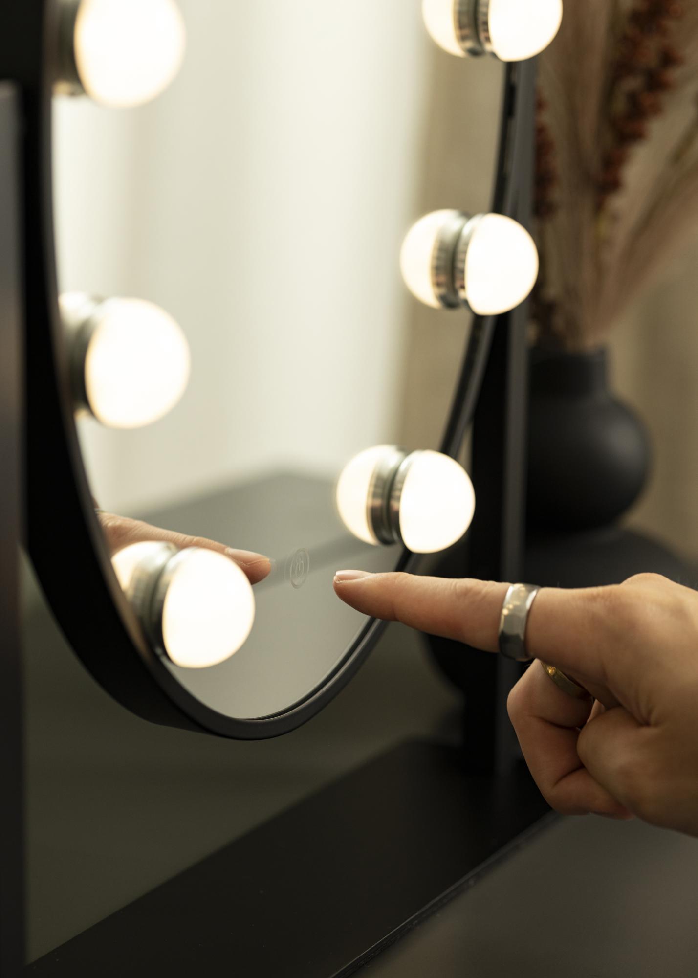 Acesta este o oglindă de machiaj într-o formă ovală elegantă de la brandul suedez KAILA. Oglinda de machiaj are un design negru stilat și are iluminare LED dimabilă integrată. Iluminarea LED sub formă de 10 becuri oferă un ton alb cald uniform la 3000K. Iluminarea se aprinde prin apăsarea butonului tactil și intensitatea este ușor de ajustat prin menținerea butonului apăsat câteva secunde. LED-ul este o sursă de lumină eficientă energetic cu un iluminat natural perfect pentru aplicarea machiajului. Oglinda de machiaj măsoară 34x47 cm și poate fi rotită la 360° vertical, ceea ce vă permite să vă oglindiți din diferite unghiuri. Designul atemporal și plin de farmec creează o atmosferă de Hollywood în casa dumneavoastră!