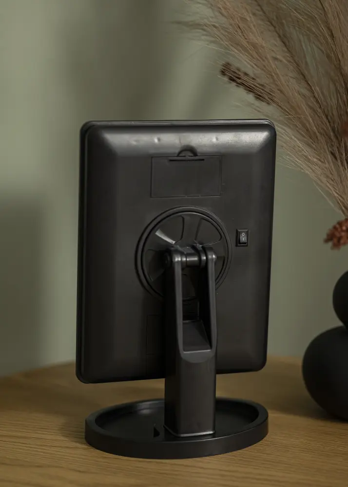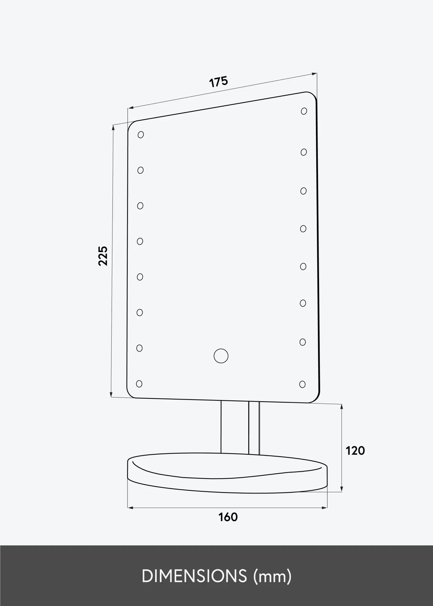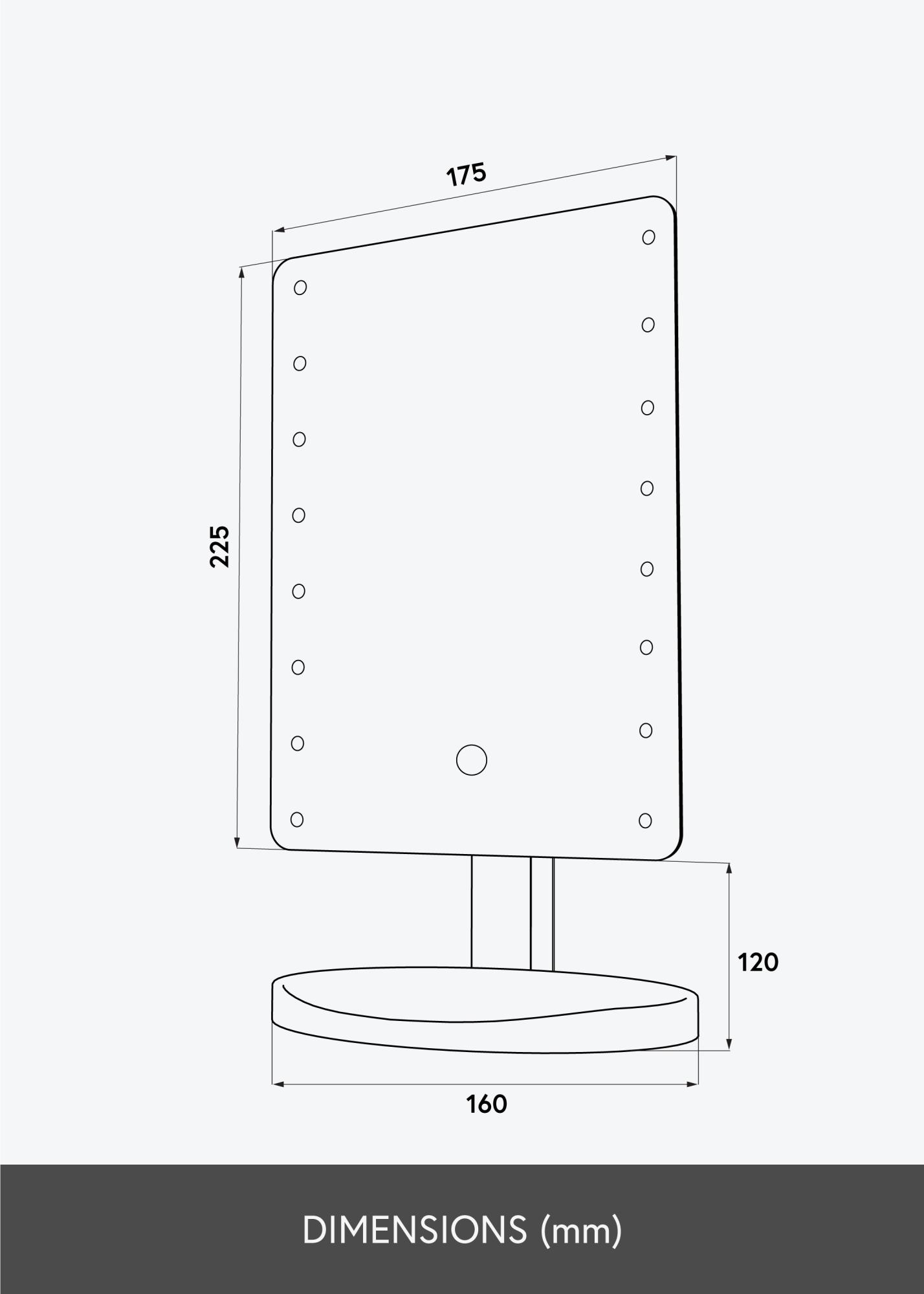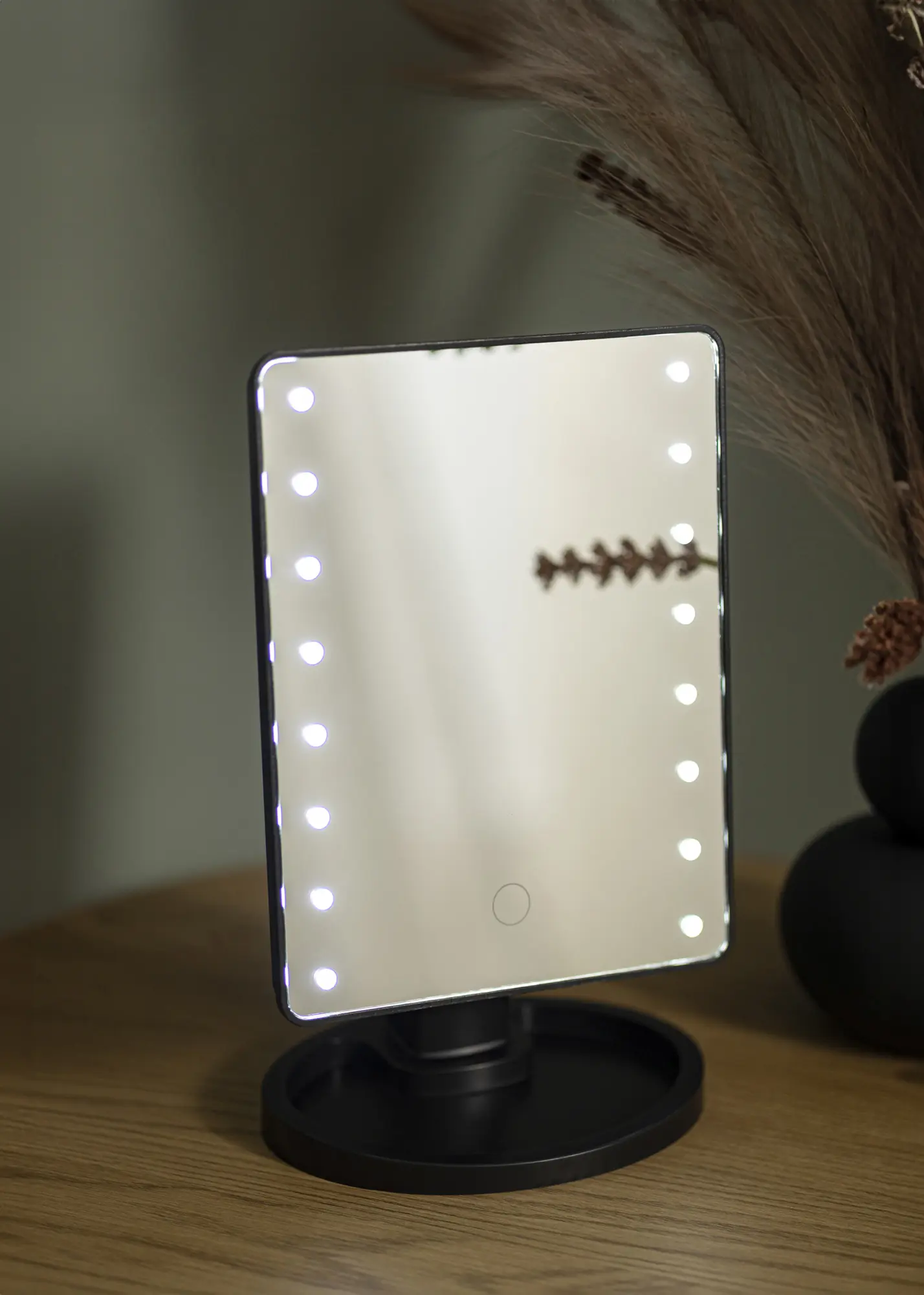 Aceasta este o oglindă de machiaj elegantă pe suport, echipată cu iluminare LED integrată care încadrează suprafața oglinzii de 17,5x22,5 cm. Designul stilat cu o culoare neagră neutră face ca oglinda să fie un element de decor atrăgător care se potrivește bine în orice cameră. Oglinda se poate înclina, ceea ce este perfect atunci când dorești să aplici machiajul și să te pregătești pentru zi. Formatul portabil face ca oglinda să fie ușor de transportat.