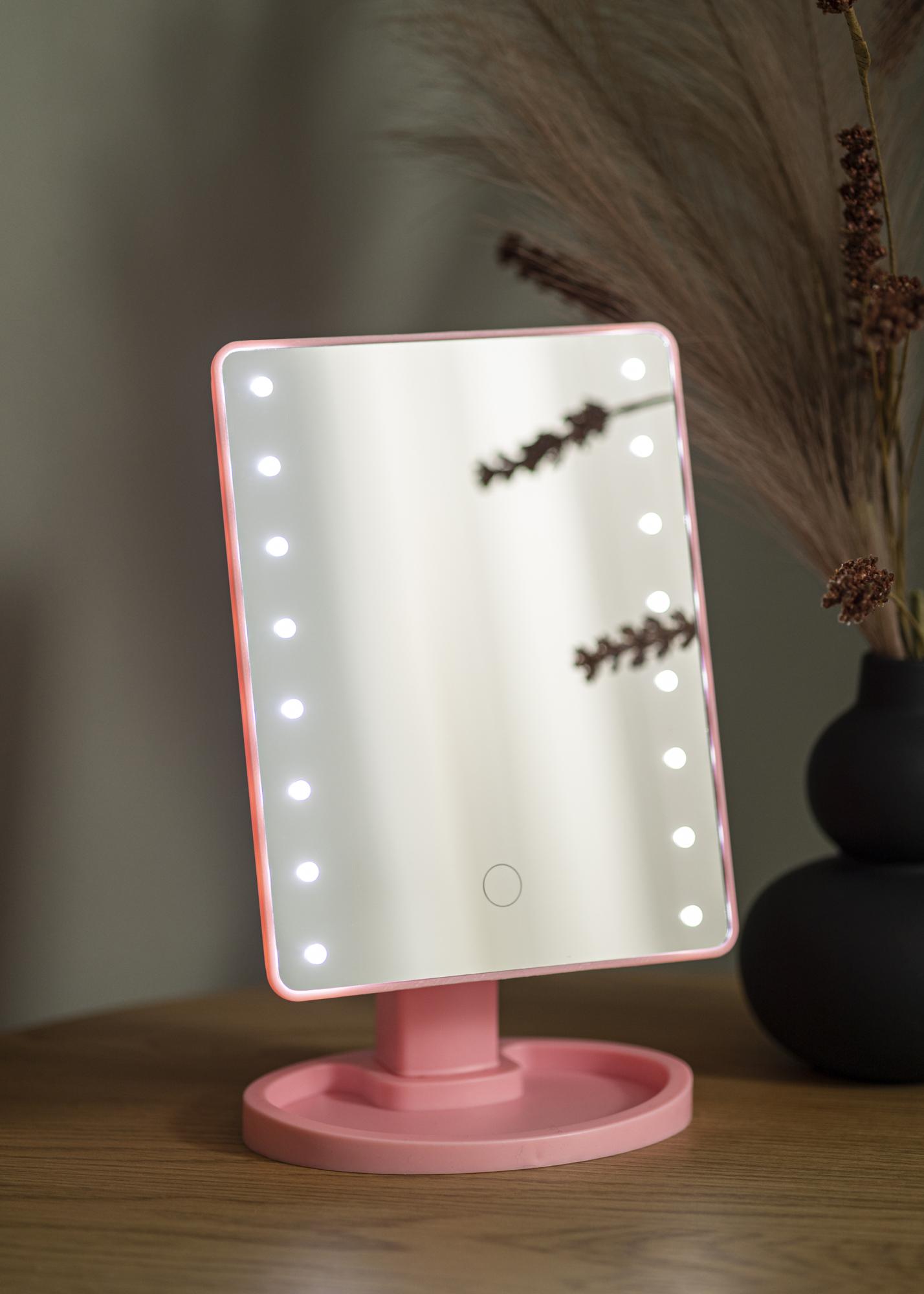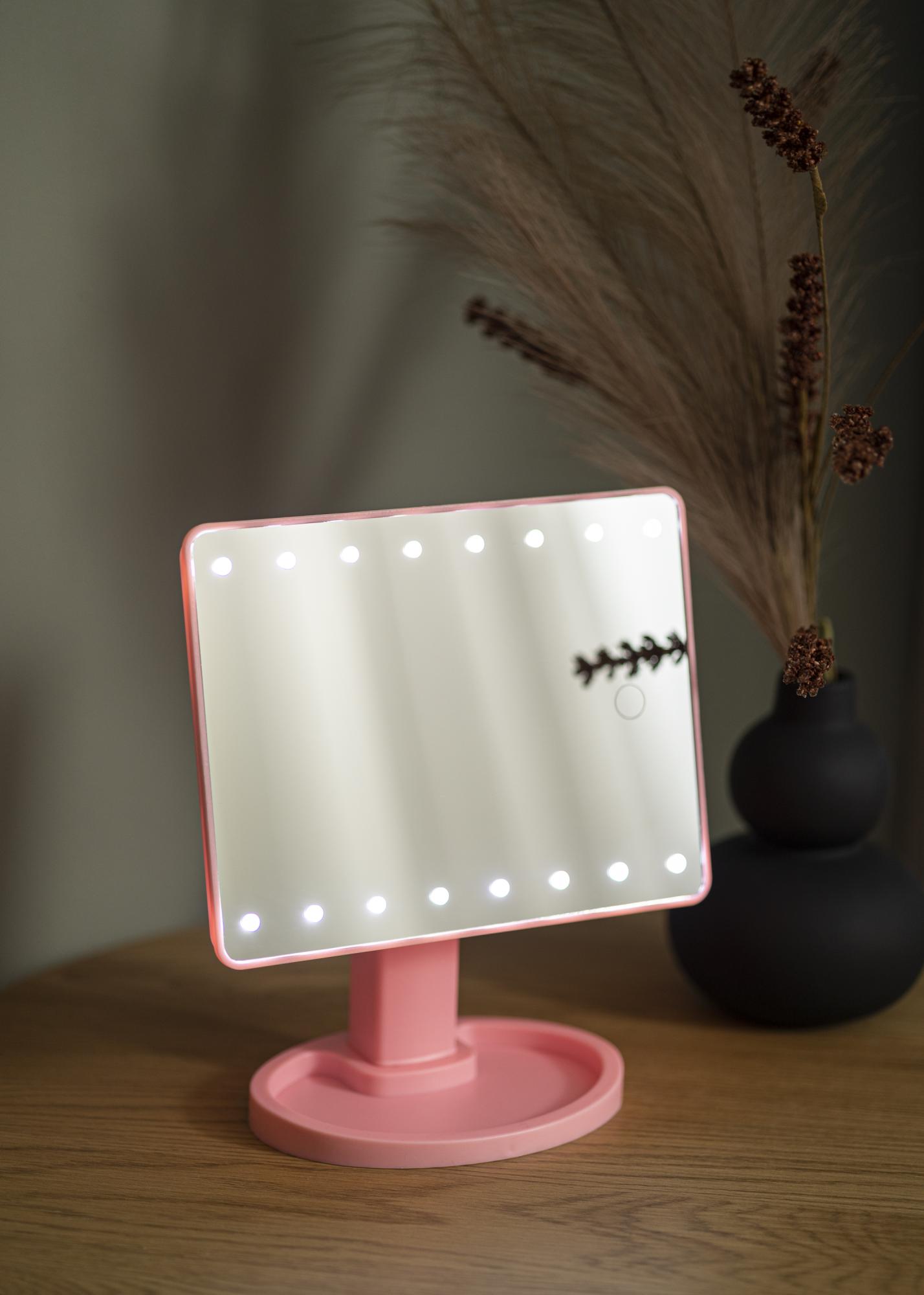 Această oglindă de machiaj este o alegere excelentă pentru cei care doresc o oglindă mai mică într-un model elegant. Nuanța roz aduce o pată de culoare plăcută, în timp ce iluminarea LED integrată oferă o lumină albă uniformă, rece, atunci când te oglindești. Porniți oglinda cu ajutorul butonului de pornire de pe spatele aparatului. Iluminarea poate fi de asemenea reglabilă, astfel încât să poți seta intensitatea luminii pe care o preferi. Pentru a ajusta lumina, țineți apăsat butonul tactil de pe partea din față.