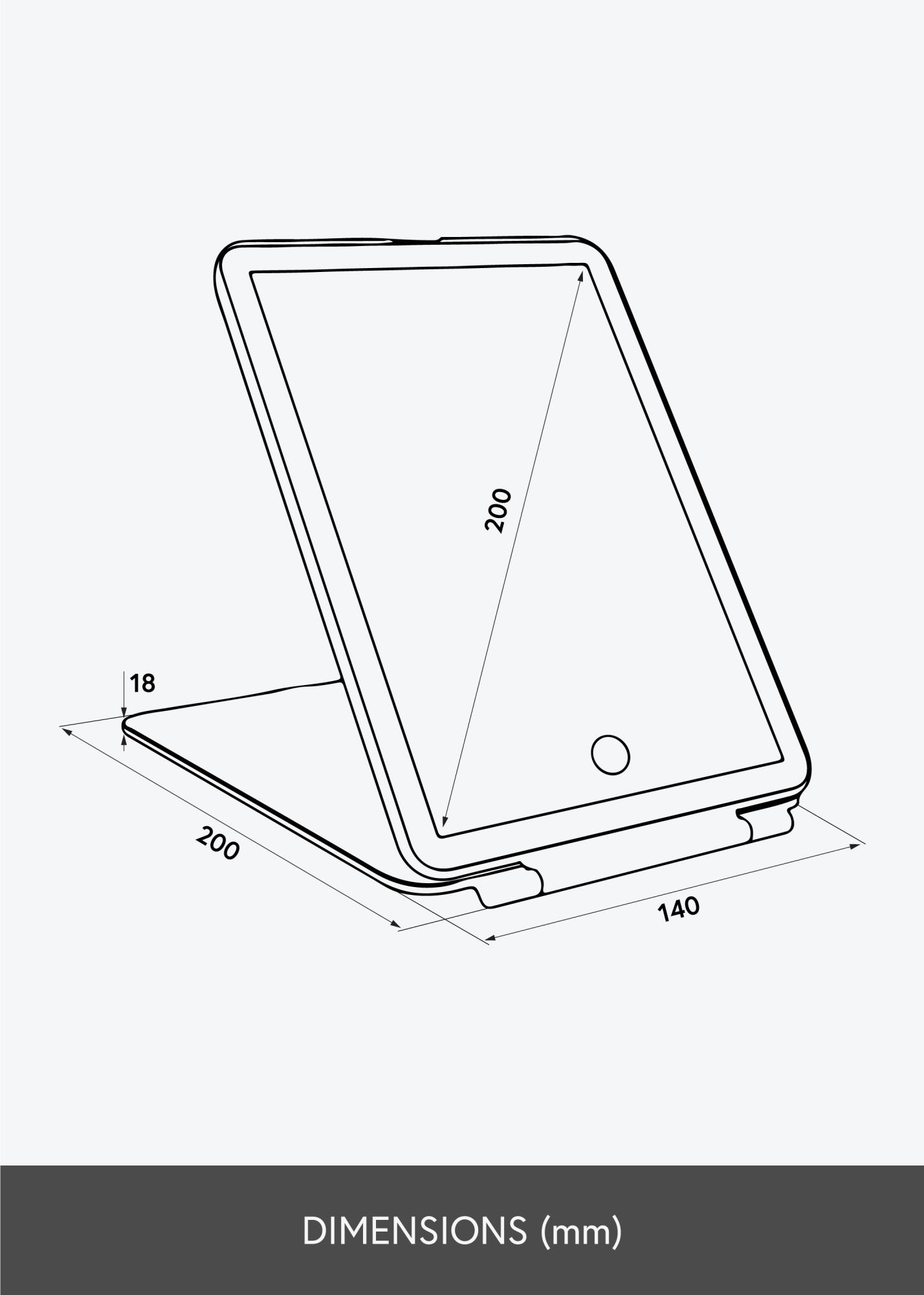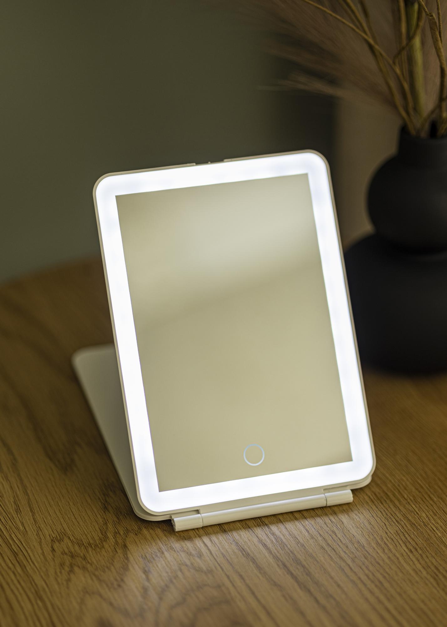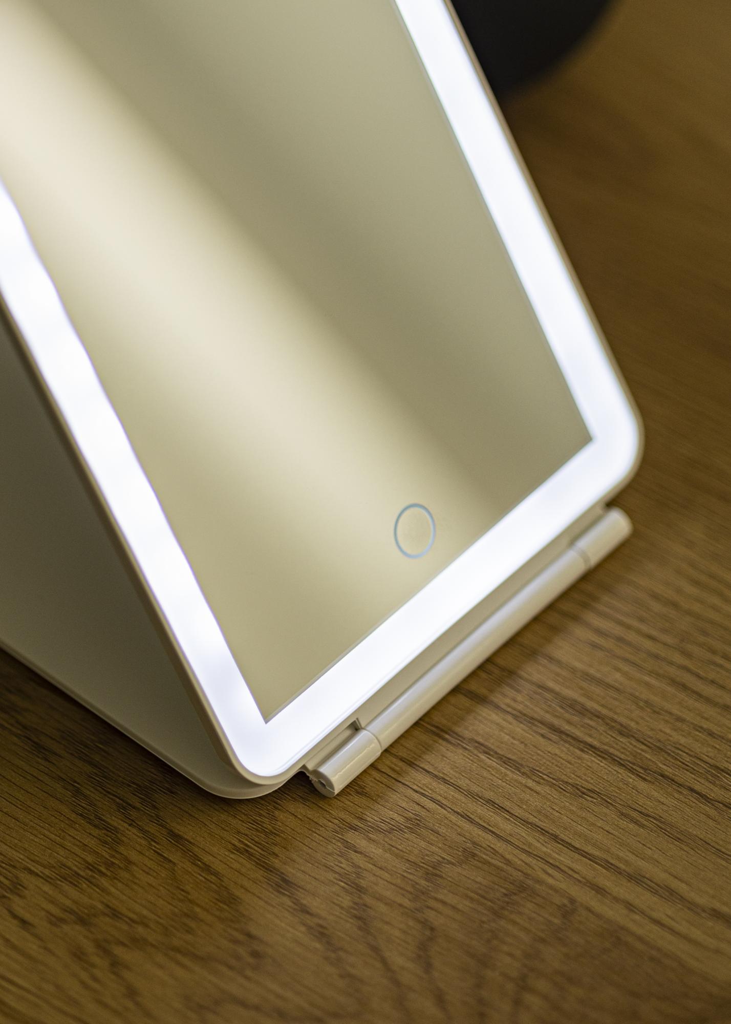 Aceasta este o oglindă albă cu iluminare LED încorporată, care oferă o lumină plăcută pe fața ta. Este alimentată cu baterii și se încarcă ușor prin conexiune USB atunci când bateria începe să se descarce. Cablu pentru încărcare inclus. Oglinda se aprinde printr-un buton tactil pe suprafața oglinzii, cu care poți, de asemenea, să reglezi iluminarea. Prin menținerea apăsată a butonului pentru câteva secunde poți atât să diminuezi lumina cât și să setezi temperatura de culoare.