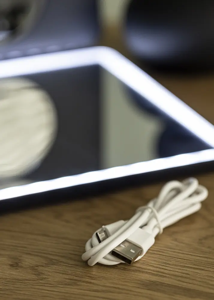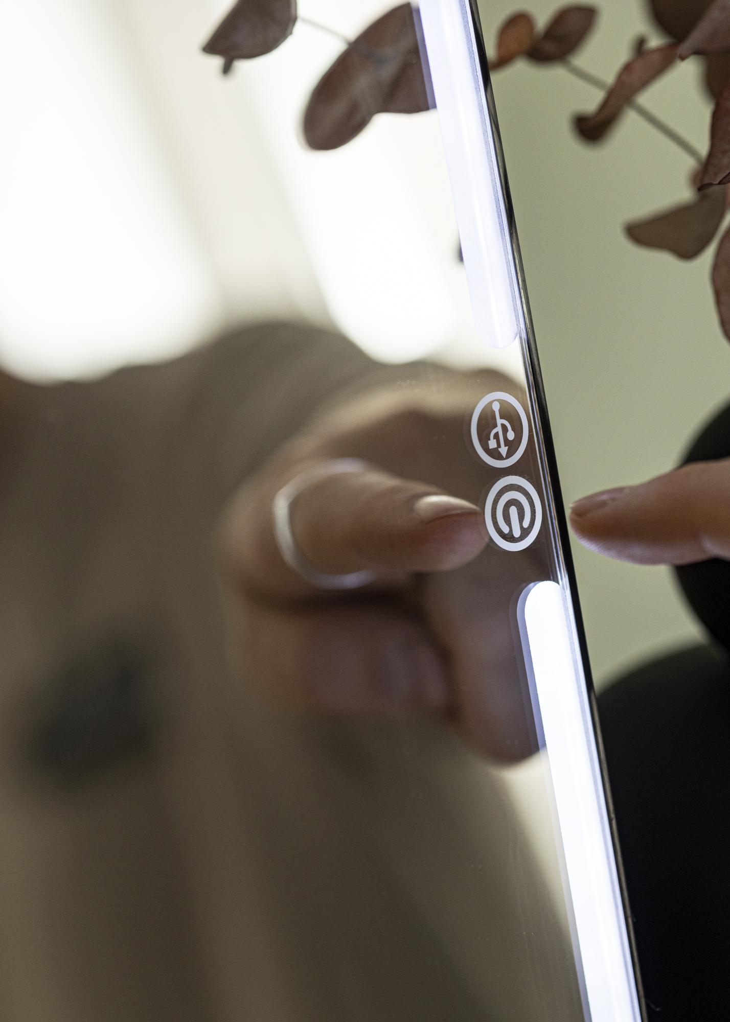 Această oglindă de machiaj are o culoare neagră elegantă și iluminare LED integrată. Iluminarea se ajustează cu ajutorul butoanelor tactile de pe rama oglinzii, cu care pornești și oprești, de asemenea, oglinda. Dacă închizi oglinda în timp ce este pornită, aceasta intră automat în modul de economisire a energiei, pentru a începe să lumineze din nou atunci când redeschizi oglinda. Oglinda funcționează pe baterie și se încarcă prin conexiune USB.
