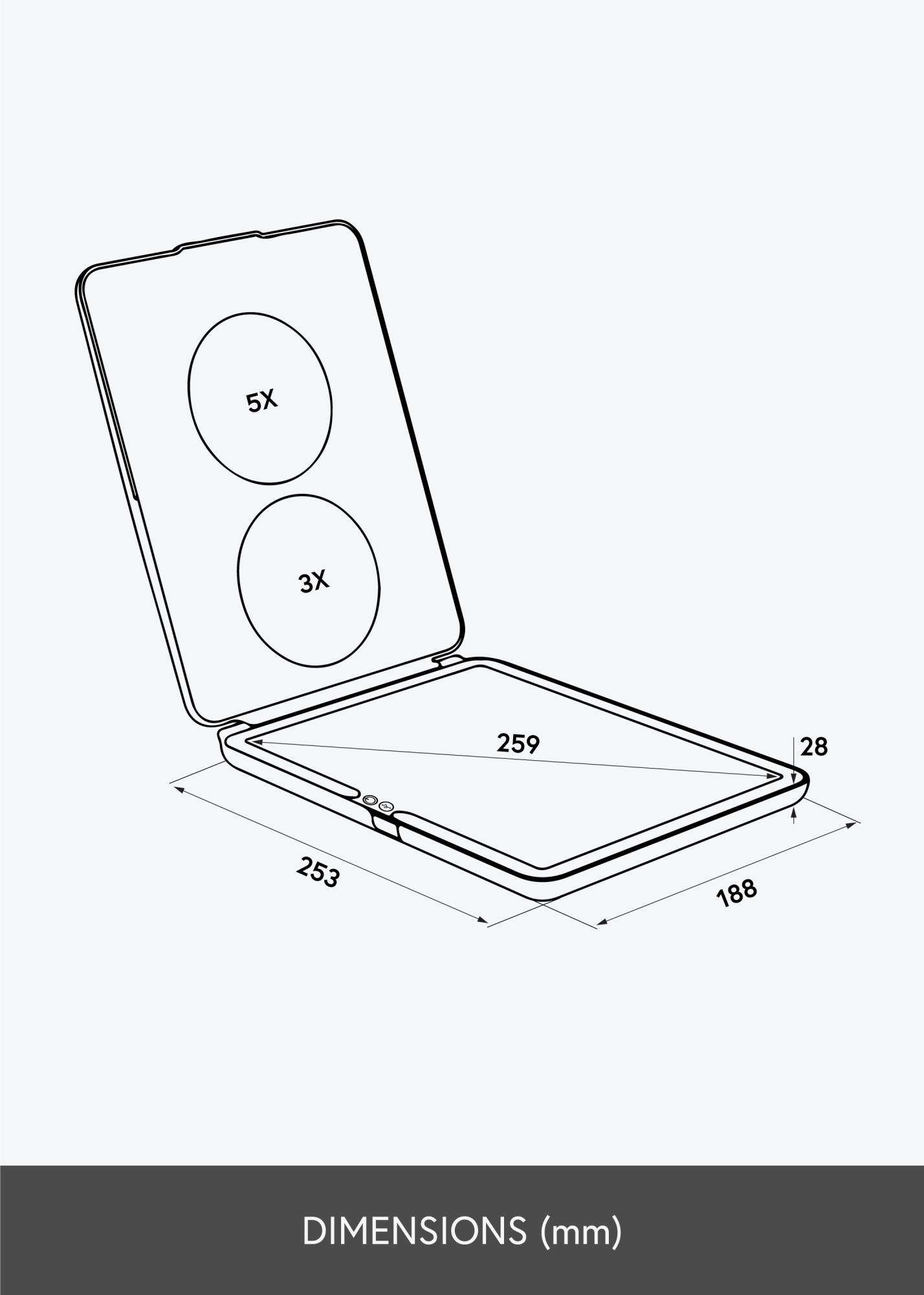 Dorești o oglindă de machiaj în format de călătorie care să se potrivească perfect în geantă? Atunci această oglindă de machiaj compactă este o alegere bună! Oglinda are o suprafață de oglindă de 18,5x25 cm și un design pliabil care protejează oglinda de murdărie și praf. Designul pliabil îți permite, de asemenea, să înclini oglinda în timpul utilizării. În afară de sticla de oglindă obișnuită, oglinda are o zonă cu zoom de 5x și o zonă cu zoom de 3x.