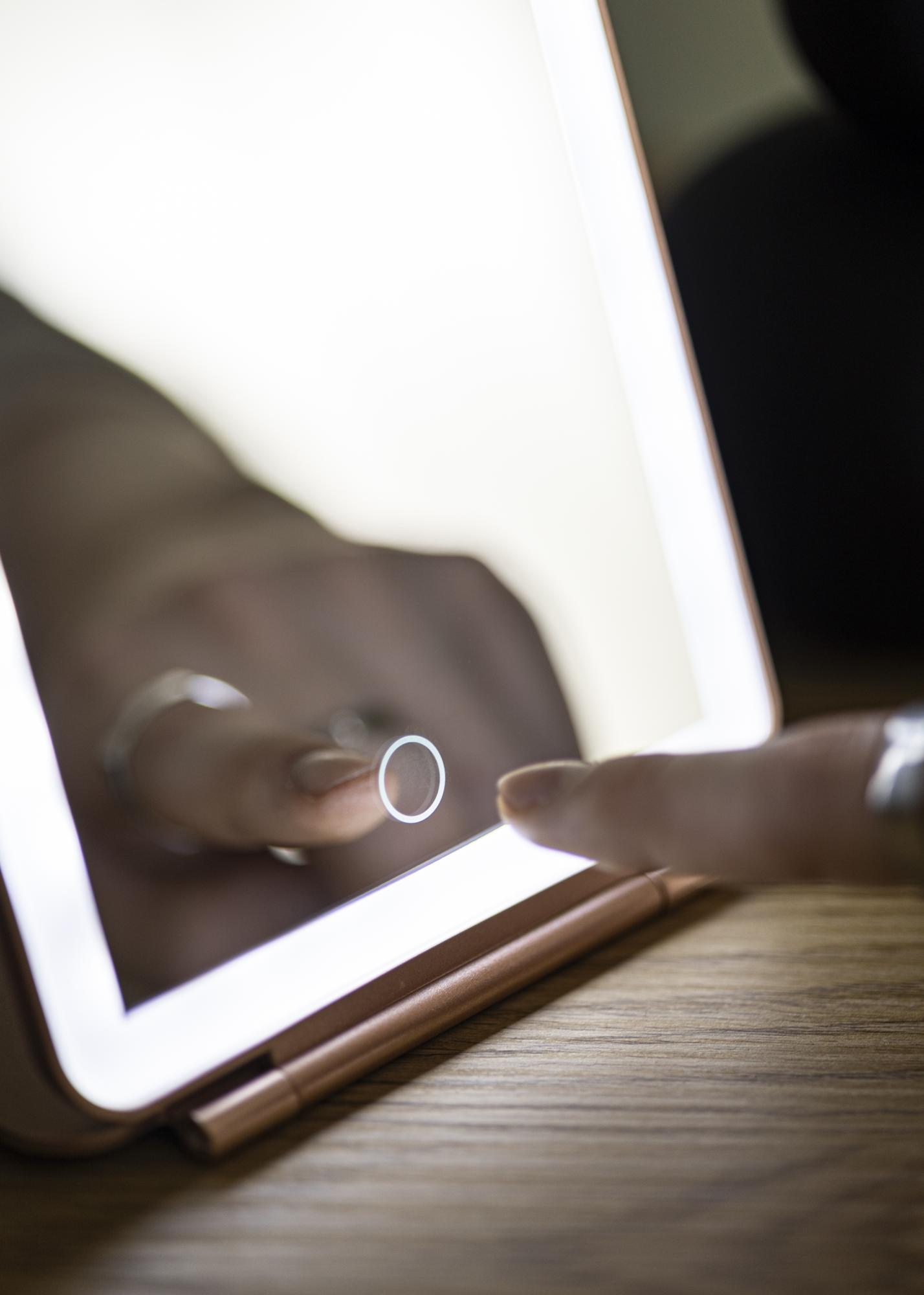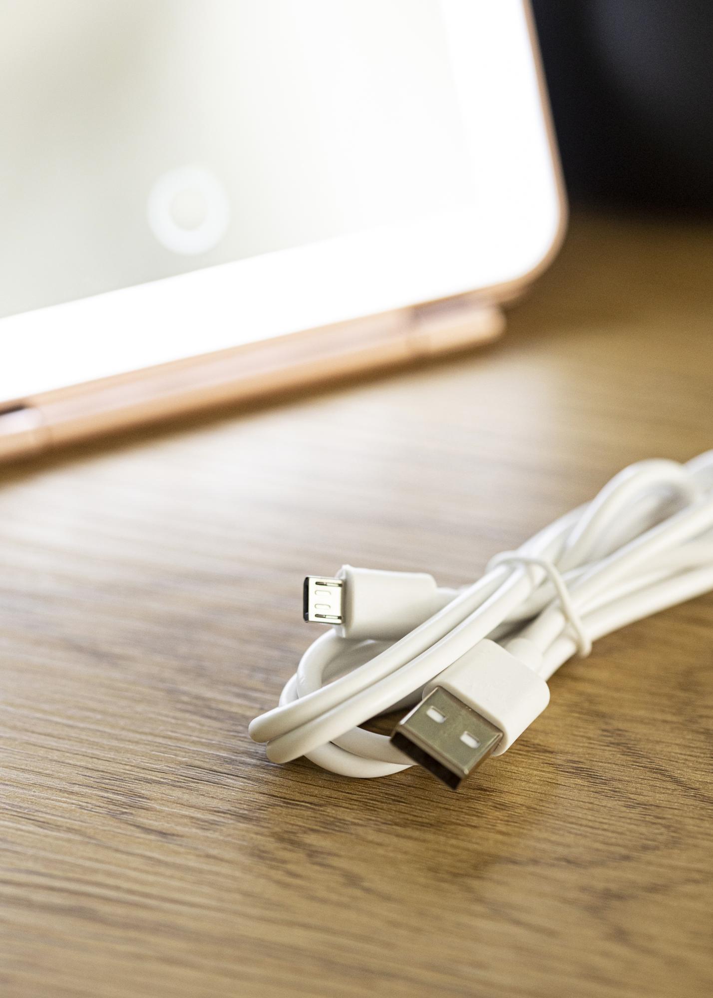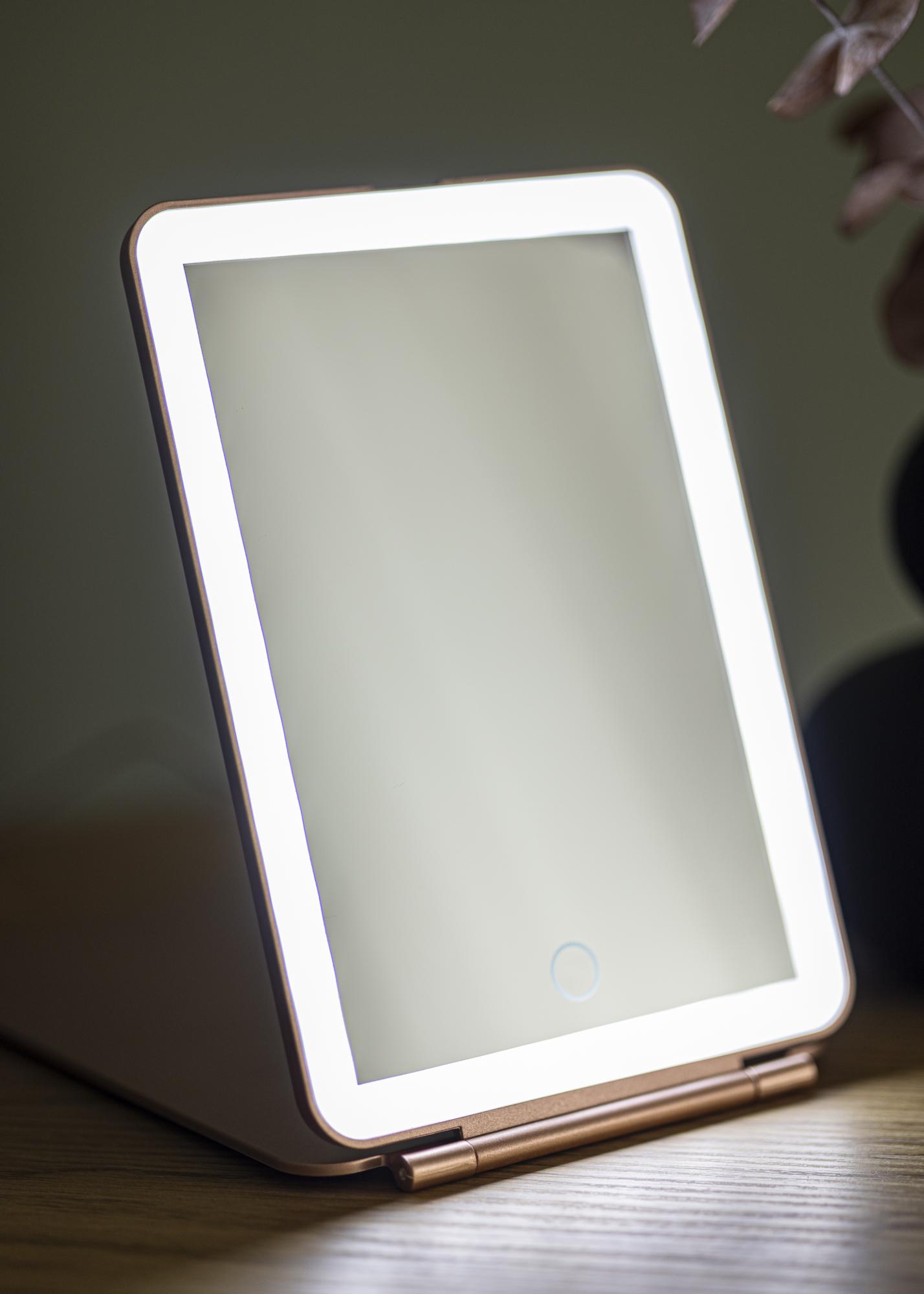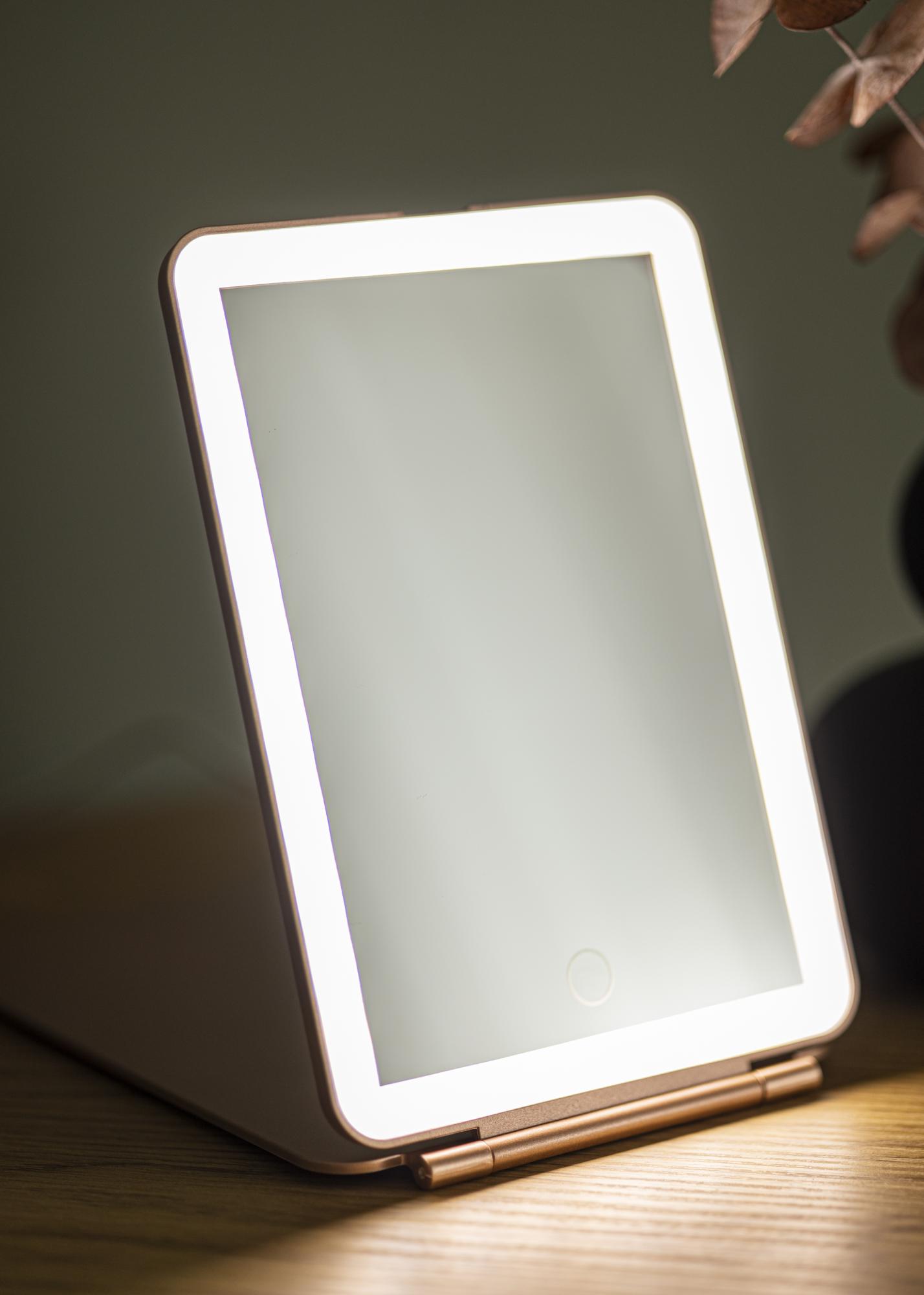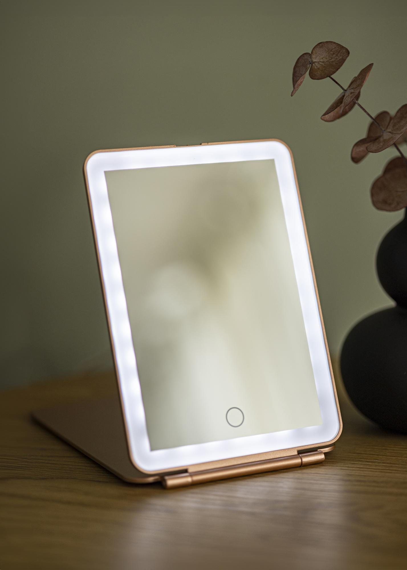 Această oglindă de machiaj la modă, de culoare roz auriu, va deveni tovarășul tău fidel în toate călătoriile. Designul pliabil îți permite să setezi oglinda în unghiul pe care îl preferi - și o poți chiar plia complet atunci când nu este utilizată. În plus, oglinda are iluminare LED integrată, care este o sursă de lumină eficientă din punct de vedere energetic și care nu necesită înlocuire în timp. Dacă bateria acestei oglinzi începe să se descarce, aceasta se reîncarcă prin conexiune USB. Aprinzi oglinda cu ajutorul unui buton tactil pe partea frontală a oglinzii. Există, de asemenea, un buton tactil pentru reglarea iluminării, pe care îl poți ține apăsat pentru a diminua lumina și a seta temperatura culorii.