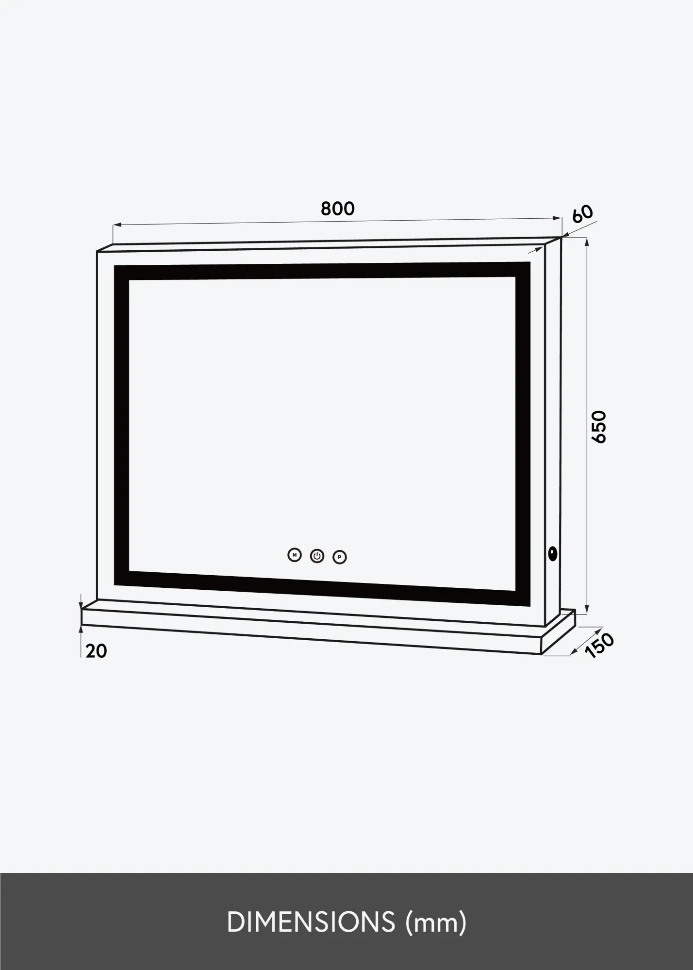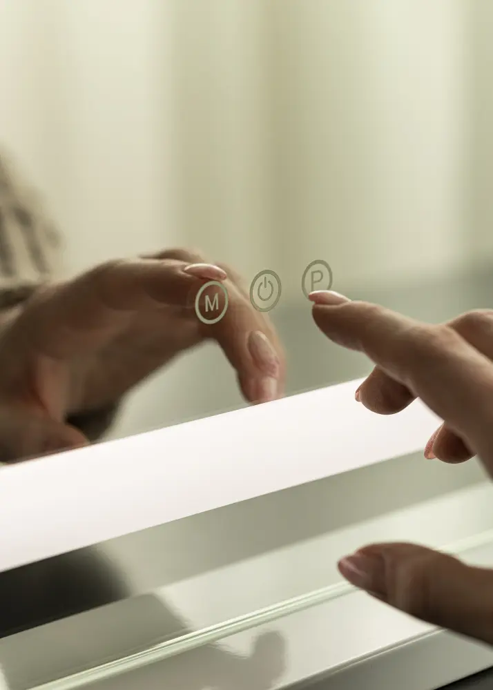 Oglinda este echipată cu o funcție avansată de atingere. Cu o simplă atingere poți aprinde și ajusta intensitatea luminii, precum și schimba temperatura culorii luminii cu ajutorul butoanelor marcate "M" și "P" de pe partea frontală. Această oglindă de machiaj combină astfel nu doar estetica cu utilizarea practică, dar este și eficientă din punct de vedere energetic datorită tehnologiei sale LED. Sursele de lumină sunt proiectate să dureze pe întreaga durată de viață a produsului, cu o intensitate luminoasă care se estimează că va menține 50% din intensitatea sa originală chiar și după 50.000 de ore, făcând această oglindă o alegere durabilă și de încredere pentru orice casă.