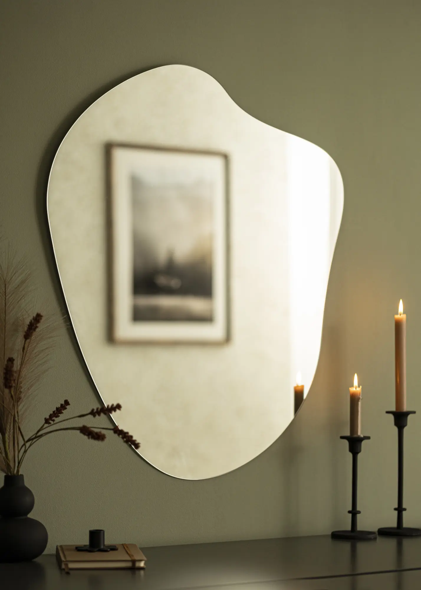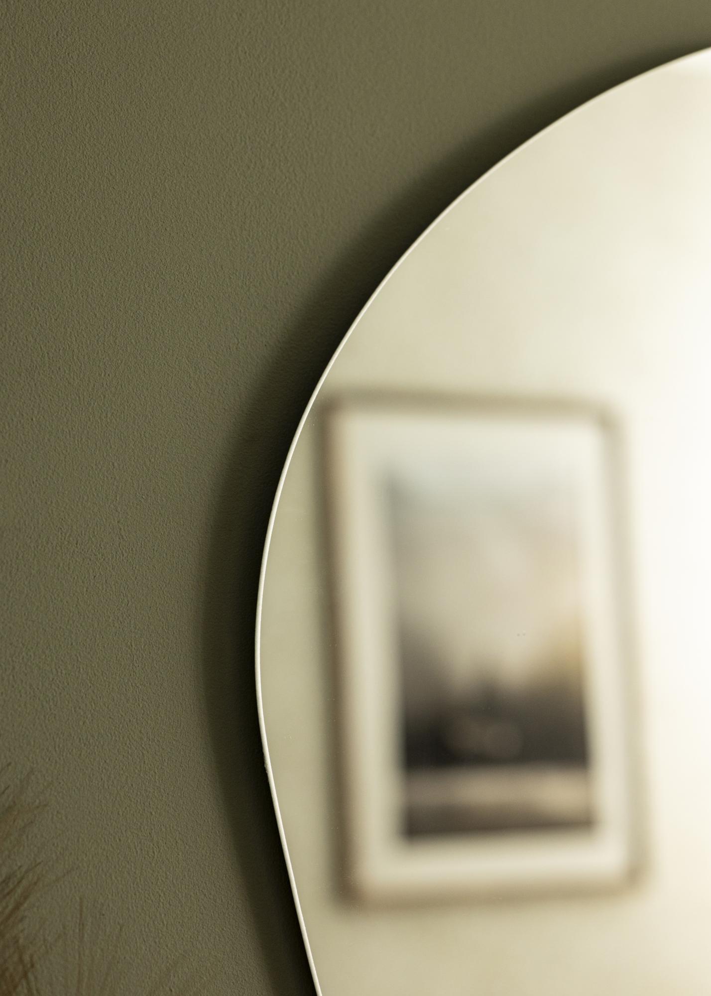 Lăsați această oglindă de perete la modă să devină un detaliu de design interior captivant care reflectă frumos lumina de la ferestre și lămpi. Forma sa unică și lipsa unei rame îi conferă oglinzii aspectul său caracteristic, care este atât modern cât și minimalist.