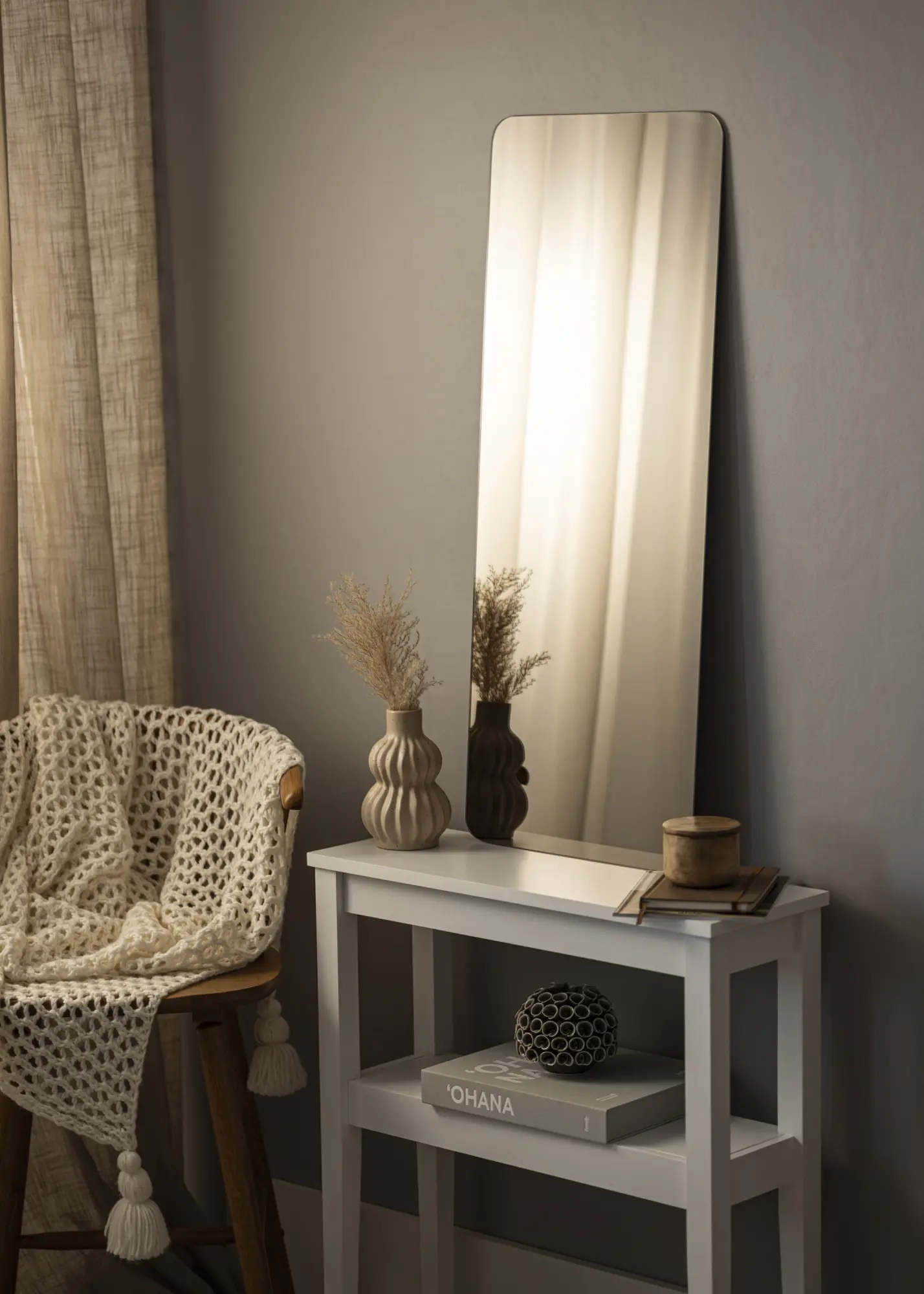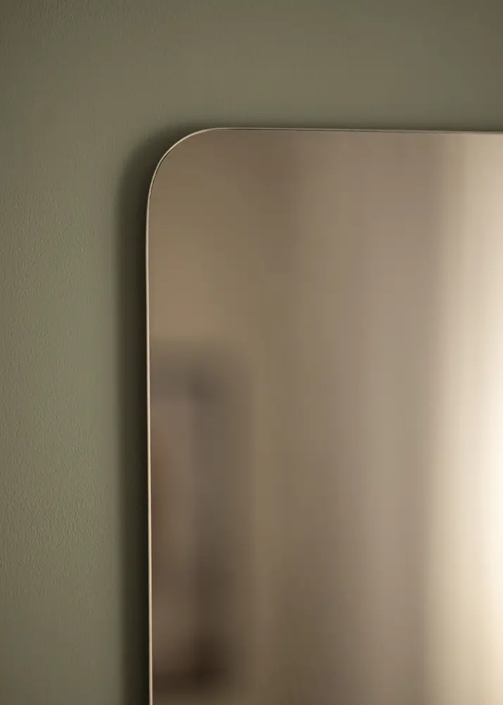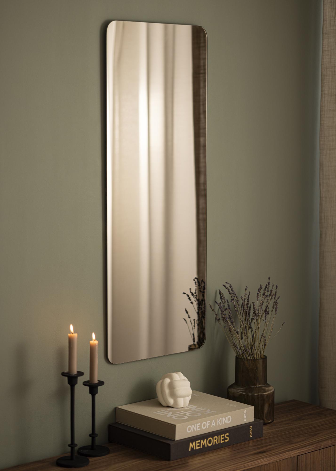 Aceasta este o oglindă dreptunghiulară cu colțuri rotunjite decorative care îi conferă un aspect moale și elegant. Sticla oglinzii este colorată într-o nuanță elegantă de bronz închis, făcând această oglindă un element decorativ impresionant și la modă în casa ta. Oglinda este, de asemenea, foarte subțire și nu are ramă, ceea ce contribuie și mai mult la senzația sa elegantă și stilată.