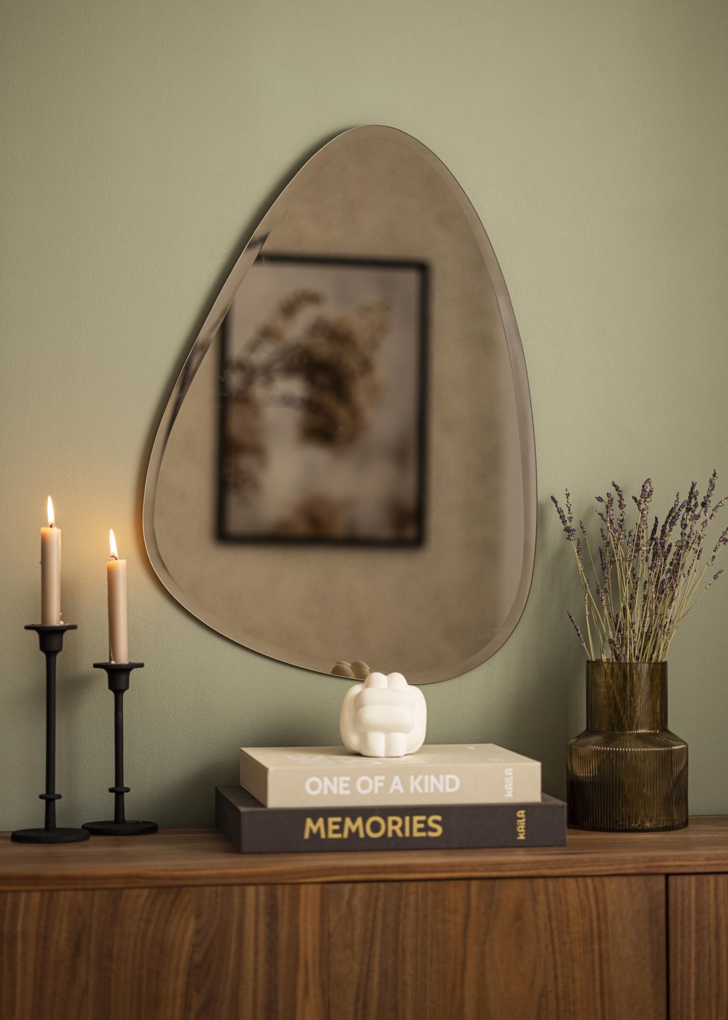 Aceasta este o oglindă de perete asimetrică de la KAILA, cu sticlă de oglindă tonată în bronz modern. O oglindă cu sticlă mai închisă devine un detaliu dramatic ce se potrivește excelent în casele moderne. Oglinda subțire nu are ramă. În schimb, marginile suprafeței oglinzii sunt decorate cu un contur elegant fațetat.