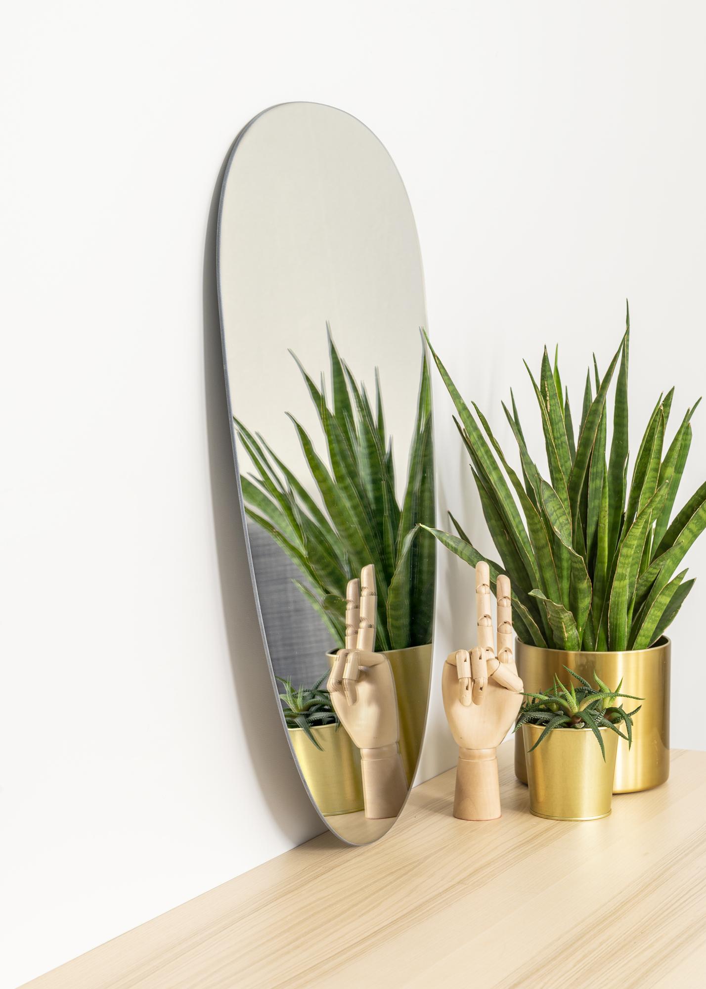 O oglindă elegantă și interesantă ca aceasta va aduce un element modern în decorul casei tale! Oglinda are o formă moale și asimetrică, care poate fi descrisă ca neregulat ovală. Oglinda este, de asemenea, foarte subțire și nu are ramă, ceea ce subliniază și mai mult aspectul elegant al oglinzii.