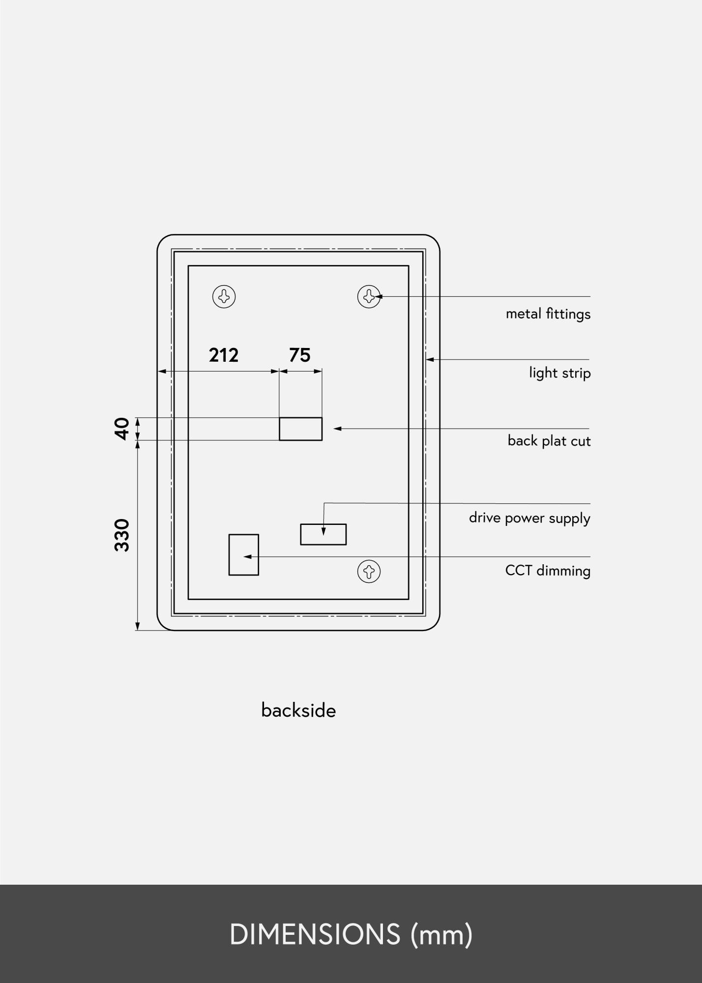 Eleganta oglindă de baie este doar 3cm adâncă și măsoară 50x70 cm. Oglinda de baie are suporturi de perete și poate fi montată atât pe orizontală, cât și pe verticală. Iluminarea LED dimabilă și marginile moi fac ca oglinda să aducă o senzație caldă și moale în încăperea în care este plasată. Oglinda este aprobată pentru băi. Oglinda de baie este destinată instalării fixe și este conectată la un întrerupător. Pentru ca oglinda să funcționeze corect, trebuie să fie conectată la un întrerupător obișnuit, nu la un întrerupător cu dimmer.