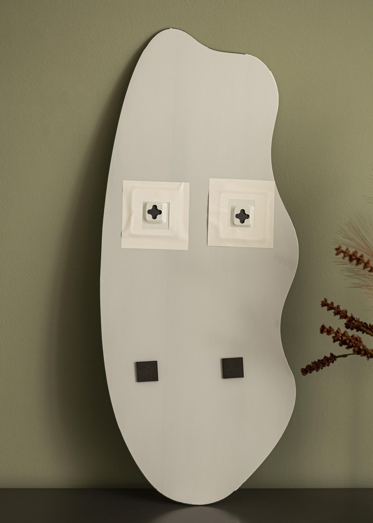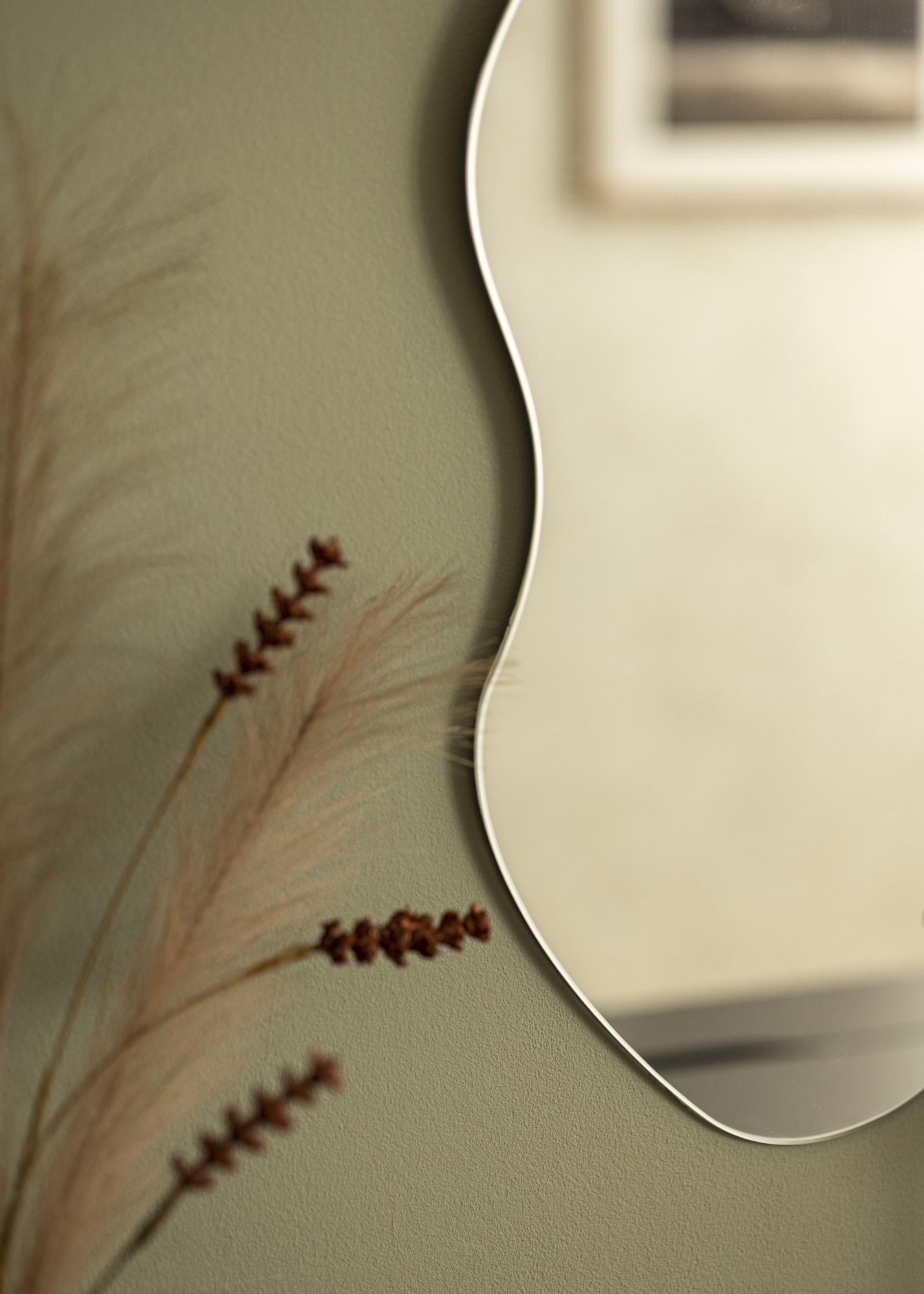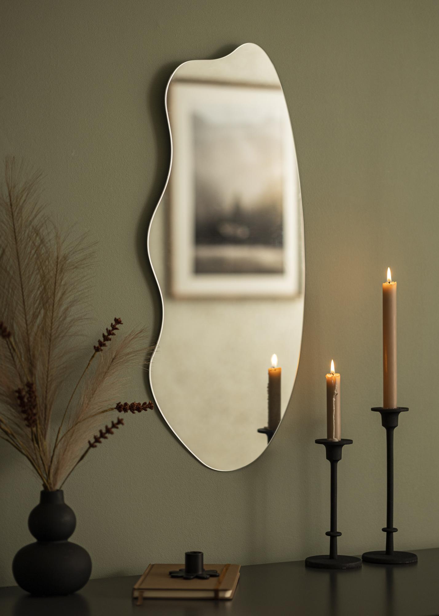 O oglindă de perete asimetrică devine un element decorativ atrăgător în orice casă. Această oglindă are o formă unică, unde o latură lungă este rotunjită, iar cealaltă are o formă ondulată. Împreună formează un ansamblu captivant și elegant. Oglinda se potrivește la fel de bine în hol ca și în sufragerie și funcționează și ca o oglindă de baie la modă.