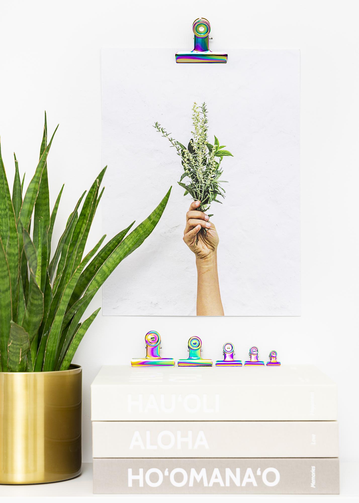 O clemă de metal cu un finisaj lucios în culorile curcubeului, care oferă afișelor și printurilor tale o agățare la modă și puțin diferită. Deschiderea puternică, dar flexibilă, a clemei de afiș îți permite să fixezi hârtia cea mai subțire, precum și afișe cu o grosime ceva mai mare. Și dacă ai un afiș mare pe care dorești să-l agăți, poți folosi doar două cleme de metal. Designul clemei de afiș este elegant și minimalist, iar datorită găurilor din partea rotundă a clemei, o poți monta ușor pe perete cu ajutorul unui mic cui sau șurub.
