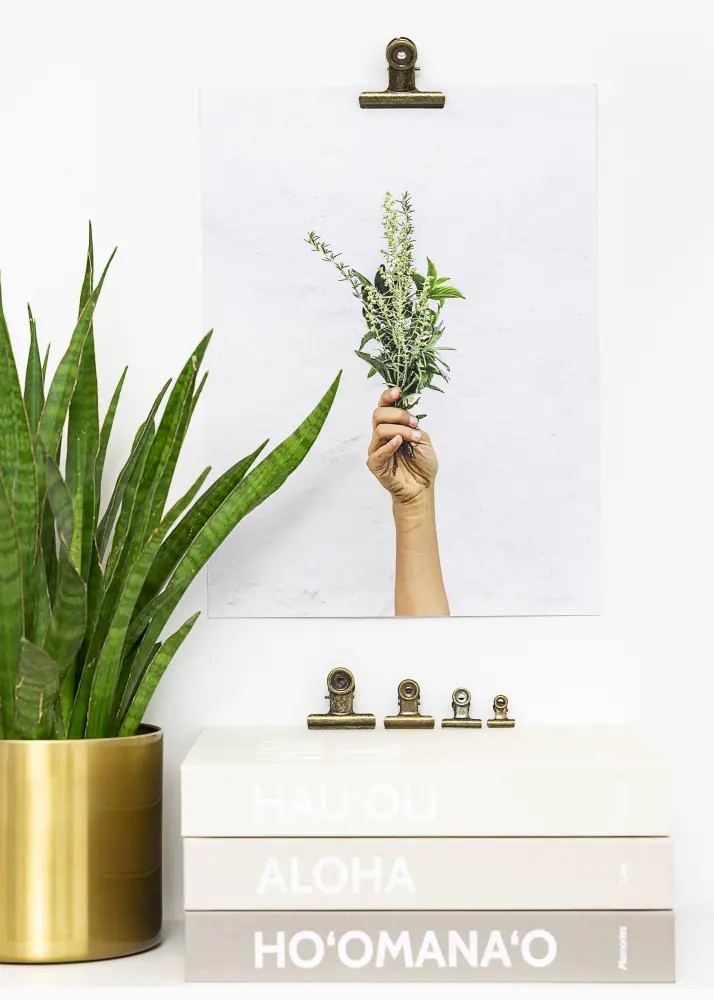 Această clemă stilată din metal îți oferă o modalitate simplă și modernă de a agăța postere și printuri pe perete, în timp ce frumoasa culoare bronz uzată poate, de asemenea, să îți placă dacă îți plac detaliile de interior în stil rustic. Deschiderea clemei are un grip solid, dar flexibil, care îți permite să fixezi atât hârtia subțire, cât și posterele cu grosime puțin mai mare. Dacă ai un poster într-un format puțin mai mare pe care dorești să-l agăți, poți folosi pur și simplu două cleme de metal. Montajul pe peretele tău se face ușor datorită găurilor din partea superioară rotundă elegantă a clemei de postere.