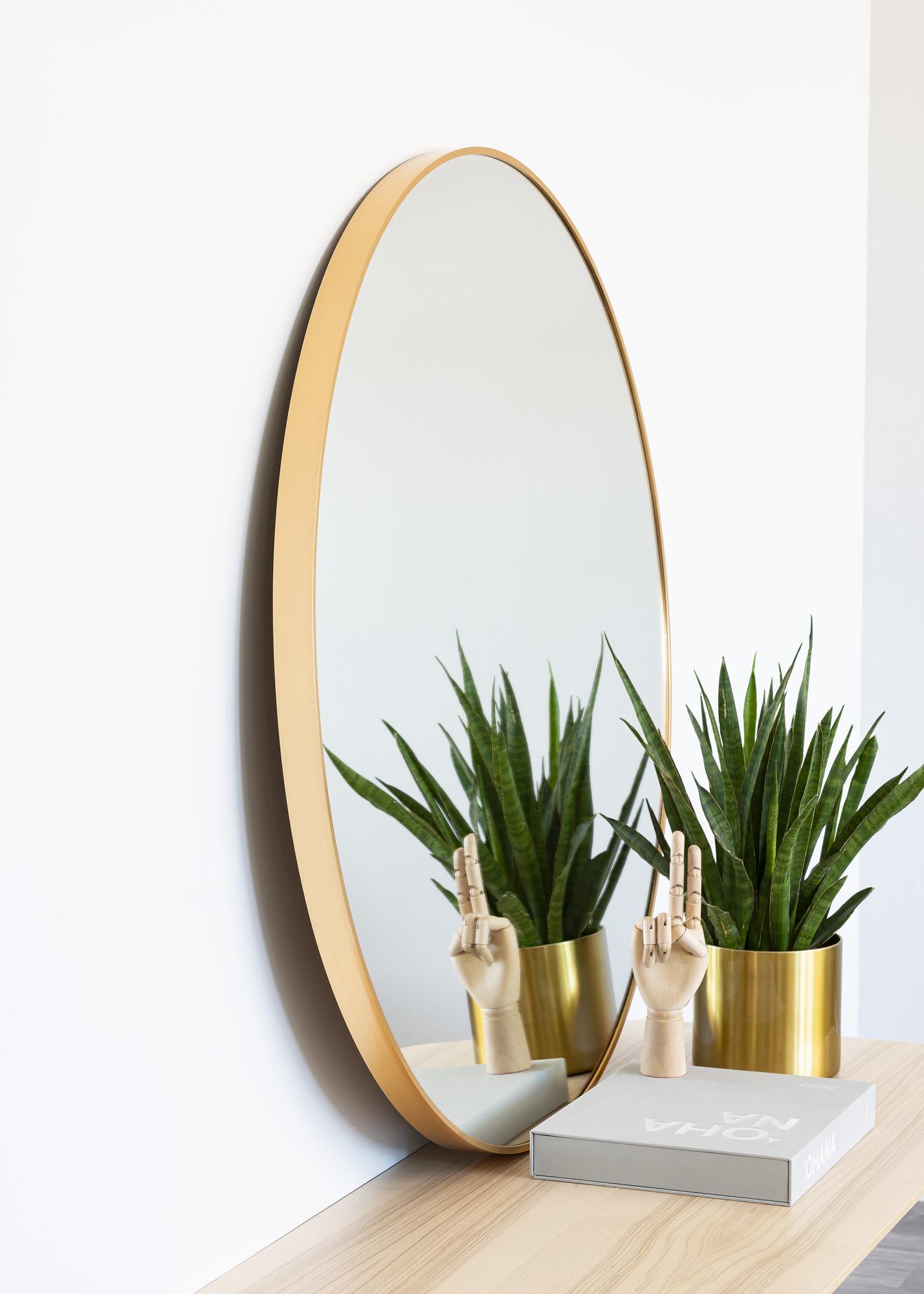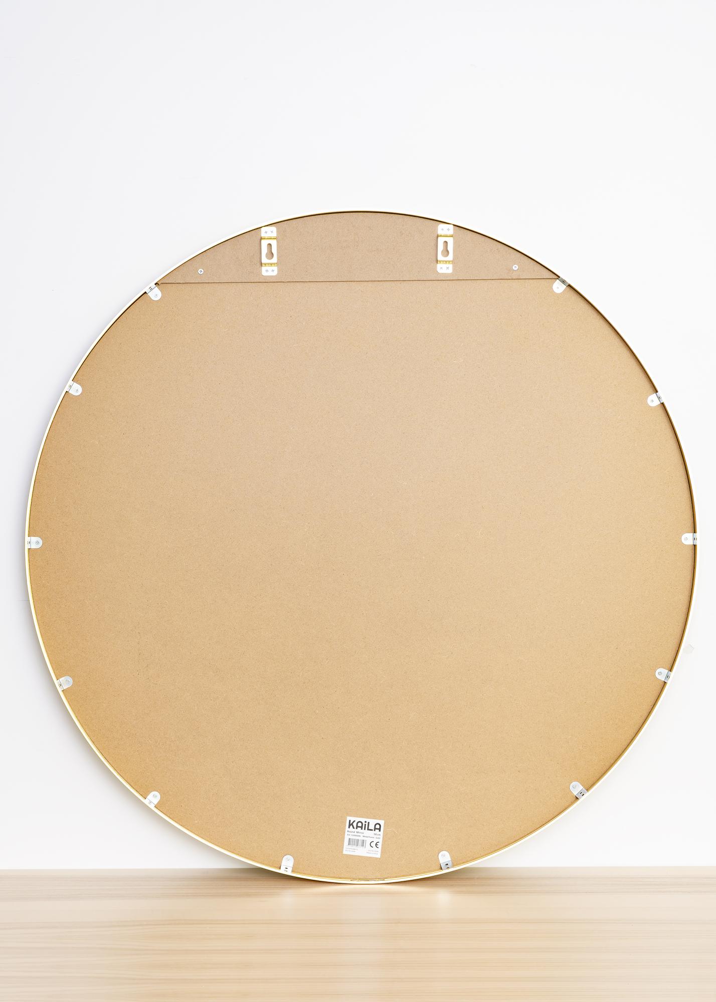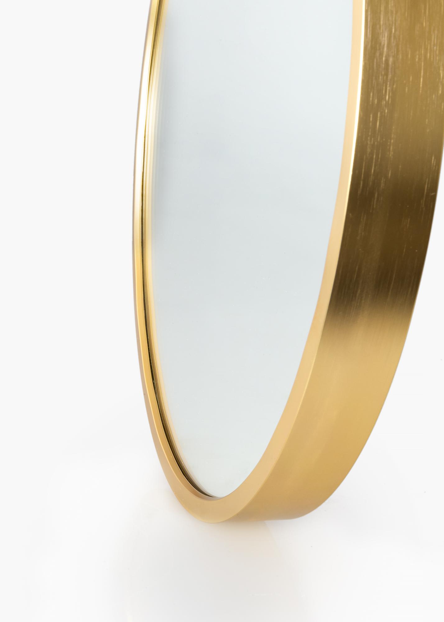 O oglindă rotundă cu un design suedez elegant, cu o ramă metalică într-o frumoasă finisare aurie. Rama are o suprafață periată, care conferă frumoasei culori aurii un aspect puțin mai mat. Rama este, de asemenea, la modă subțire, dar are – în funcție de dimensiune – o adâncime între 30-40 mm, ceea ce face ca aceasta să iasă puțin din perete și să creeze un efect 3D spectaculos. Adâncimea ramei face, de asemenea, că oglinda să pară solidă și robustă, fără a diminua senzația minimalistă a oglinzii.